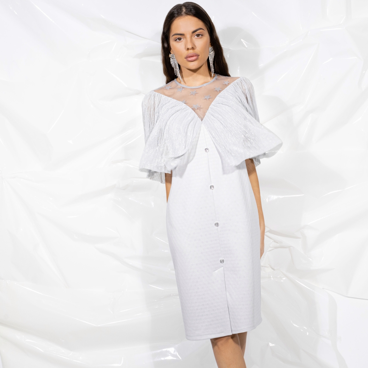 Он позвал тебя в романтическое путешествие, и главное место в твоем чемодане заняло платье CHARUTTI. В таком можно и под венец, и в ресторан на свидание. Он точно оценит твою продуманность. Платье в длине миди с кружевом. Имитация многослойности в верхней части изделия за счет полупрозрачного волана из сетки. Приталенный силуэт, декорастивные пуговицы по передней части изделия. Платье застегивается на миниатюрную пуговицу на спинке.
