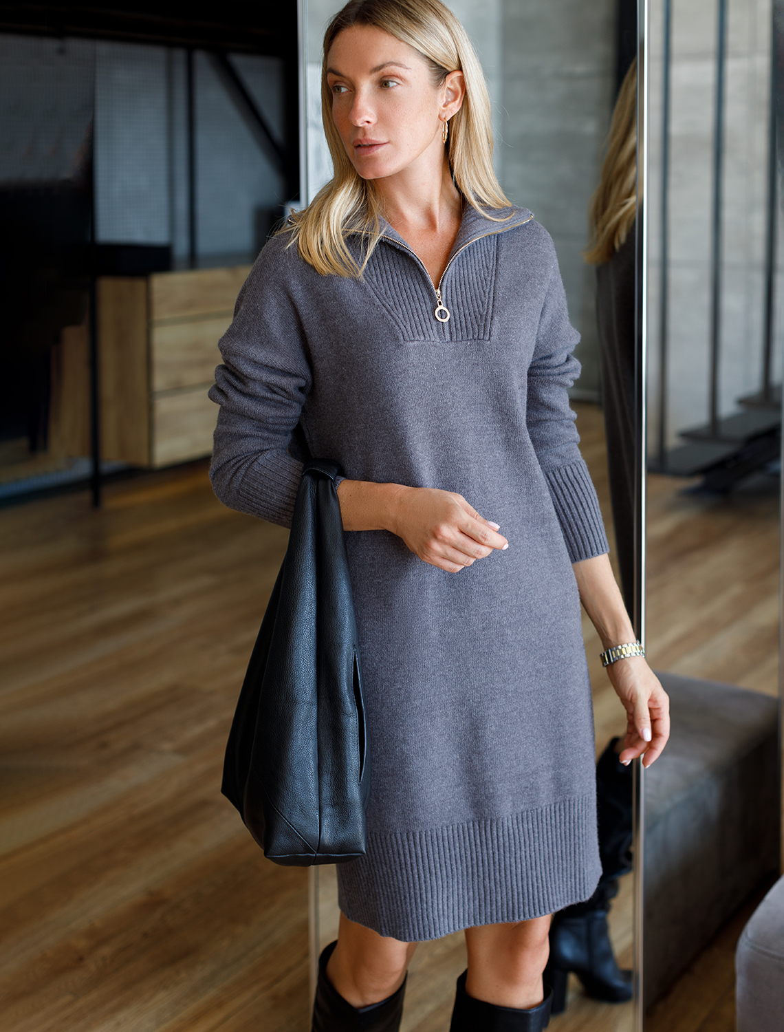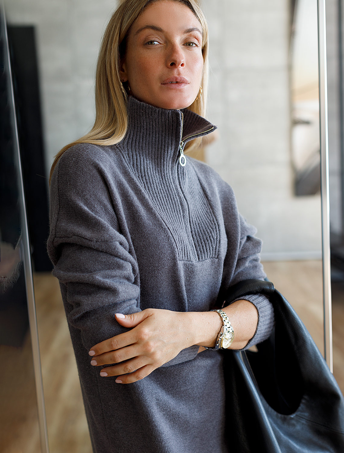 Платье с воротом на молнии выполнено из мягкой пряжи с кашемиром. Высокий ворот регулируется молнией с золотистой фурнитурой. Модель со спущенным плечом легко впишется в расслабленный осенний гардероб с высокими сапогами. серый меланж