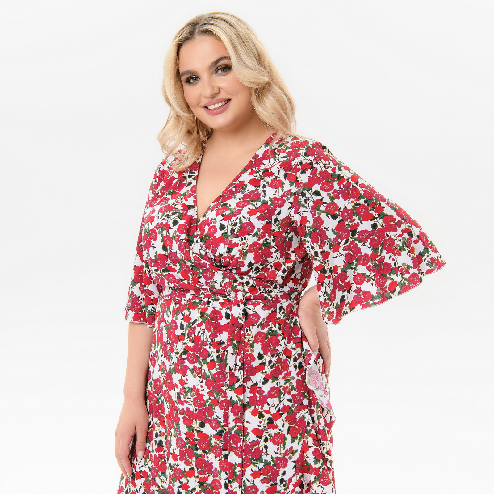 Платье с запАхом и воланом по юбке, штапель, принт "розовый сад"