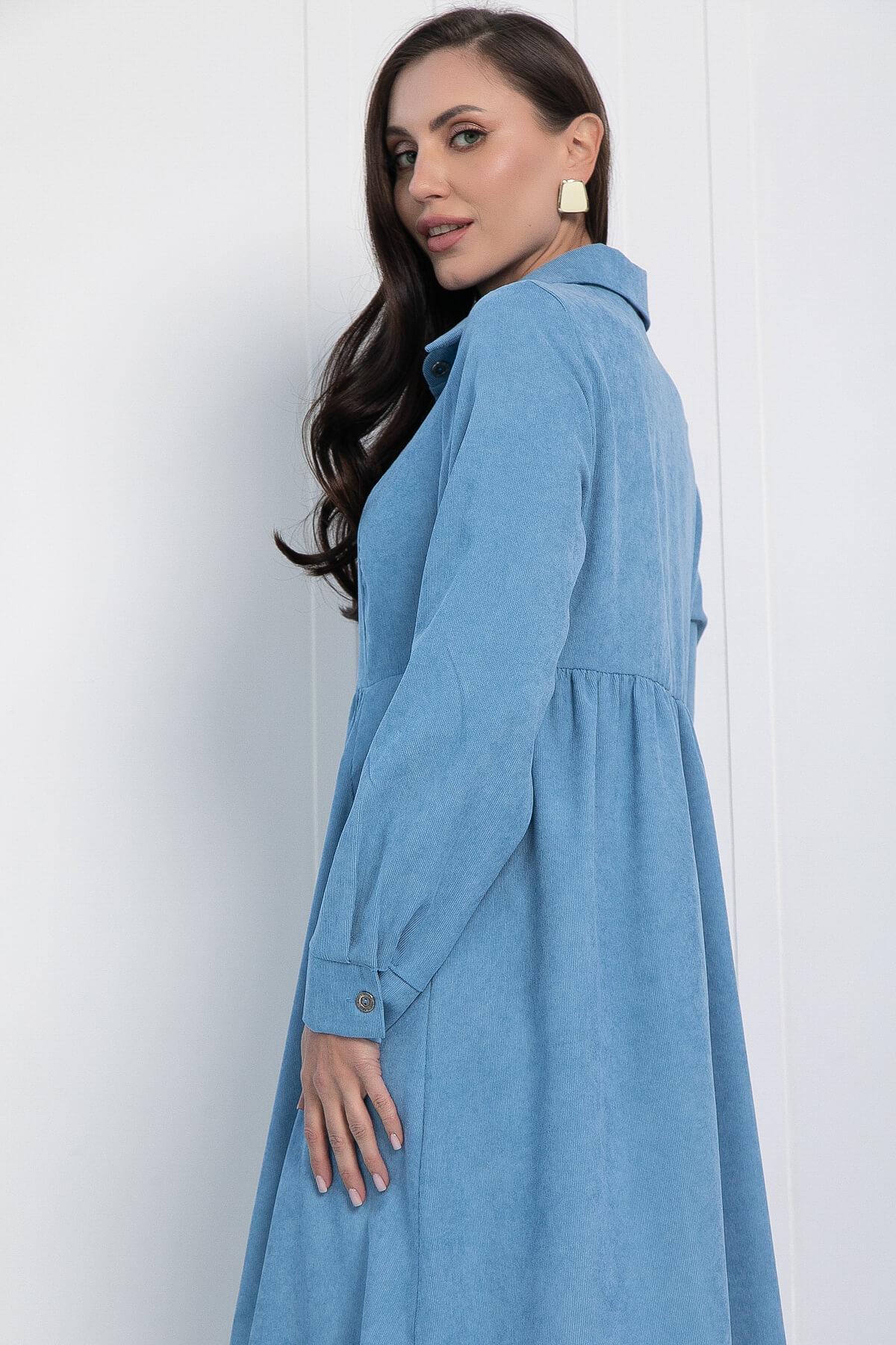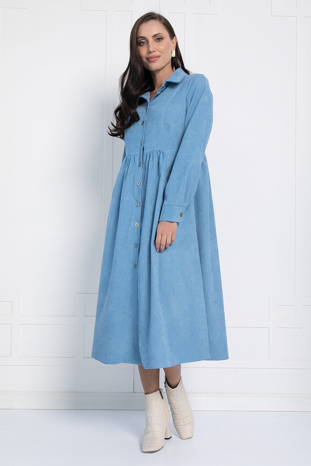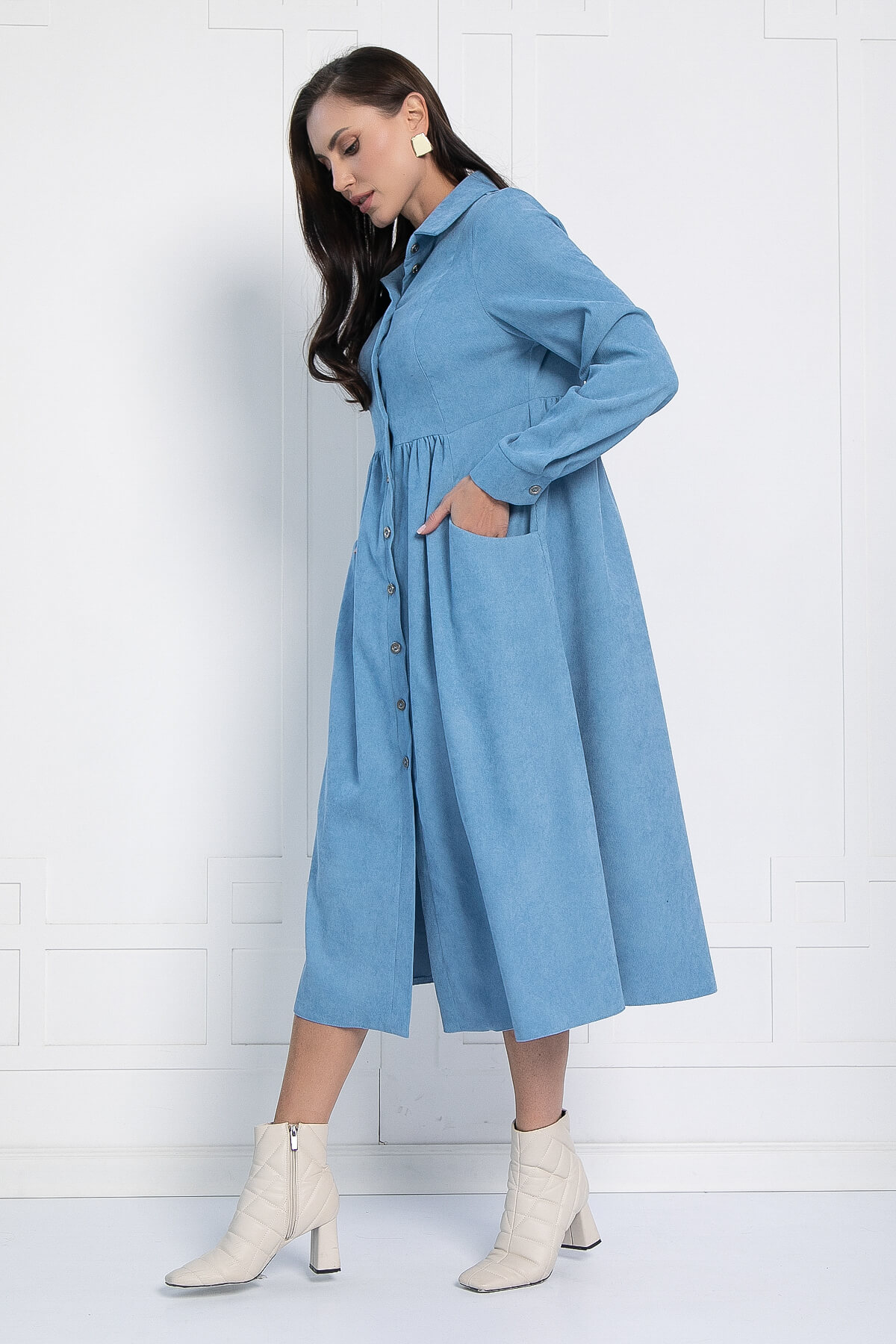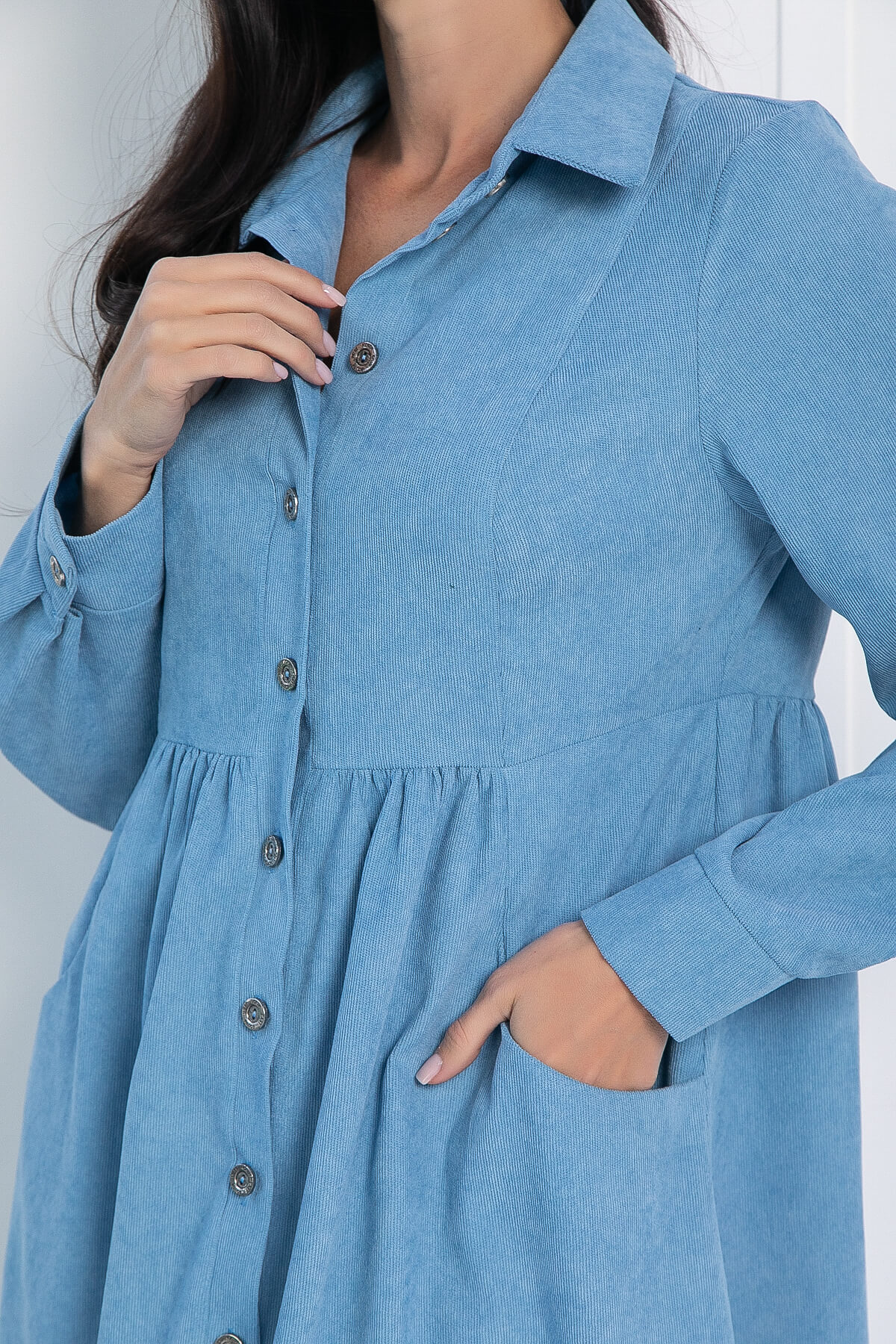 Платье-рубашка из вельвета — это прекрасный вариант для создания повседневных образов. Оно выполнено с воротником и рукавами рубашечного типа, что придаёт ему элегантный вид. Пуговицы на планке и карманы с акцентом добавляют функциональности и стиля. Завышенная талия и присобранная юбка создают очаровательный силуэт.