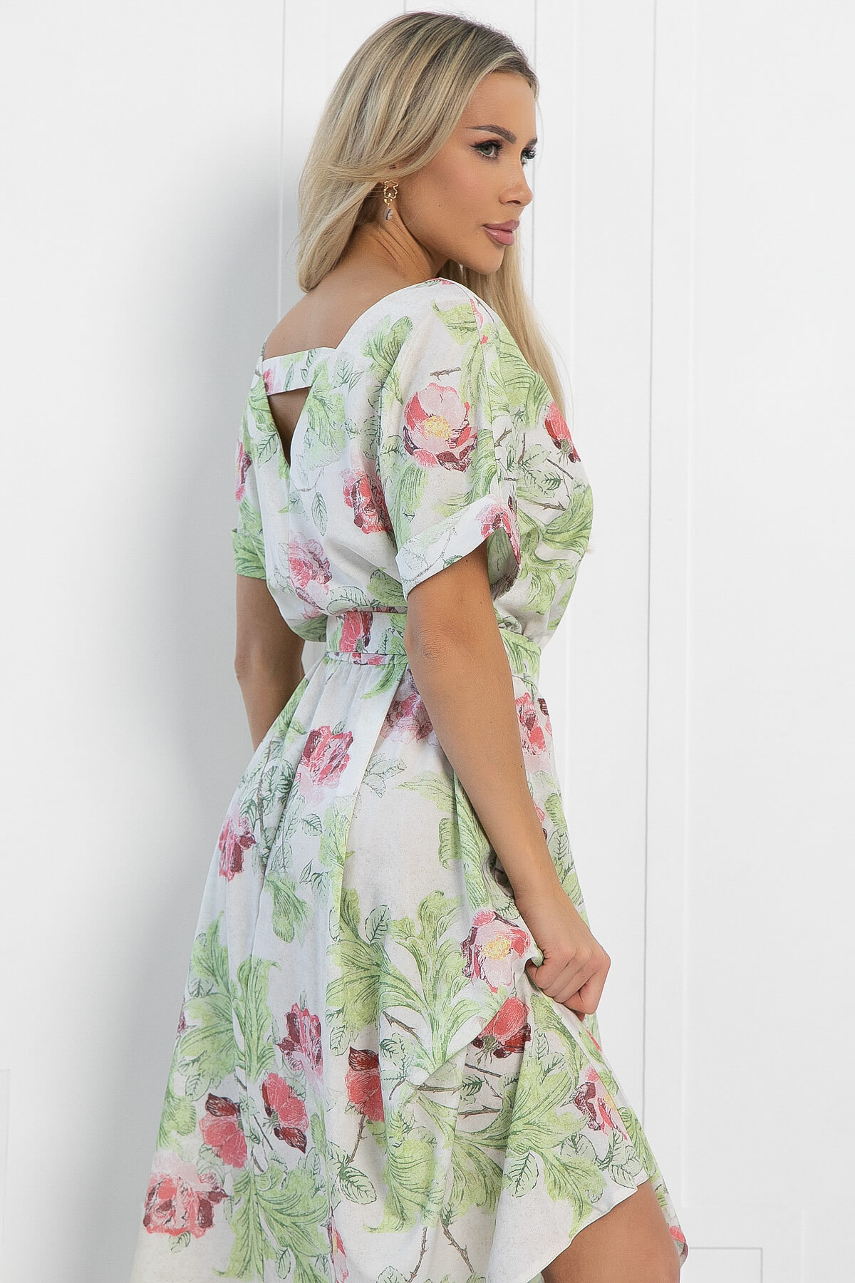 Элегантное платье с цветочным принтом — идеальный выбор для создания нежного и романтичного образа! Спущенные рукава придают ему легкость и романтичность, а V-образный вырез сзади с планкой добавляет изюминку. Платье по талии на резинке. В комплект входит пояс из основной ткани, который станет отличным завершающим штрихом к вашему образу. Это платье будет уместно как на вечерней прогулке, так и на праздничном мероприятии.