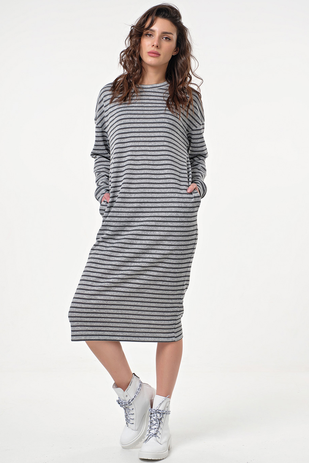 • Особенности:Платье из трикотажа в полоску. Детали: горловина округлой формы, спущенный втачной рукав на манжете, карманы в боковых швах.