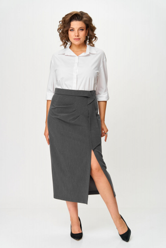 Платье женское полуприлегающего силуэта расширенное к низу, выполнено в комплектации из двух предметов. Верхнее платье –из мягкого эластичного материала, с высокими разрезами по переду, спинке и бокам, с втачным рукавом ¾. По линии груди вытачки. По левой части переда съемный цветок.