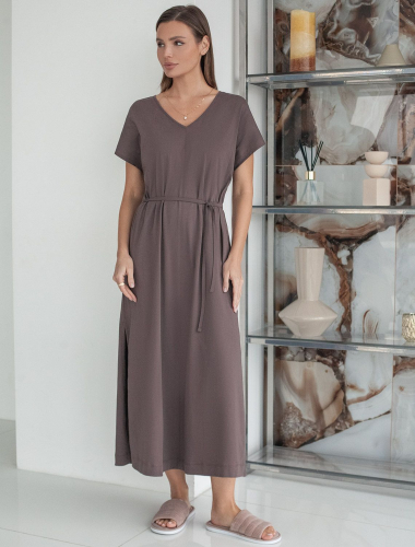 Платье свободное с V-вырезом из 100% хлопка с поясом и разрезом D42.122 кофейный