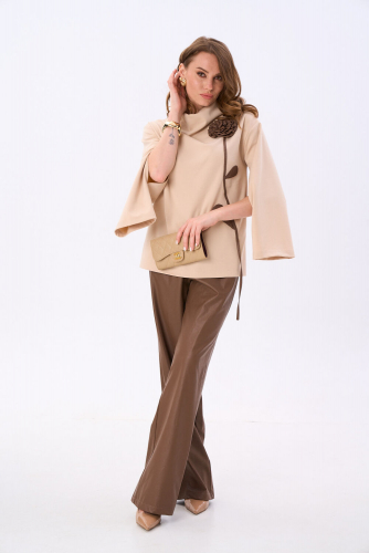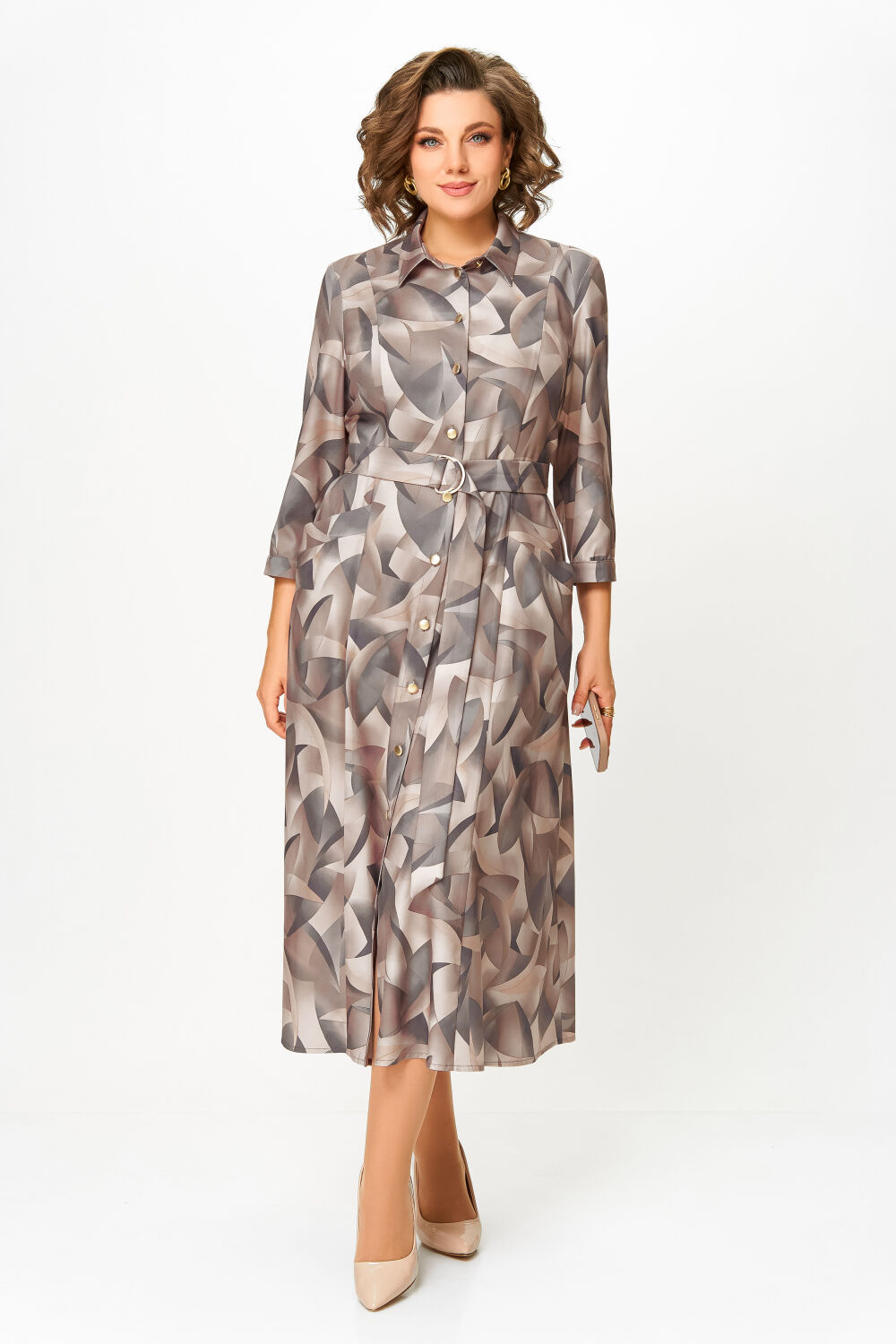 Платье из мягкой вискозной ткани отрезное по линии талии с полуприлегающим лифом и юбкой А-силуэта, с центральной застёжкой на петли и декоративные пуговицы. Полочка с вертикальными рельефами, спинка с кокеткой и отрезными бочками. Юбка состоит из семи клиньев. По переду между швами обработан карман с планкой на косую. Воротник отложной рубашечного типа, с отрезной стойкой. Рукав втачной, одношовный длиной ¾, внизу с манжетой, которая застёгивается на петлю и пуговицу. Платье комплектуется поясом из основной ткани, с декоративными полукольцами.