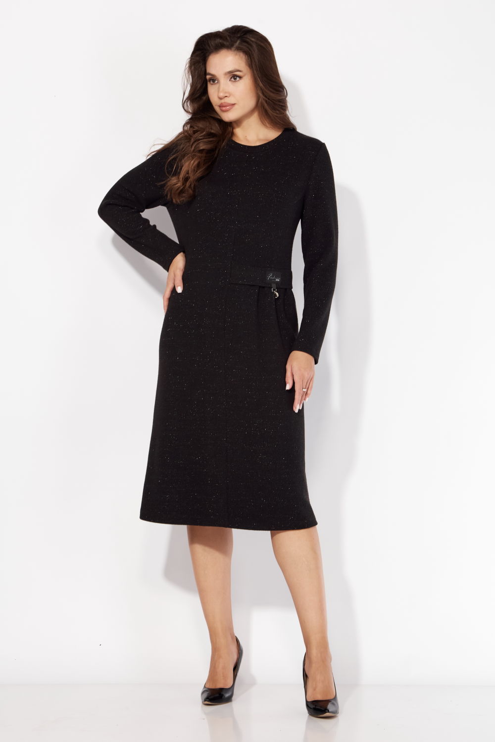Платье женское, А-образного силуэта, с длинным втачным рукавом. Перед платья с центральным швом. На левой стороне платья подрез по линии талии и мягкая сборка. Подрез акцентирован мягкой, отлетной планкой с декоративной нашивкой и украшением. Вырез горловины круглой формы с подрезной бейкой. По спинке средний шов.