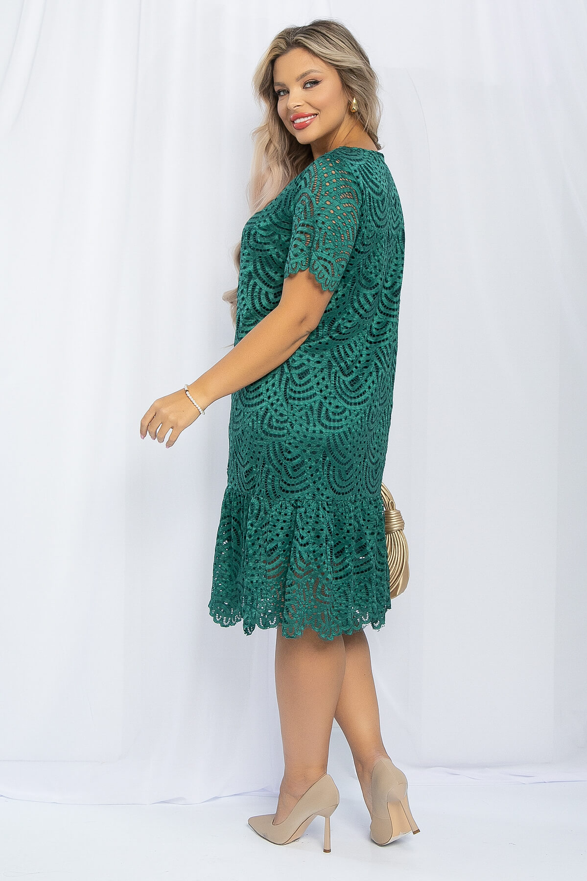 Кружевное женское платье в зеленом оттенке — это воплощение утончённости и романтики, идеально подходящее для торжественных мероприятий! Длина миди и изысканная кружевная текстура создают элегантный образ, а подкладка добавляет комфорта и делает платье еще более привлекательным. Воланы по низу придают платью лёгкость и воздушность. Дополните его аксессуарами и лаконичными туфлями, чтобы завершить свой образ. Это платье станет настоящим акцентом вашего гардероба!