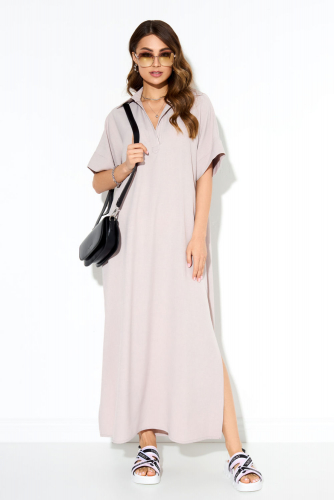 Платье прямого силуэта слегка расширенное к низу, с высокими разрезами по бокам. Рукав на спущенной пройме на манжете.  Карманы в боковых швах. Воротник на стойке, планка по переду. Платье без подкладки.