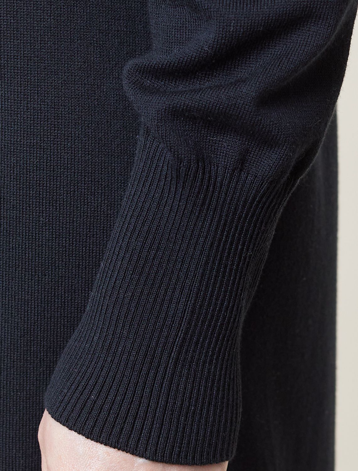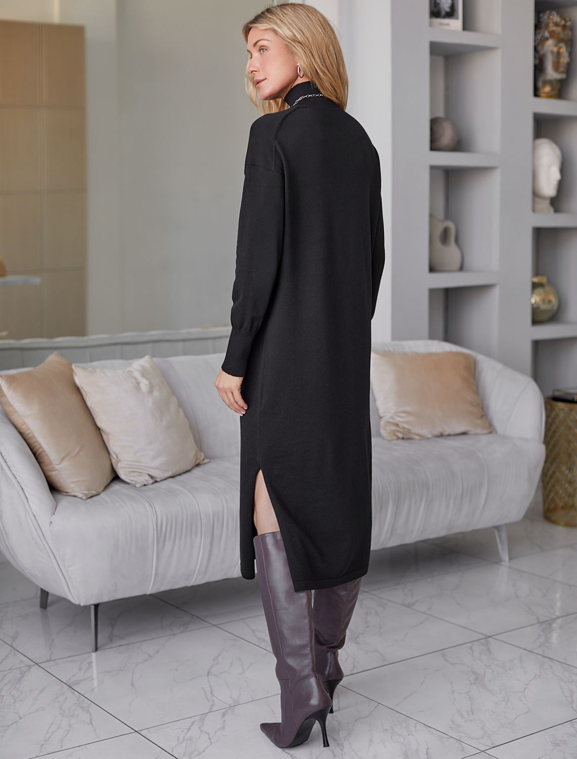 Платье тонкой вязки выполнено из хлопка. Лаконичная модель с высоким воротом дополнена манжетами и разрезами по бокам. Изделие свободно сидит по фигуре и не сковывает движений. Мягкая пряжа очень приятная к телу не колется и сохраняет тепло при этом не перегревая. Изделие дополнено металлическим логотипом бренда. черный