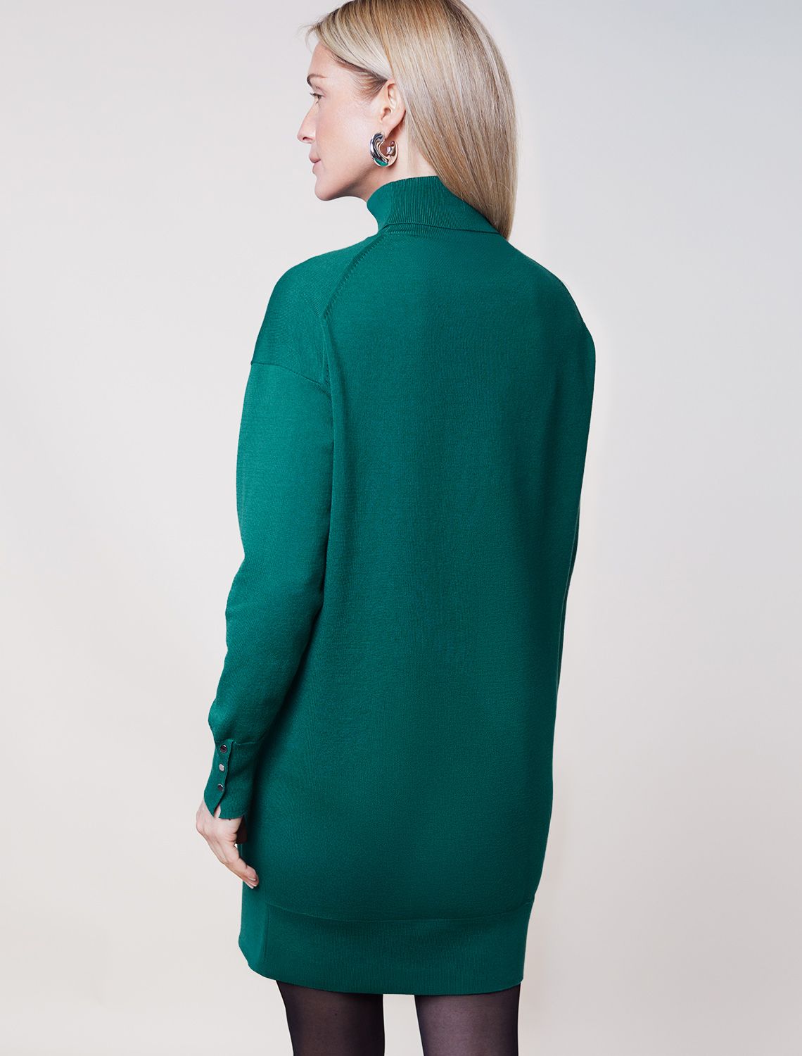 Платье тонкой вязки выполнено из хлопка. Лаконичная модель с высоким воротом как у водолазки дополнена манжетами с золотистыми пуговицами. Изделие свободно сидит по фигуре и не сковывает движений. Мягкая пряжа очень приятная к телу не колется и сохраняет тепло при этом не перегревая. зеленый
