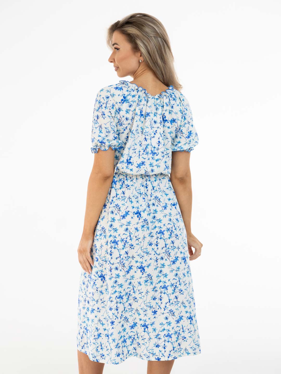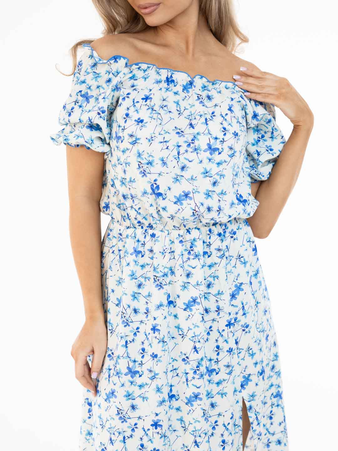 Платье женское с резинкой по горловине и талии, рукав фонарик, юбка с высоким разрезом по ноге, длиной миди. Женское платье из штапеля незаменимо в летнее, весеннее и осеннее время года. Такая модель смотрится прекрасно на любой фигуре, скрывает недостатки и подчеркивая талию. Платье легко комбинируется с любой другой одеждой: косухой, джинсовкой, тренчем.