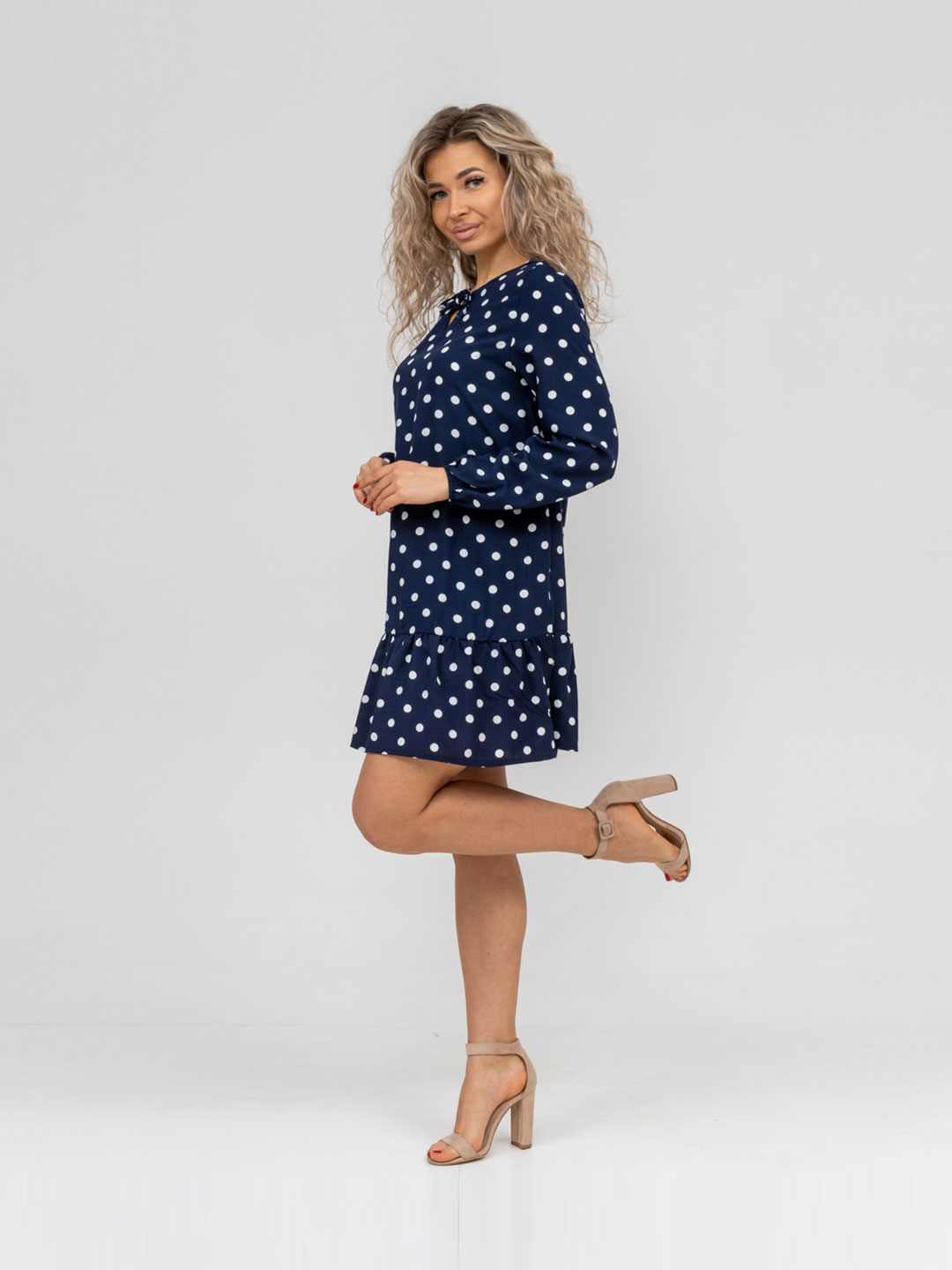 Женское платье из легкой ткани, свободного силуэта с воланом по низу изделия, длинным рукавом, округлой горловиной с завязками. Наше платье отлично будет смотреться как с кедами и сумкой кросс-боди, так и с туфлями на каблуке и широким ремнем.