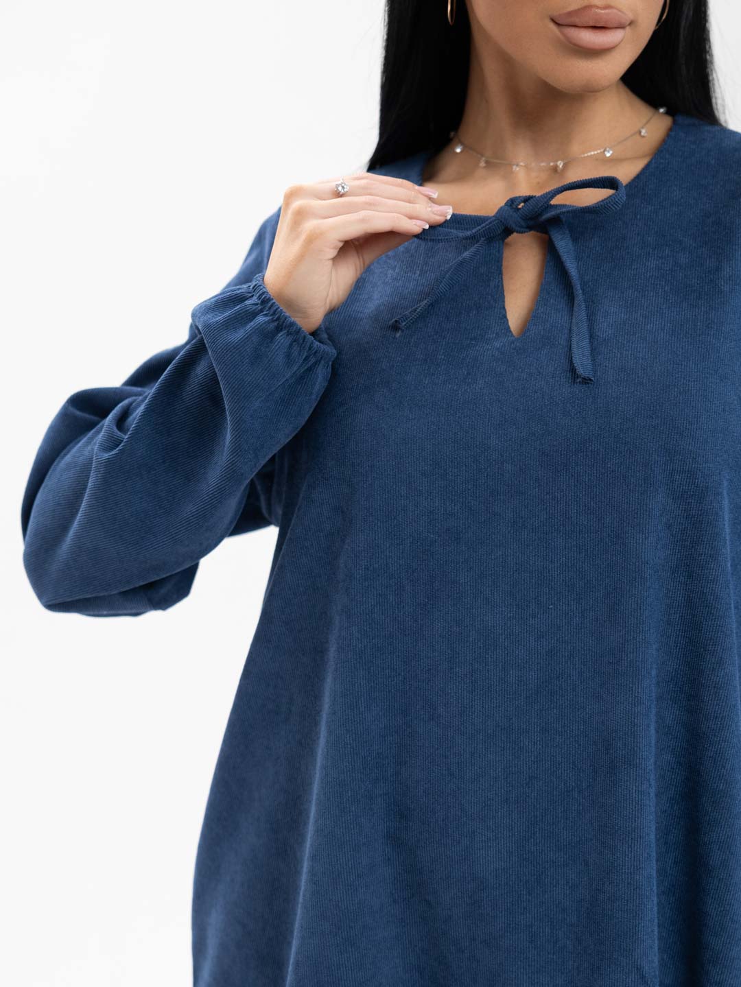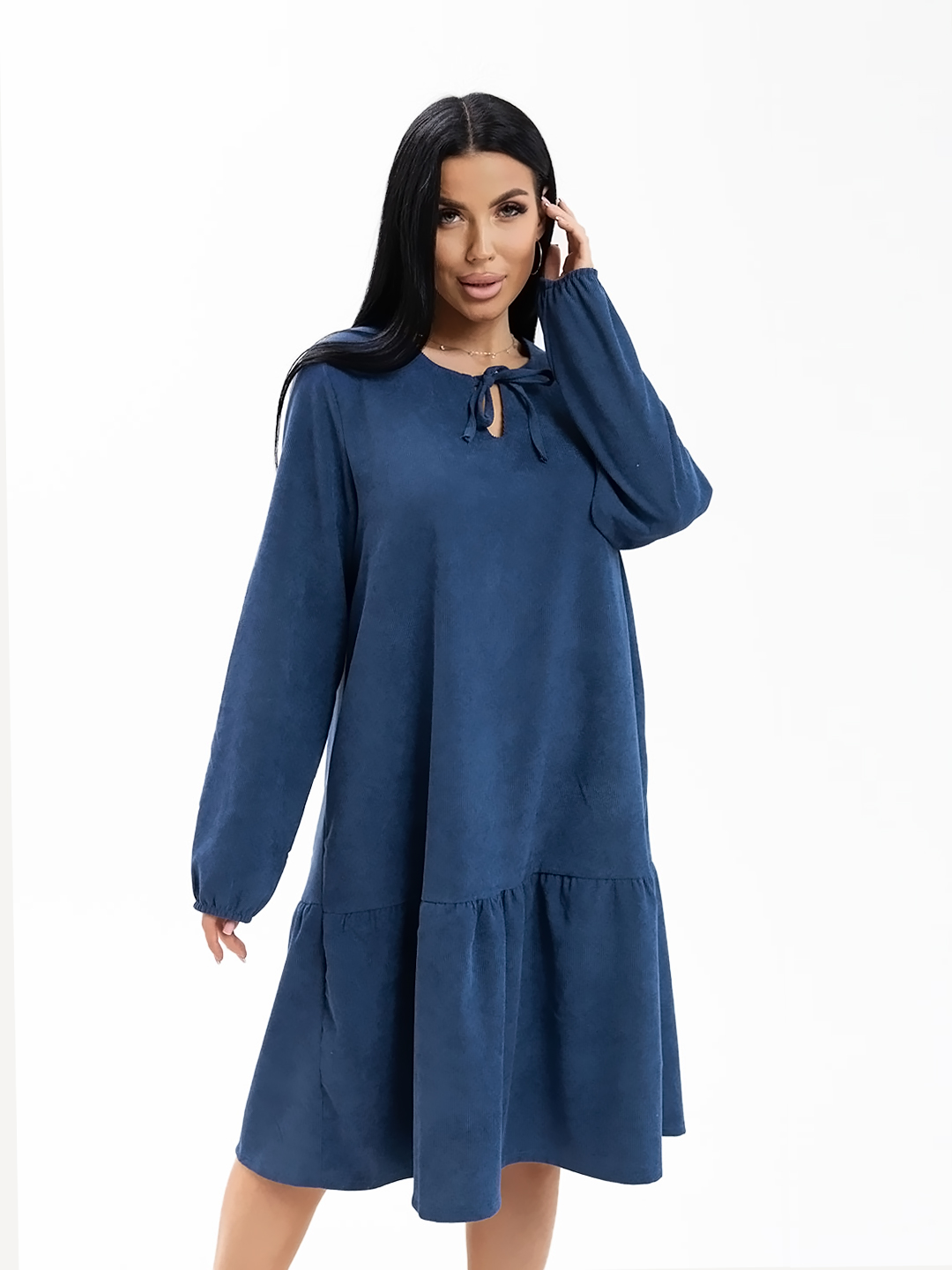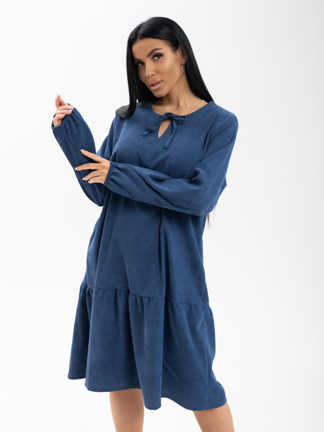 Платье женское, длиной чуть ниже уровня колена, выполненное из мягкого, приятного к телу материала - микровельвет. Модель с удлиненным втачным рукавом на манжете и округлой горловиной с завязками. Юбка - волан по низу изделия.