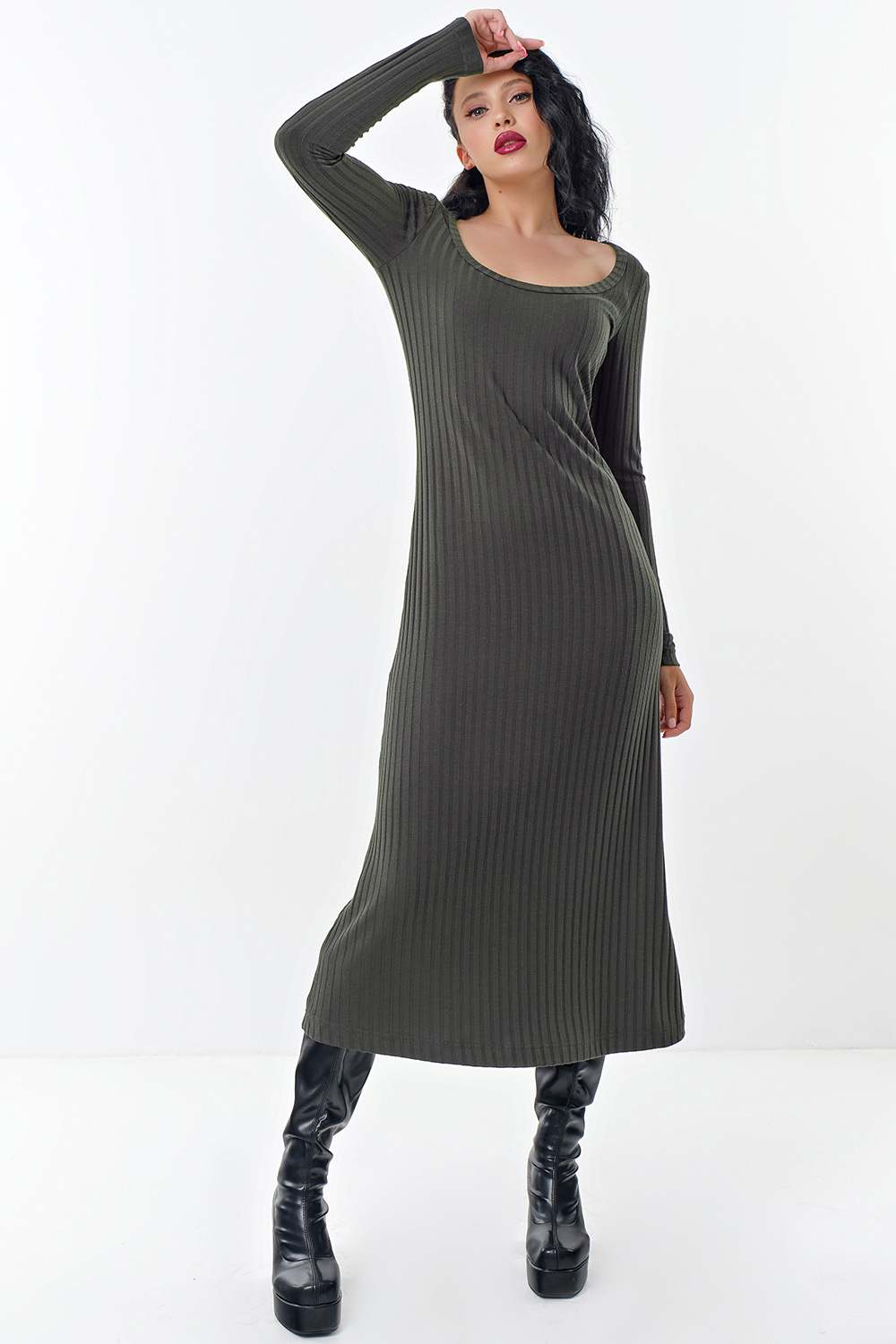 • Особенности:Платье прилегающего силуэта из трикотажа "лапша". Детали: углубленный вырез обработан широкой окантовкой, расклешенная юбка. Без застежки.