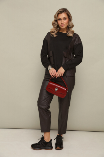 Платье прилегающего силуэта, длиной миди, выполненное из плательной поливискозы. Платье жакетного типа с ассиметричным передом. Одна из сторон переда имитирует жакет и юбку, другая-платье. Перед с талиевыми вытачками с подрезом. В области груди настрочена декоративная листочка, в области бедер - карманы-обманки с листочками и клапаном. По переду обработан разрез. В области талии расположена застёжка на 2 петли и крупные декоративные пуговицы. Спинка  со средним швом, в который вставлена потайная молния. Рукав 2-х шовный втачной, длиной 3/4.
