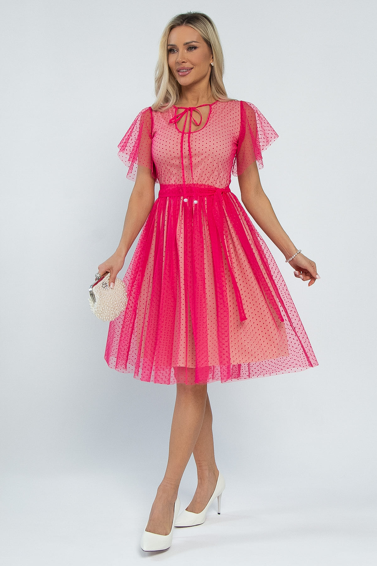 Летящее женственное платье, создающее романтичный и нежный образ. Эта модель идеально впишется в атмосферу любого события. Будь то встреча с подружками, свидание с любимым или корпоратив. Платье свободного кроя, рукав «крылышко». Талия на резинке. Спереди по горловине оформлена капелька с завязками и украшена декоративными бусинами-жемчужинами. Есть съёмный пояс в комплекте.