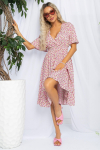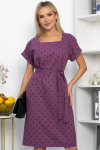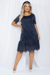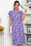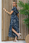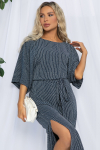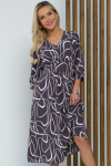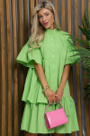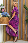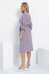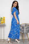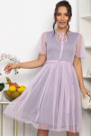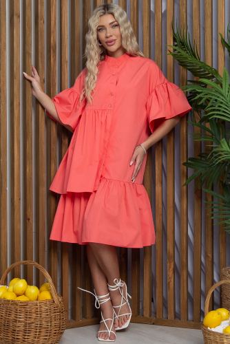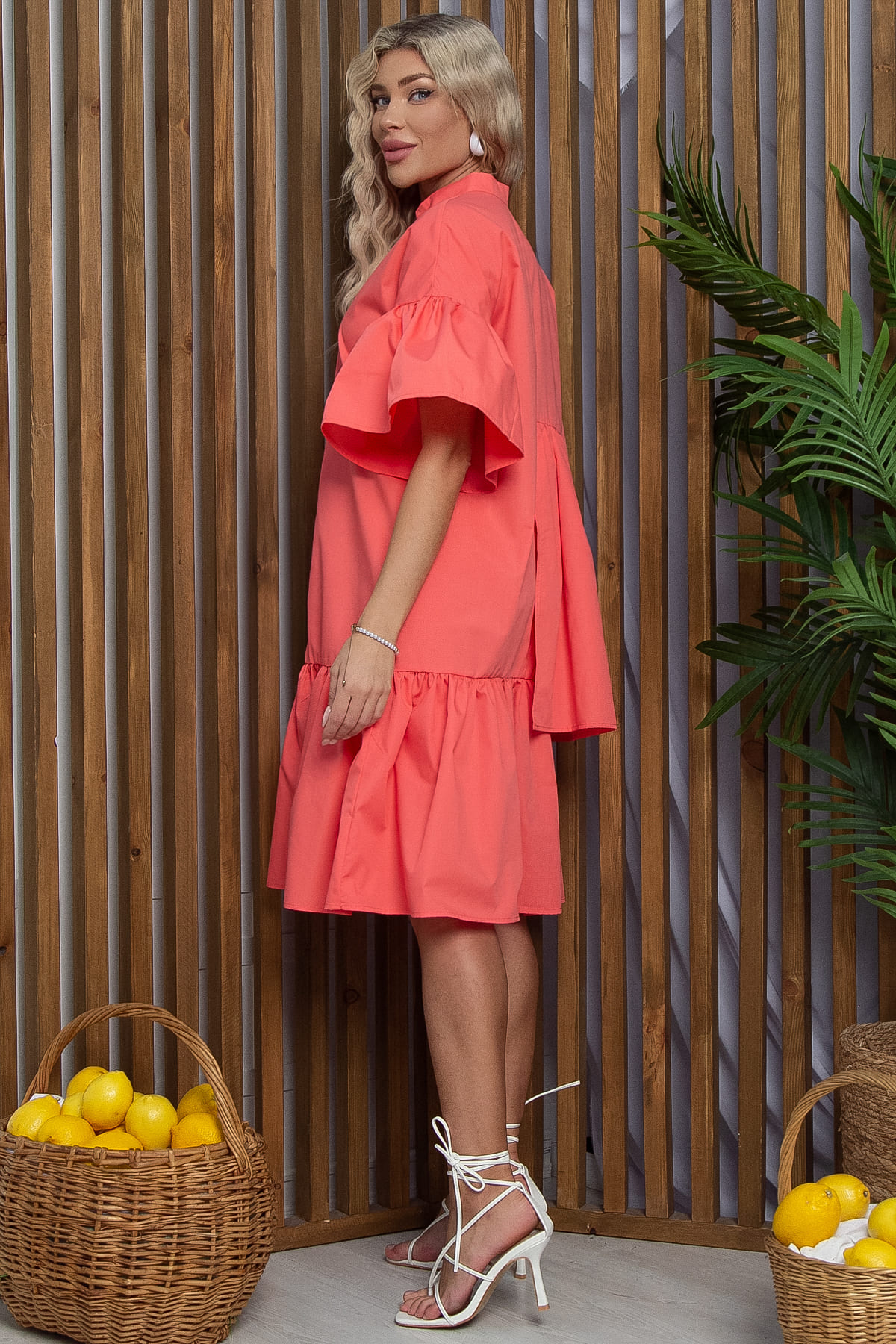 Ассиметричное воздушное платье свободного силуэта. На правой полочке и левой половинке спинки – подрез, расположенный выше линии талии. В шов подреза вставлена декоративная отлетная оборка, переходящая с полочки на спинку. По полочке — центральная бортовая застежка на петли и пуговицы. Воротник – стойка. Линия плеча спущена. К пройме пришита широкая воздушная оборка. По низу платья по кругу проходит воздушная широкая оборка.
