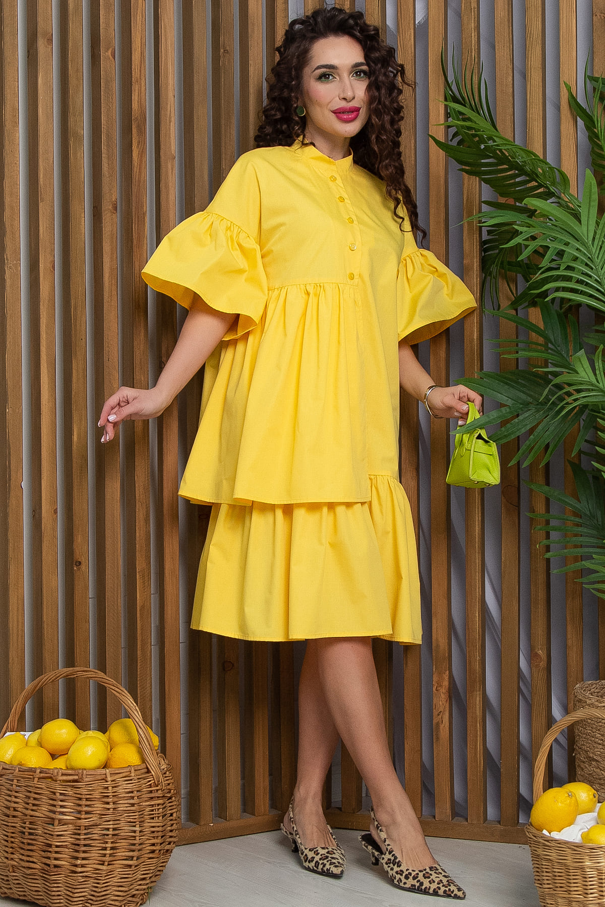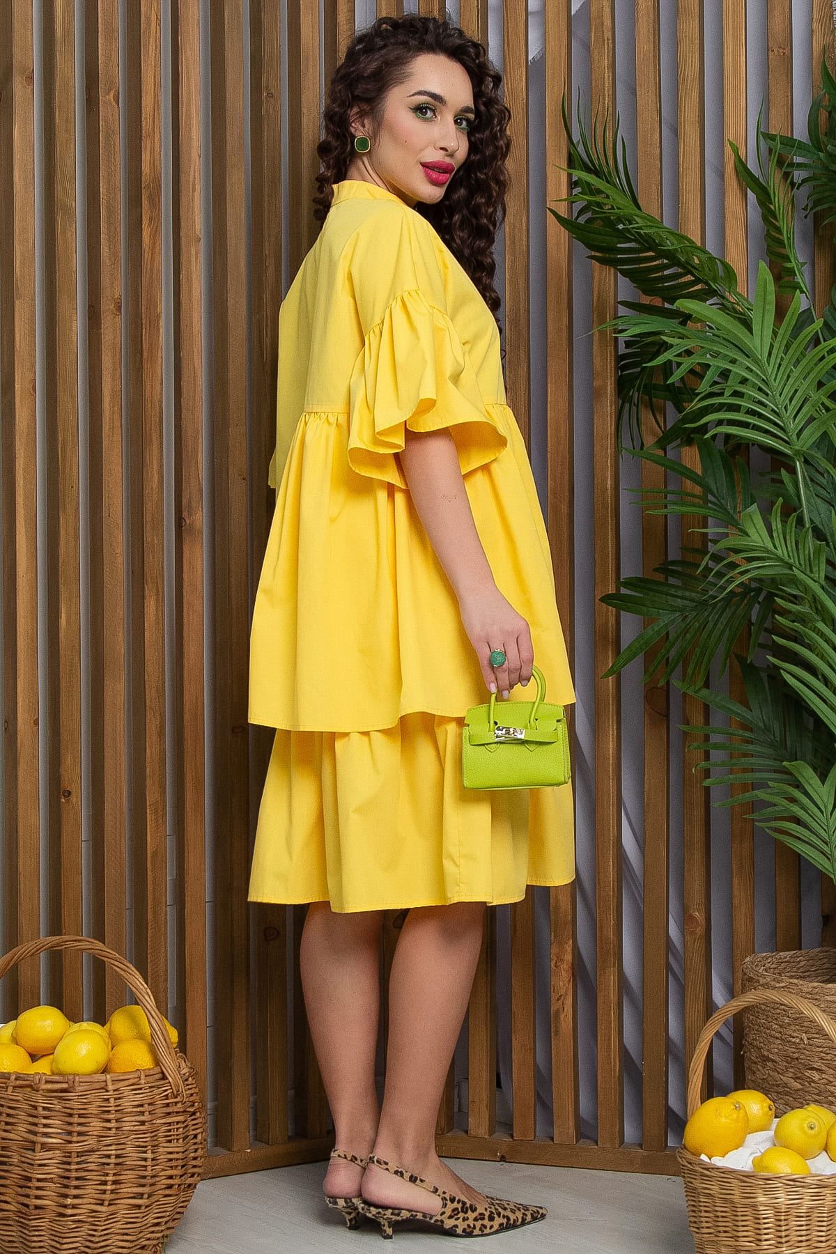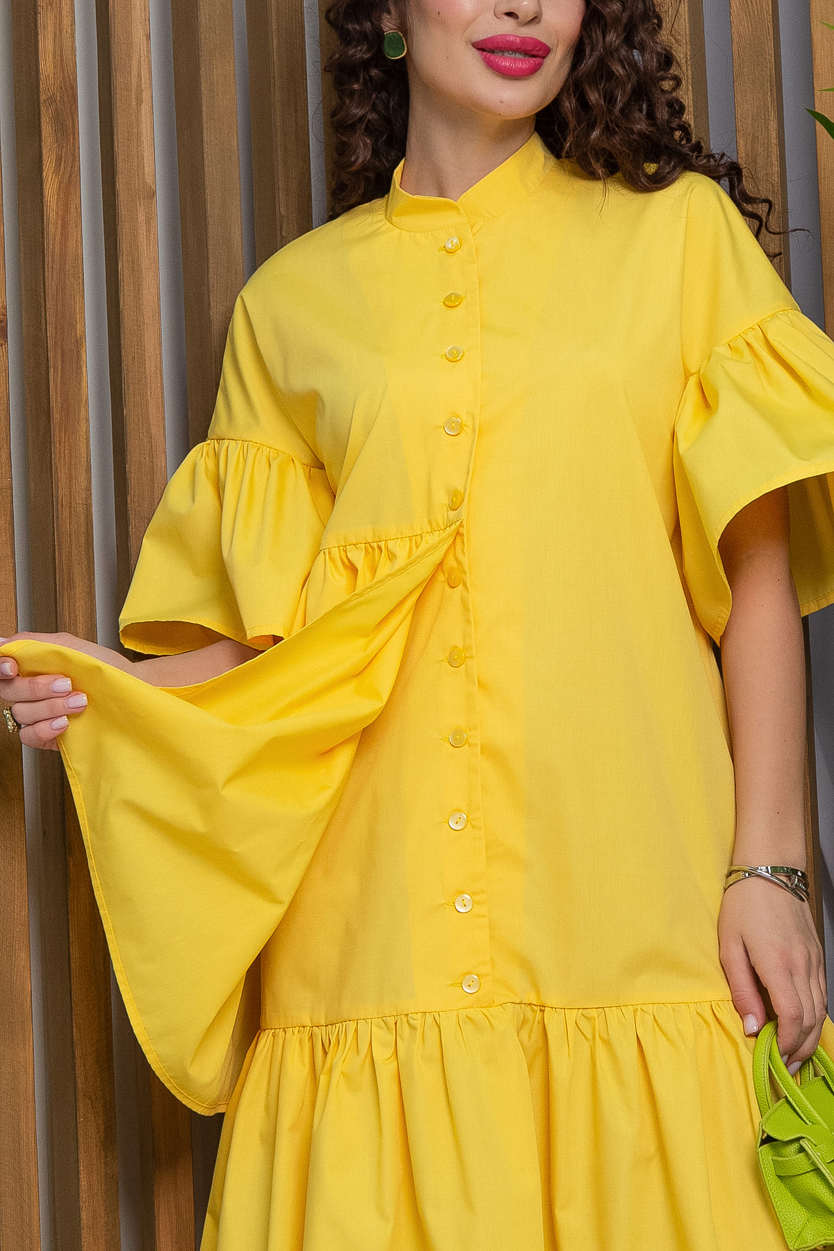 Ассиметричное воздушное платье свободного силуэта. На правой полочке и левой половинке спинки – подрез, расположенный выше линии талии. В шов подреза вставлена декоративная отлетная оборка, переходящая с полочки на спинку. По полочке — центральная бортовая застежка на петли и пуговицы. Воротник – стойка. Линия плеча спущена. К пройме пришита широкая воздушная оборка. По низу платья по кругу проходит воздушная широкая оборка.