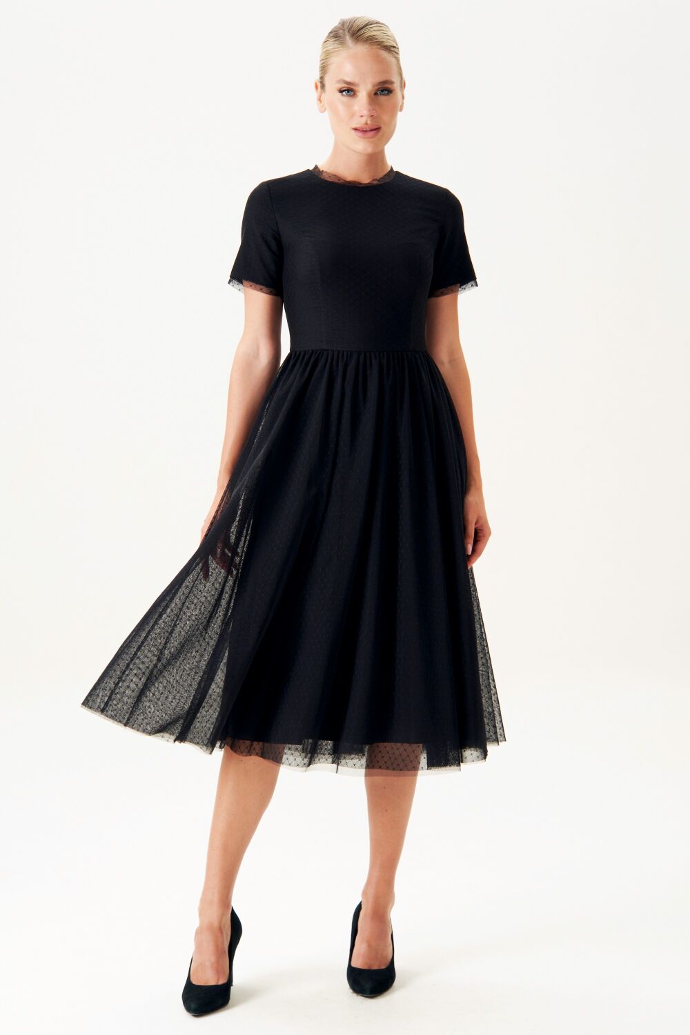 Представляем вашему вниманию роскошное черное фатиновое платье, воплощающее в себе идеальный баланс между элегантностью и чувственностью. Изготовленное легкого фатина, это платье создает невесомый, воздушный образ, который непременно притянет к себе восхищенные взгляды. Ощущайте себя уверенно и привлекательно в этом платье, притягивая восторженные взгляды окружающих. Платье женское многослойное, с притачной по горловине и низу рукава узкой отделочной деталью из сетки, силуэта песочные часы, отрезное по линии талии, длиной миди. Верхний слой платья из отделочного материала - сетка, нижний слой - легкая плательная ткань. Верхняя часть переда и спинки (лиф) с рельефами, выходящими из проймы и идущими до линии талии. Нижняя часть платья (юбка) многослойная, расклешенная книзу. Верхний слой юбки состоит из двух слоев сетки. В шве притачивания юбки к лифу - сборка. Спинка платья со средним швом, в котором обработана застежка на потайную тесьму-молнию. Рукава втачные одношовные, короткие. Горловина круглой формы обтачная. Это платье идеально сочетается с жакетом 22-507-1. Длина по среднему шву спинки до талии - 38,0 см (±1,0 см), Длина по среднему шву спинки до низа - 81,0 см (±3,0 см), Длина рукава - 20,0 см (±1,0 см). Тип ткани на платье: плательно-блузочная.