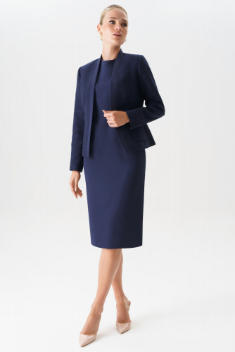 Длина платья по среднему шву спинки – 117,0 см (±2,0 см), Длина платья по среднему шву спинки (до линии талии) – 37,5 см (±2,0 см), Ширина на уровне глубины проймы – 50,0 см (±1,0 см), Ширина на уровне линии талии – 43,5 см (±1,0 см), Ширина на уровне линии бедра – 68,0 см (±1,0 см), Длина рукава – 19,0 см (±1,0 см), Ширина рукава внизу – 18,3 см (±1,0 см), Длина плеча жакета – 10,2 см (±0,5 см).