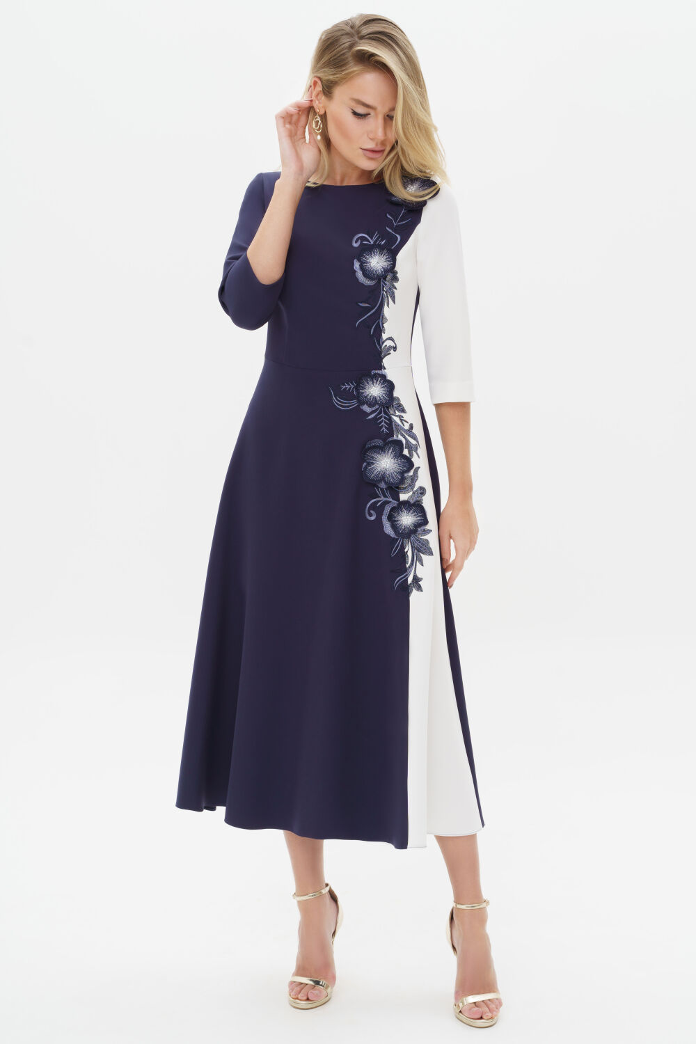 Изящное платье с цветочной вышивкой сочетает в себе легкость и женственность, основой для которого послужили две гармонирующие друг с другом ткани.