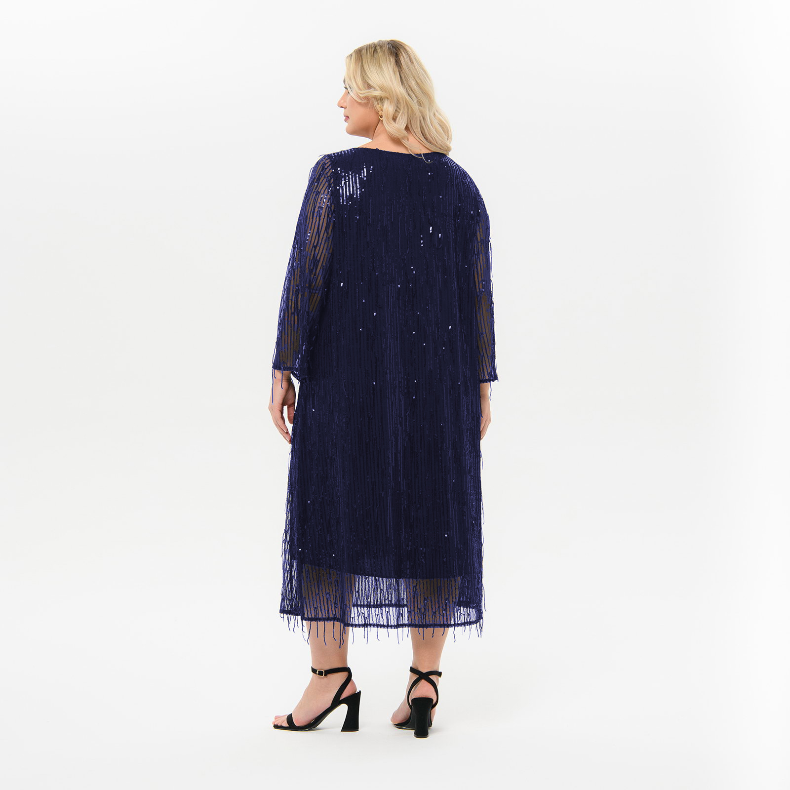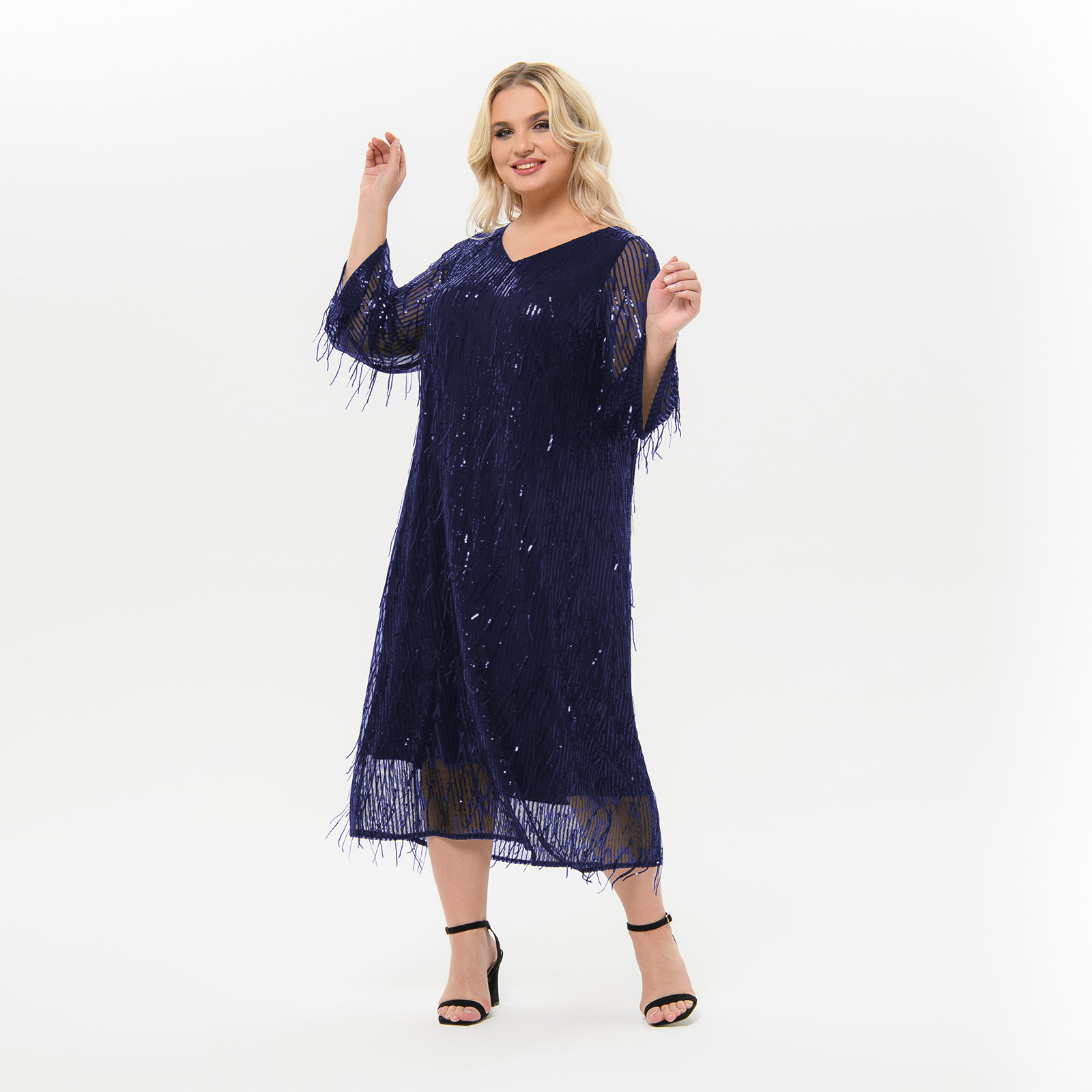Темно-синий Платье вечернее, А-силуэта, свободное, из эластичной сетки, расшитой пайетками, на подкладке.