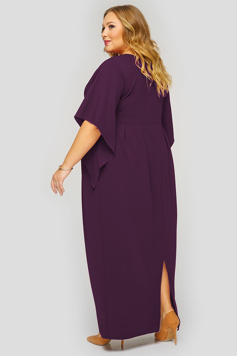 Бургунди Вечернее платье полуприлегающего силуэта. V-вырез горловины по переду и по спинке. Рукав в виде "крыла" заканчивается углом по нижнему шву. Верхняя часть отрезная, на подкладке, со сборкой по центру переда под линией груди. Двойной втачной пояс. Юбка "тюльпан" с разрезом по центральному шву задней половинки.