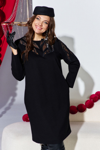 Оригинальное лаконичное платье, украшенное дизайнерской вышивкой с прозрачными элементами, рисуют образ сдержанной красоты и делают Вас поистине роскошной! Элегантный крой платья и пластические свойства инновационного трикотажного полотна помогут скрыть недостатки фигуры и создать идеальный силуэт. Платье прямого силуэта, свободного кроя с круглой горловиной, нагрудными вытачками, и втачными длинными рукавами. Верхняя часть переда и рукавов декорированы вышивкой со вставками из тончайшего кружева. По спинке платья вырез капелька с застёжкой на пуговицу в среднем шве. В боковых швах платья карманы. Длина платья 99 см (р 48-52), 101 см (р 54-58). Длина рукава 62 см.