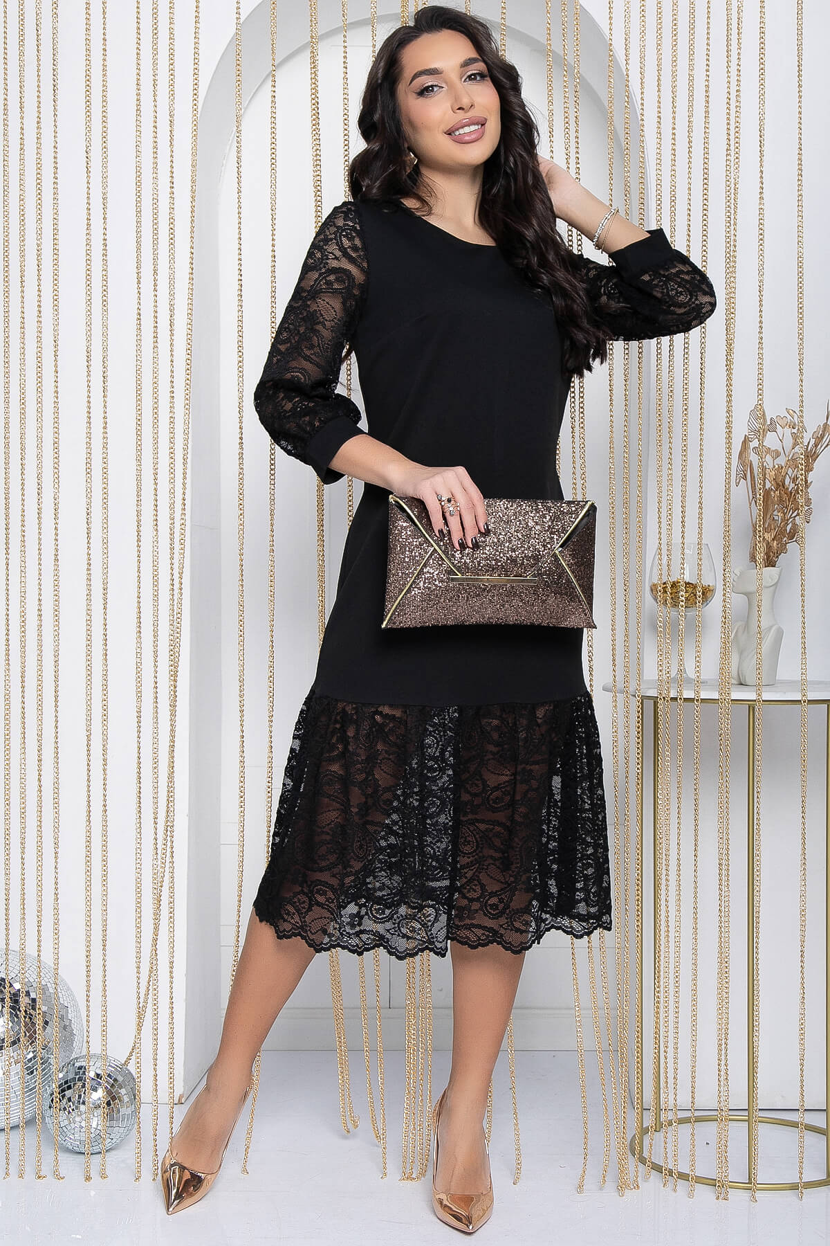 Создайте свой неповторимый образ с этим утонченным и женственным нарядом. Особенностью модели являются кружевные вставки, которые украшают низ платья и рукава, добавляя изысканности и очарования. Нежные акценты делают это платье идеальным выбором для романтических свиданий, дружеских встреч и особых мероприятий. Его можно легко сочетать с различными аксессуарами и обувью, что позволяет создавать уникальные и запоминающиеся образы для любого случая.