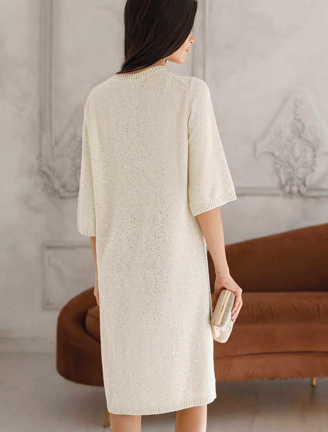 Эффектное платье бежевого цвета с широкими рукавами средней длины выполнено из хлопковой пряжи с вкраплением сияющих пайеток, что придает особую изысканность. Платье связано изнанкой, пряжа отличается легкостью и приятной текстурой, совершенно не колется, обеспечивает комфорт даже при длительном использовании, а натуральные волокна поддерживают оптимальный температурный баланс. Крой полуприлегающий, подчеркивает женственный силуэт, а круглый ворот, манжеты на рукавах и по низу гармонично завершают дизайн, создающий аккуратный образ. Благодаря универсальному крою, платье подойдет девушкам и женщинам пышных форм и больших размеров, длина миди подходит на низкий и высокий рост. Мерцающее полотно добавляет особого шарма вашему образу, делая его уместным как на праздник, так и для повседневного выхода. Новый год, вечеринка или любое другое мероприятие пройдут ярко — сияющие пайетки создают ощущение праздника в каждом движении. Это стильное платье поможет чувствовать себя уверенно на любом мероприятии в осенний и зимний сезон.