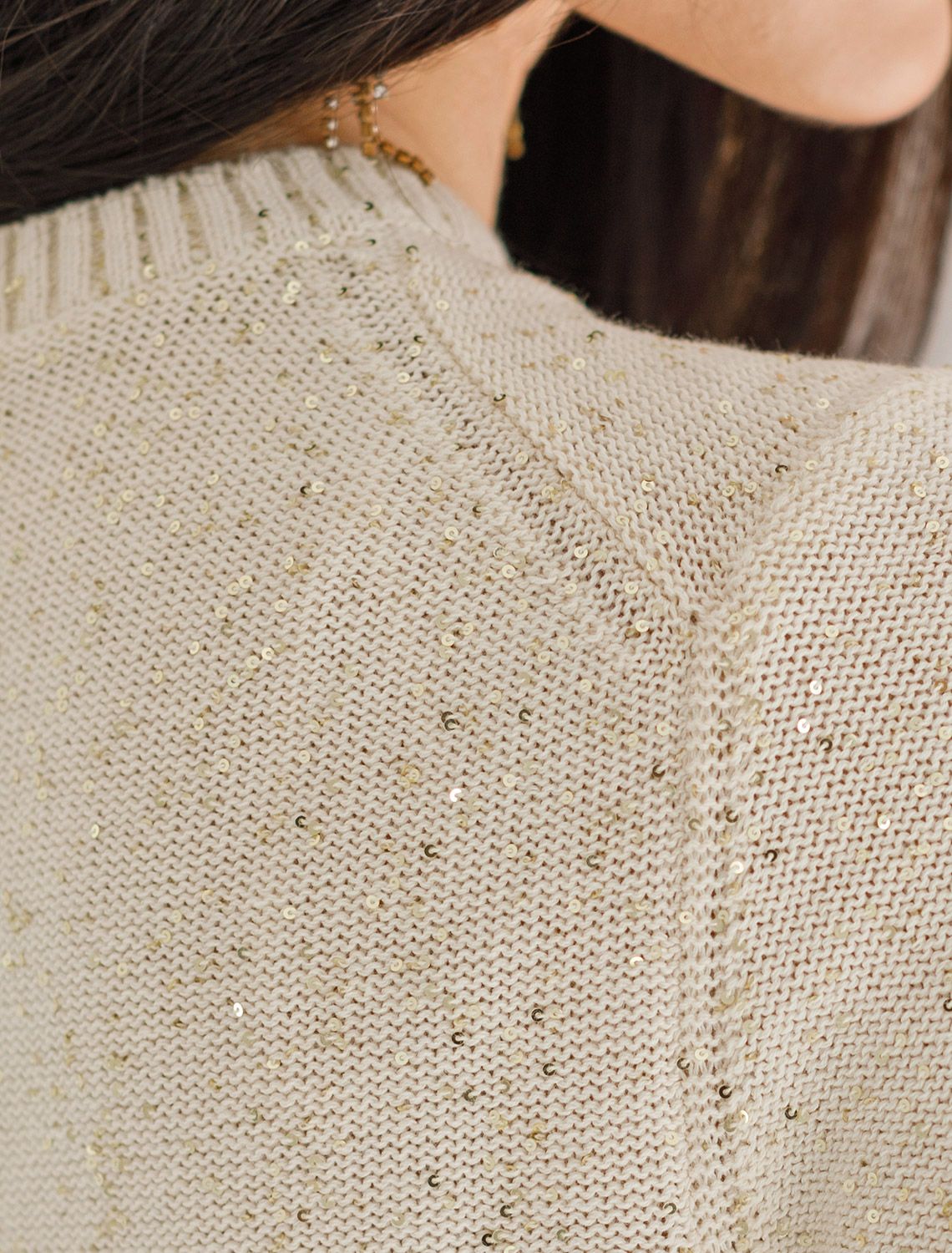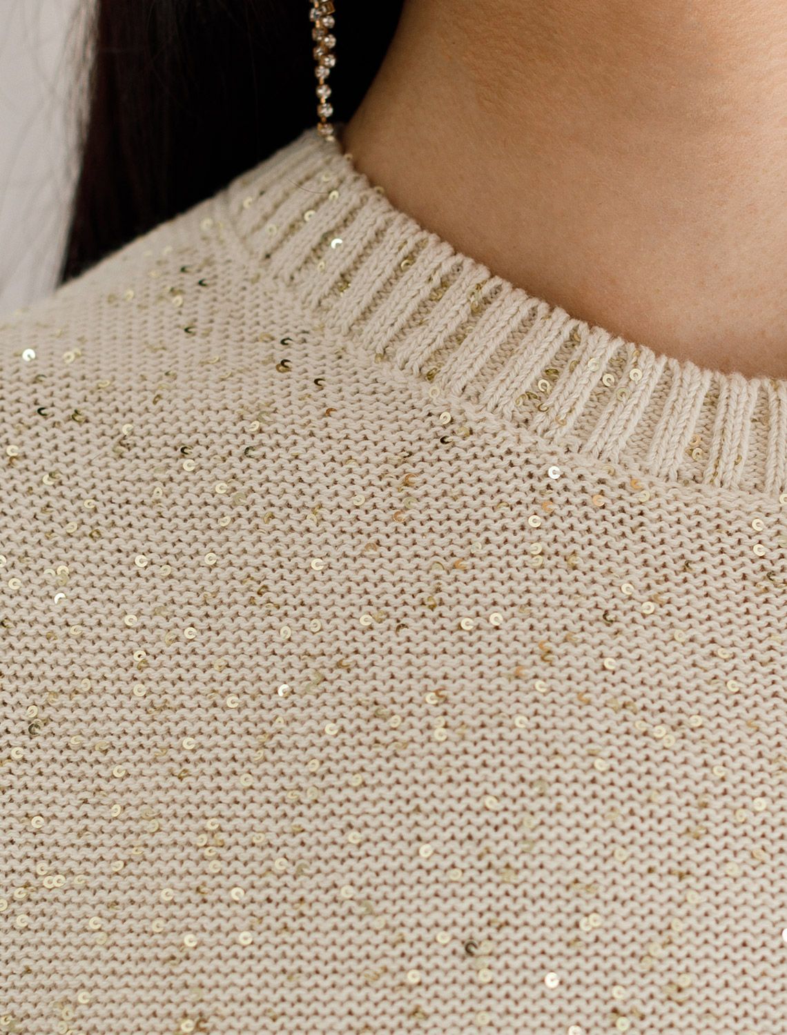 Эффектное платье бежевого цвета с широкими рукавами средней длины выполнено из хлопковой пряжи с вкраплением сияющих пайеток, что придает особую изысканность. Платье связано изнанкой, пряжа отличается легкостью и приятной текстурой, совершенно не колется, обеспечивает комфорт даже при длительном использовании, а натуральные волокна поддерживают оптимальный температурный баланс. Крой полуприлегающий, подчеркивает женственный силуэт, а круглый ворот, манжеты на рукавах и по низу гармонично завершают дизайн, создающий аккуратный образ. Благодаря универсальному крою, платье подойдет девушкам и женщинам пышных форм и больших размеров, длина миди подходит на низкий и высокий рост. Мерцающее полотно добавляет особого шарма вашему образу, делая его уместным как на праздник, так и для повседневного выхода. Новый год, вечеринка или любое другое мероприятие пройдут ярко — сияющие пайетки создают ощущение праздника в каждом движении. Это стильное платье поможет чувствовать себя уверенно на любом мероприятии в осенний и зимний сезон.