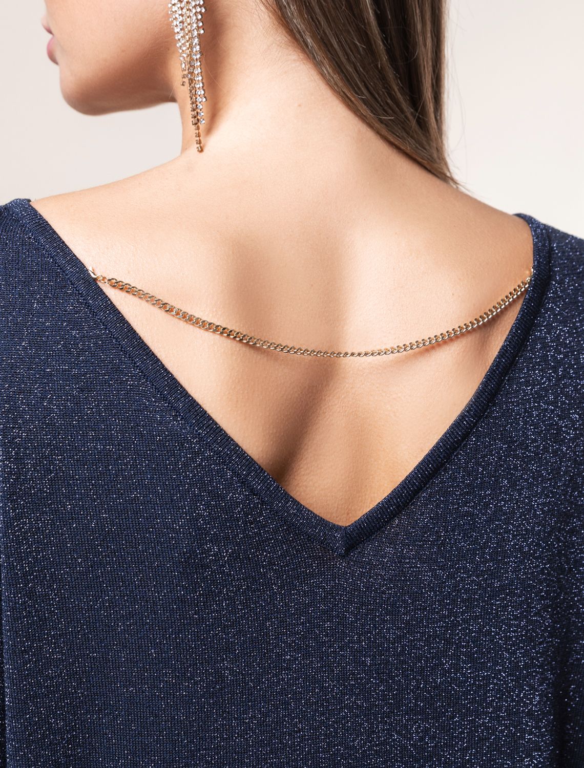 Свободное платье тонкой вязки из вискозы с добавлением мягкого люрекса. V-вырез на спинке изделия изящно притягивает внимание. Дополнительной изюминкой является тонкая цепочка, касающаяся лопаток. Внутренняя сторона изделия без люрекса, абсолютно гладкая и комфортная даже на голое тело. Совет стилиста: платье не требует к себе дополнительных аксессуаров, сочетайте свободную модель с босоножками на тонком ремешке или лодочками. темно-синий