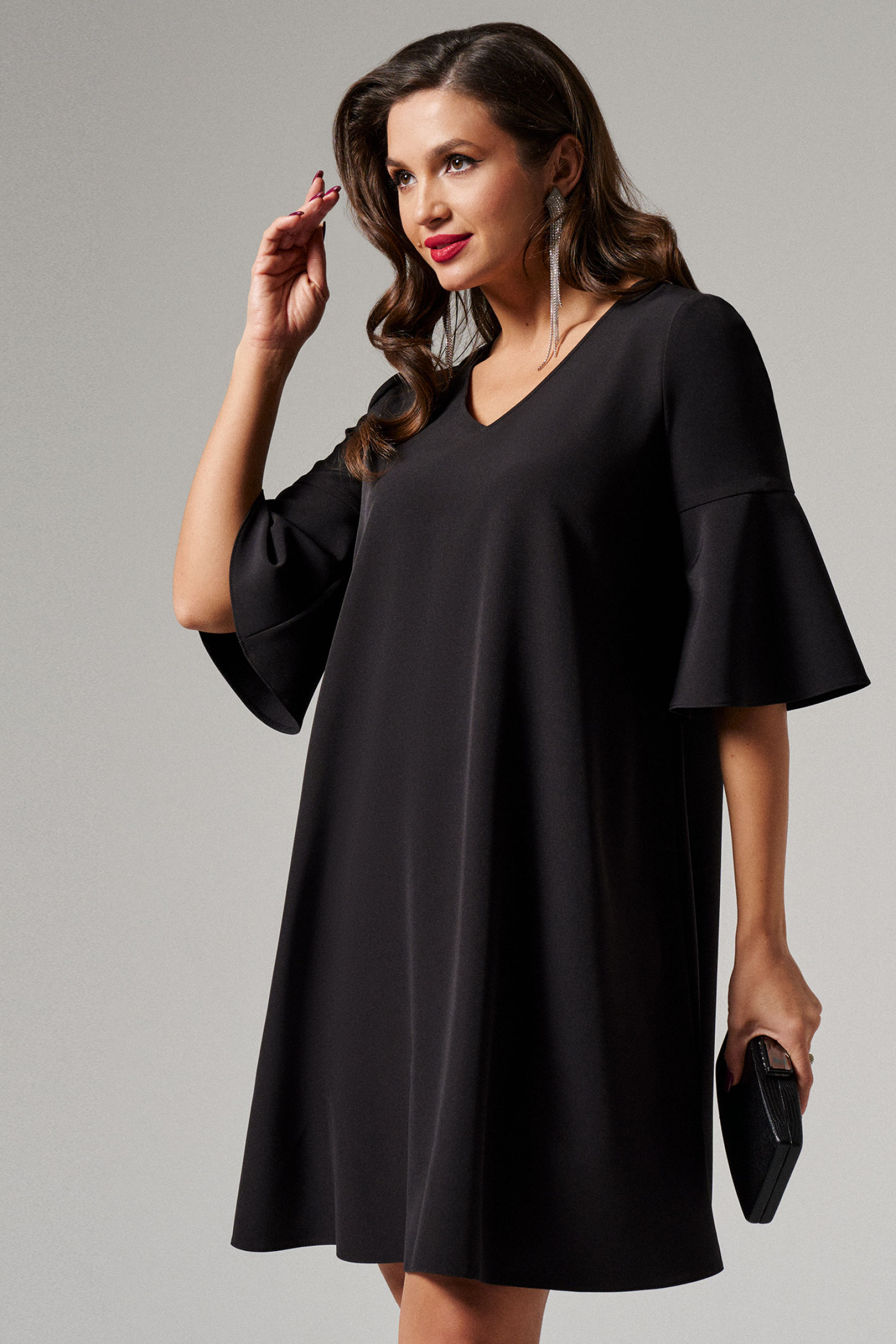 Платье женское из лёгкой ткани для повседневной носки. Платье, расширяющееся к низу с V--образной горловиной. Рукава оформлены воланом. Длина изделия до колена.