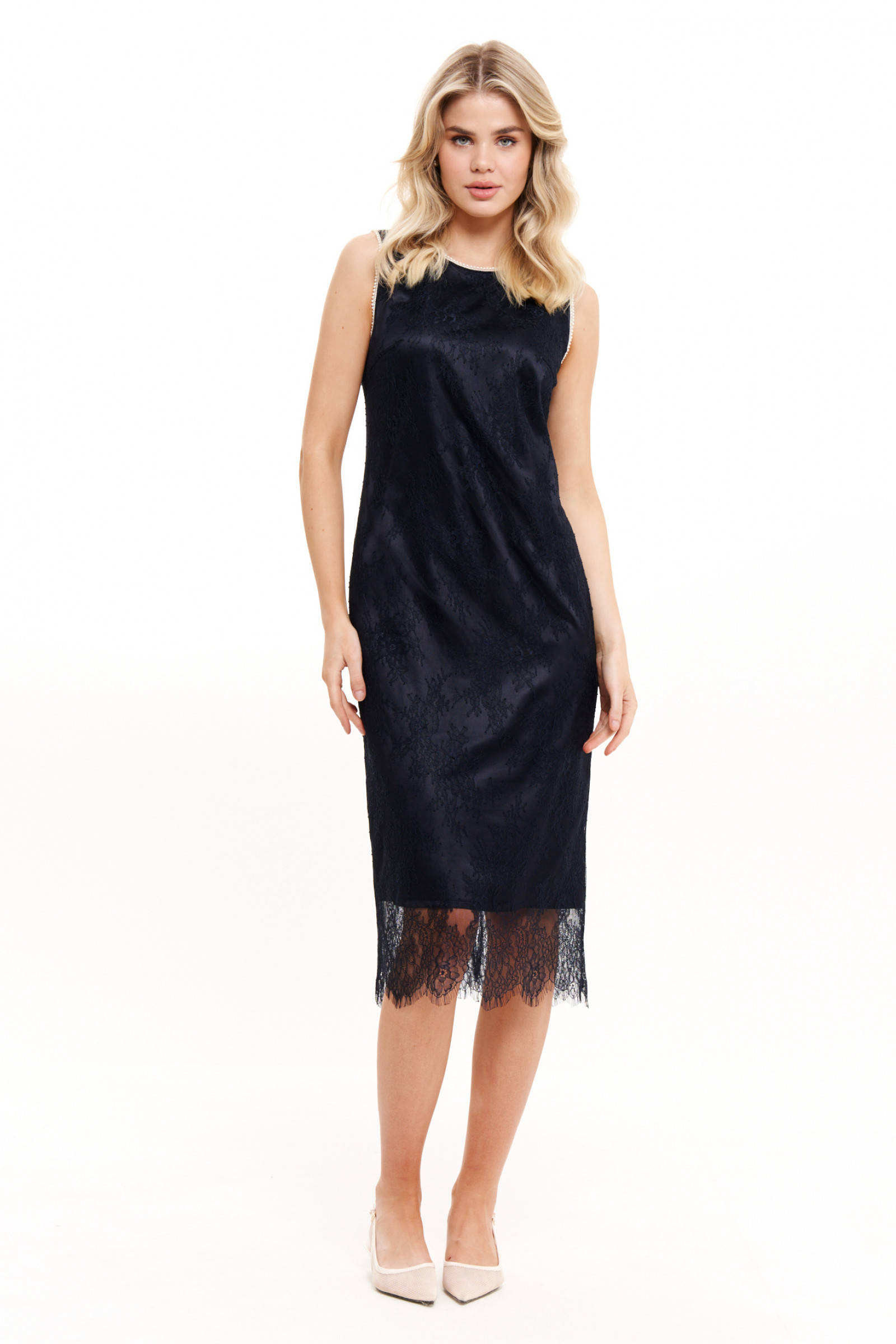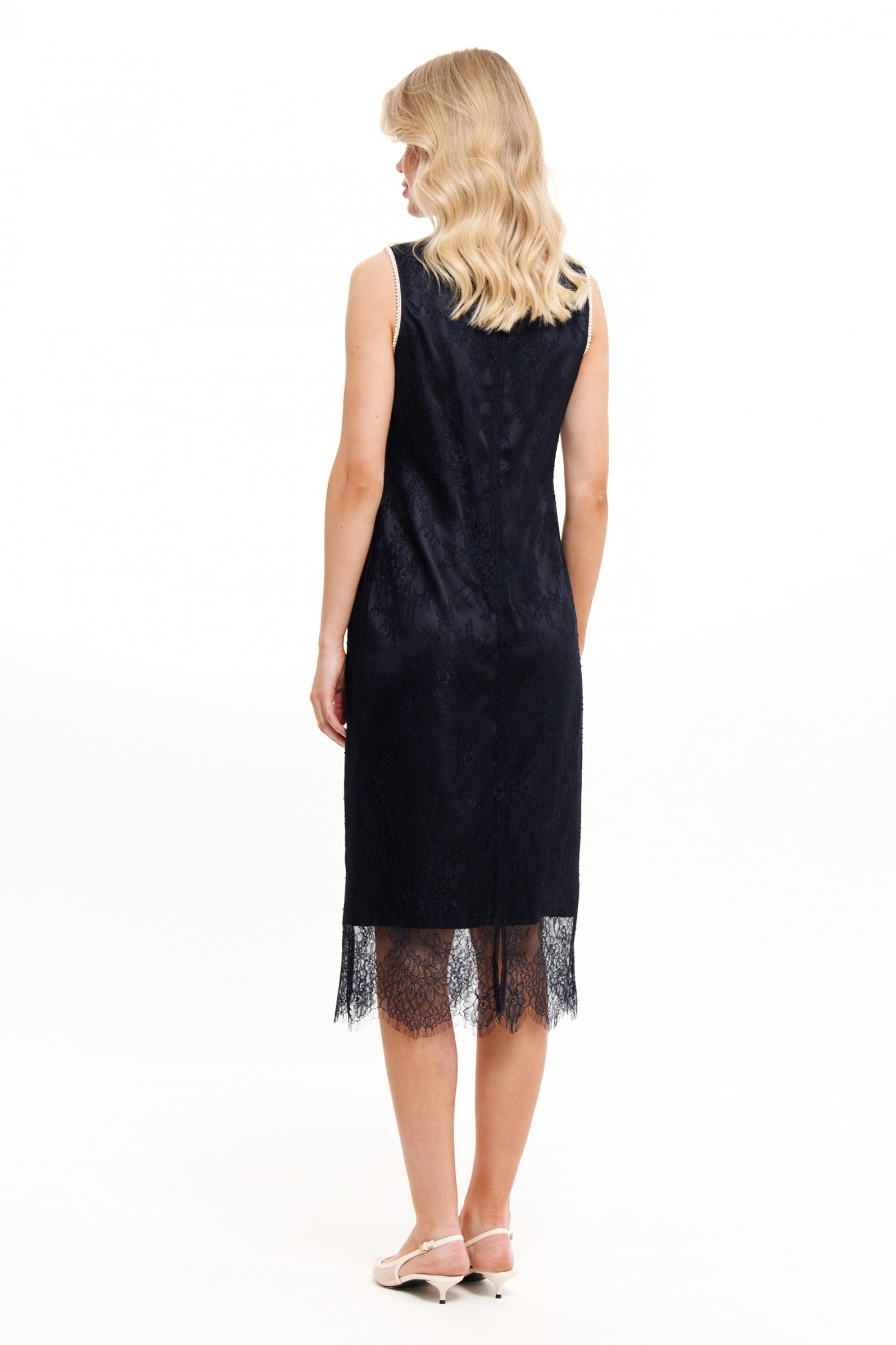 Длина миди делает платье универсальным вариантом для различных случаев – от деловых встреч до вечерних мероприятий. Оно идеально впишется в базовый гардероб, дополняя как классические, так и современные образы. Отсутствие рукавов делает его идеальным для весенне-летнего сезона, обеспечивая комфорт даже в жаркую погоду. Пройма обработана декоративной тесьмой, которая гармонично дополняет изысканную горловину, украшенную жемчужным декором.