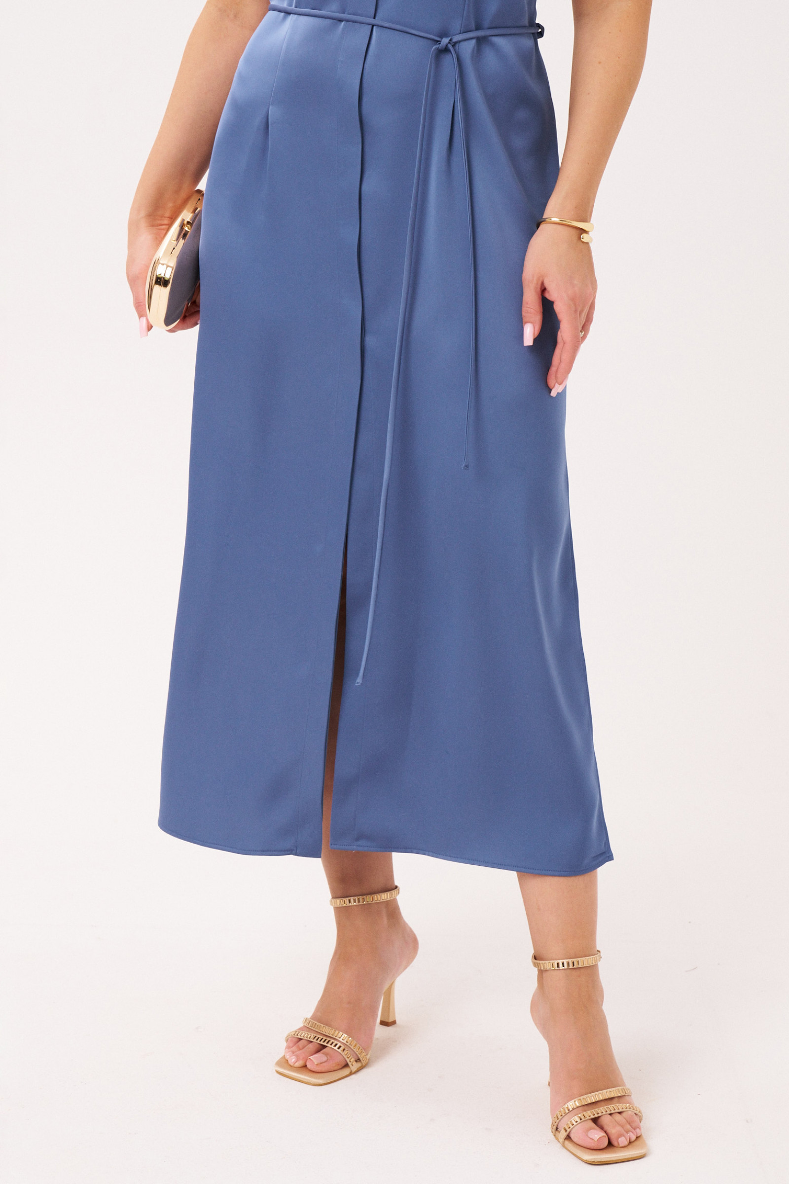 Платье женское из лёгкой струящейся ткани с блеском для торжественных случаев. Платье полуприлегающего силуэта. Перед с талиевыми вытачками. В платье имеется центральная бортовая супатная застежка на обметанные петли и пуговицы. В боковом шве имеются разрезы до низа изделия, а также в области талии располагаются петли, через которые протянута завязка для регулировки талии. Спинка с талиевыми вытачками. Горловина обработана рубашечным воротником на стойке. Рукав цельнокроеный, короткий. Линия плеча слегка спущена. Красивое и очень удобное платье, которое станет вашим фаворитом.