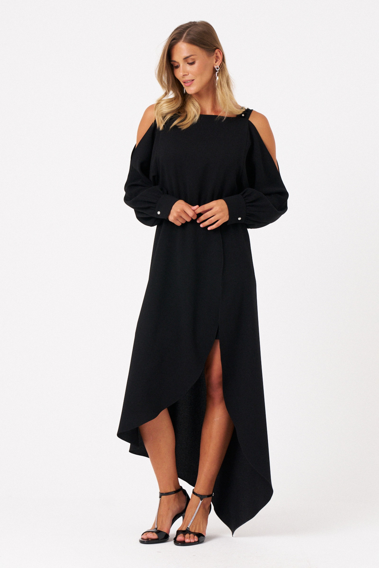 Платье выполнено из легкой струящейся ткани черного оттенка и обладает изящной многослойной юбкой: основная юбка дополнена верхней и нижней, создающими объем и эффектный силуэт. Бретели с декоративной тесьмой и спущенная горловина придают образу женственность и нежность.