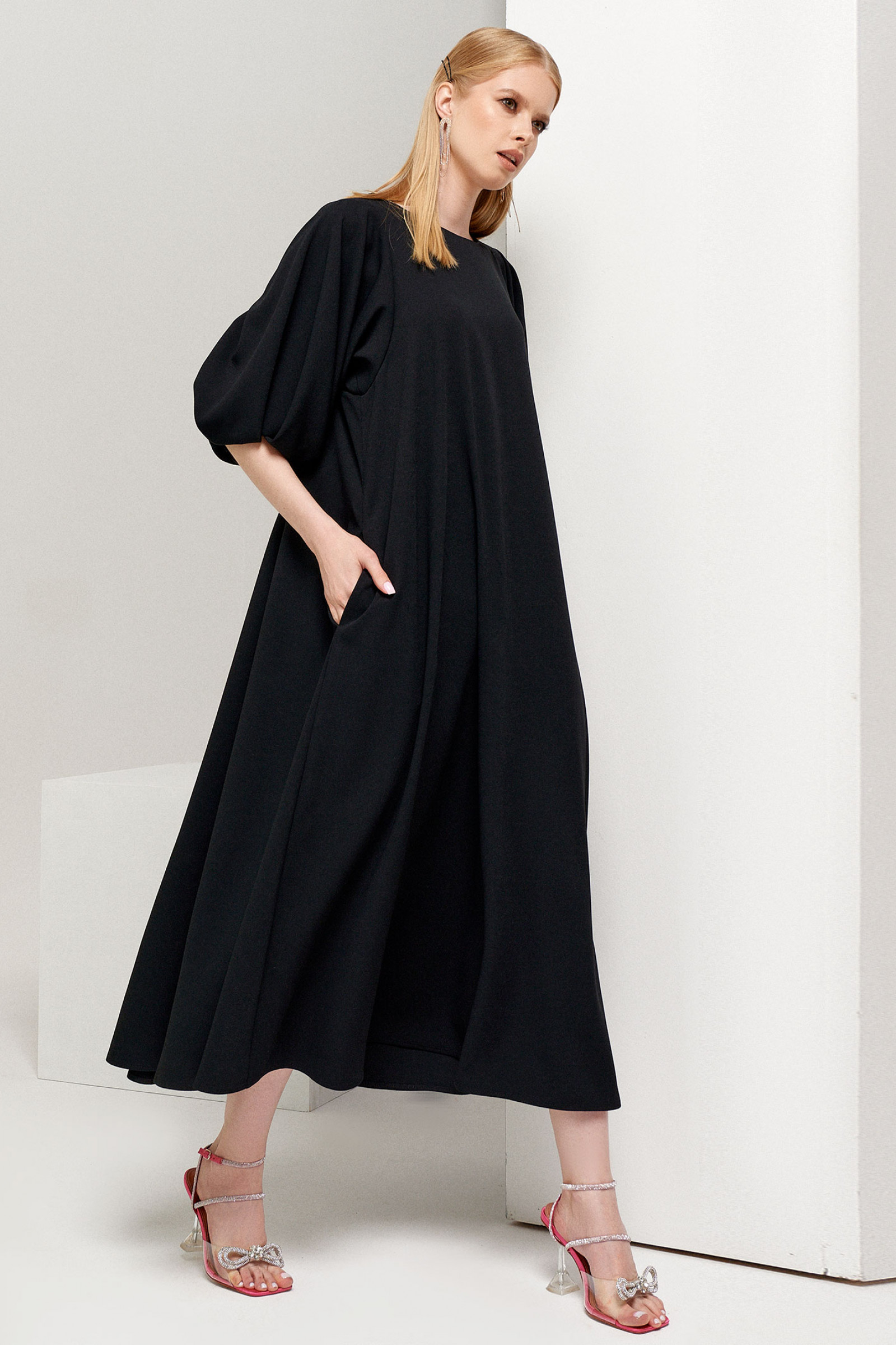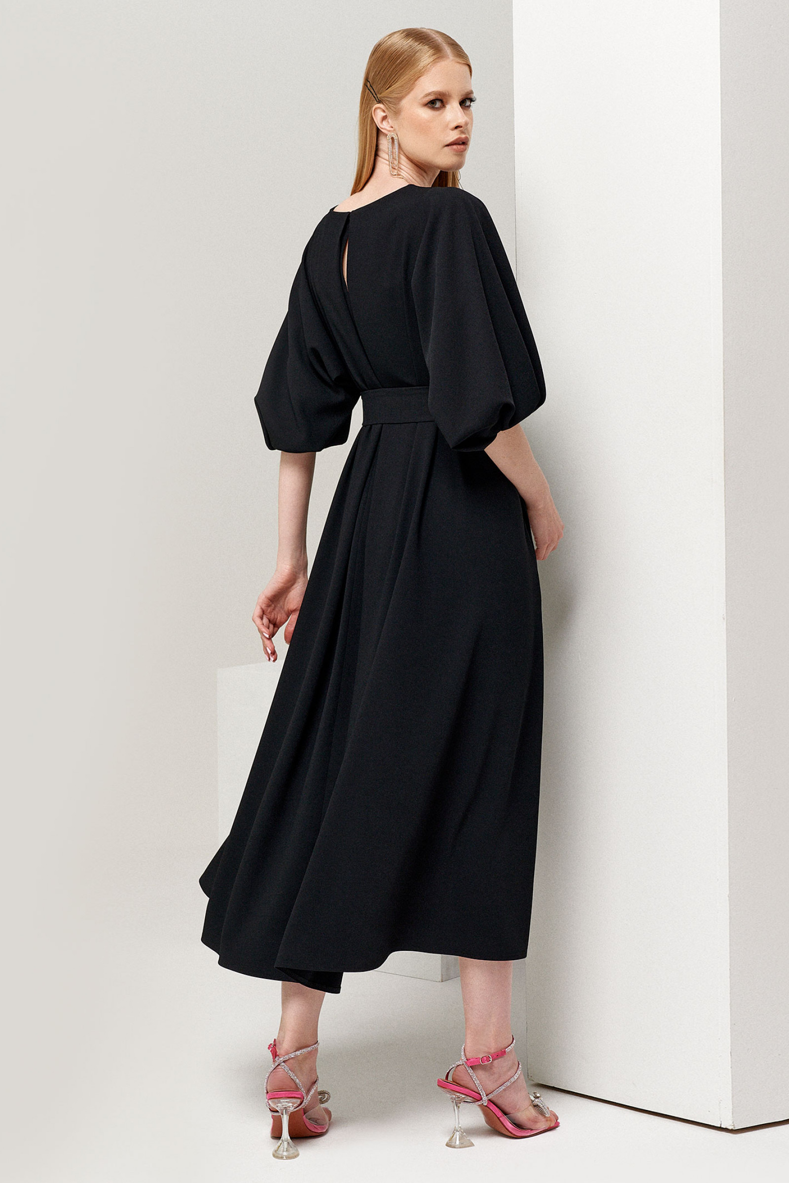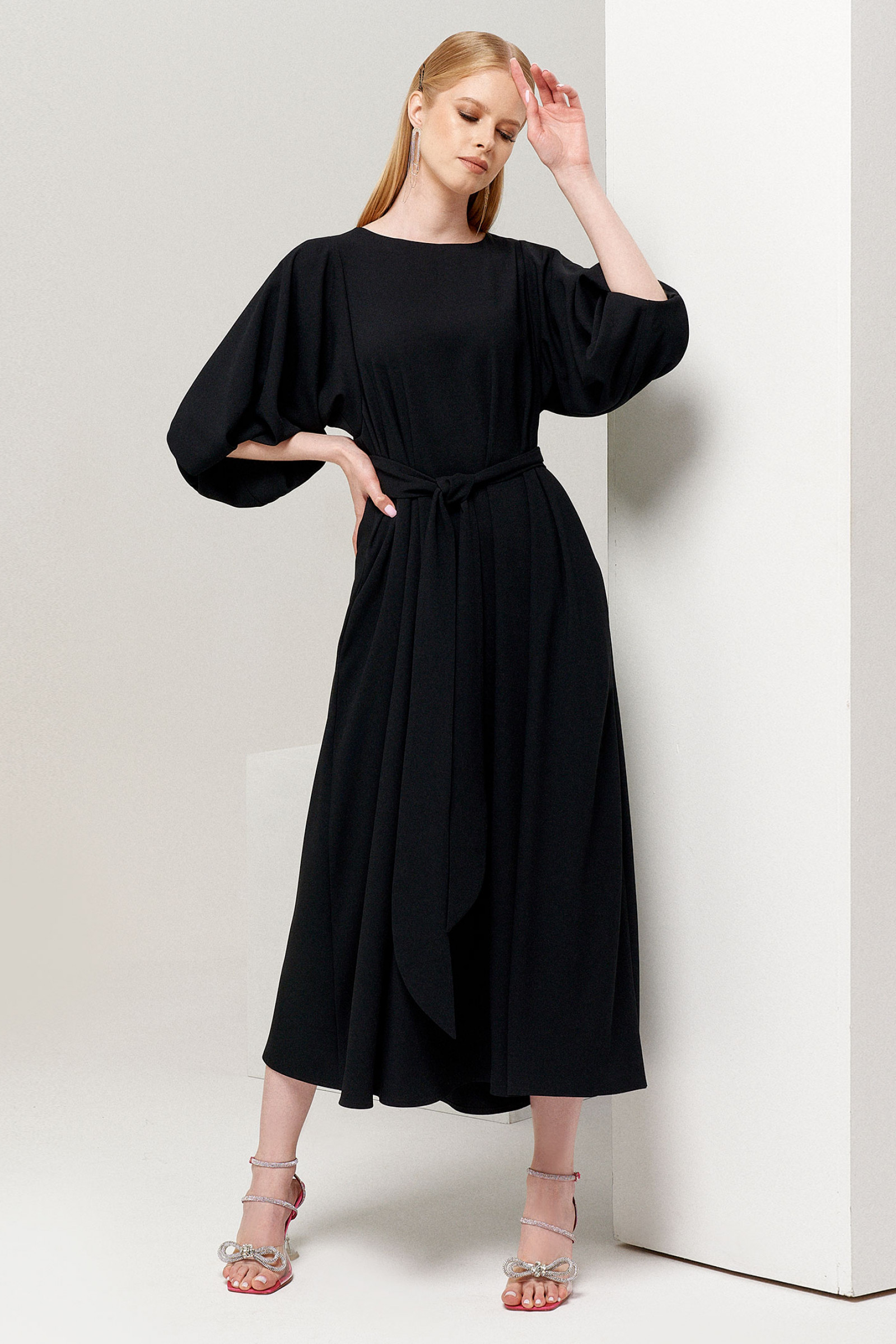 Женское вечернее платье из вашего гардероба не обязательно должно быть маленьким. Данная модель длиной ниже колена смотрится женственно, привлекательно и соблазнительно. Достаточно дополнить ее аксессуарами, обувью на каблуке – и романтичный образ готов. Платье с пышными рукавами до локтя скроено в свободном силуэте. Боковые швы юбки слегка смещены, поэтому полотно ложится красивыми вертикальными волнами. Текстильный пояс придает талии стройность, а округлый вырез горловины делает look трогательным и загадочным. Изделие пошито в размерах 42-50, из легкой эластичной ткани с приятной гладкой поверхностью. Покупайте длинное летнее платье – покоряйте и восхищайте окружающих!