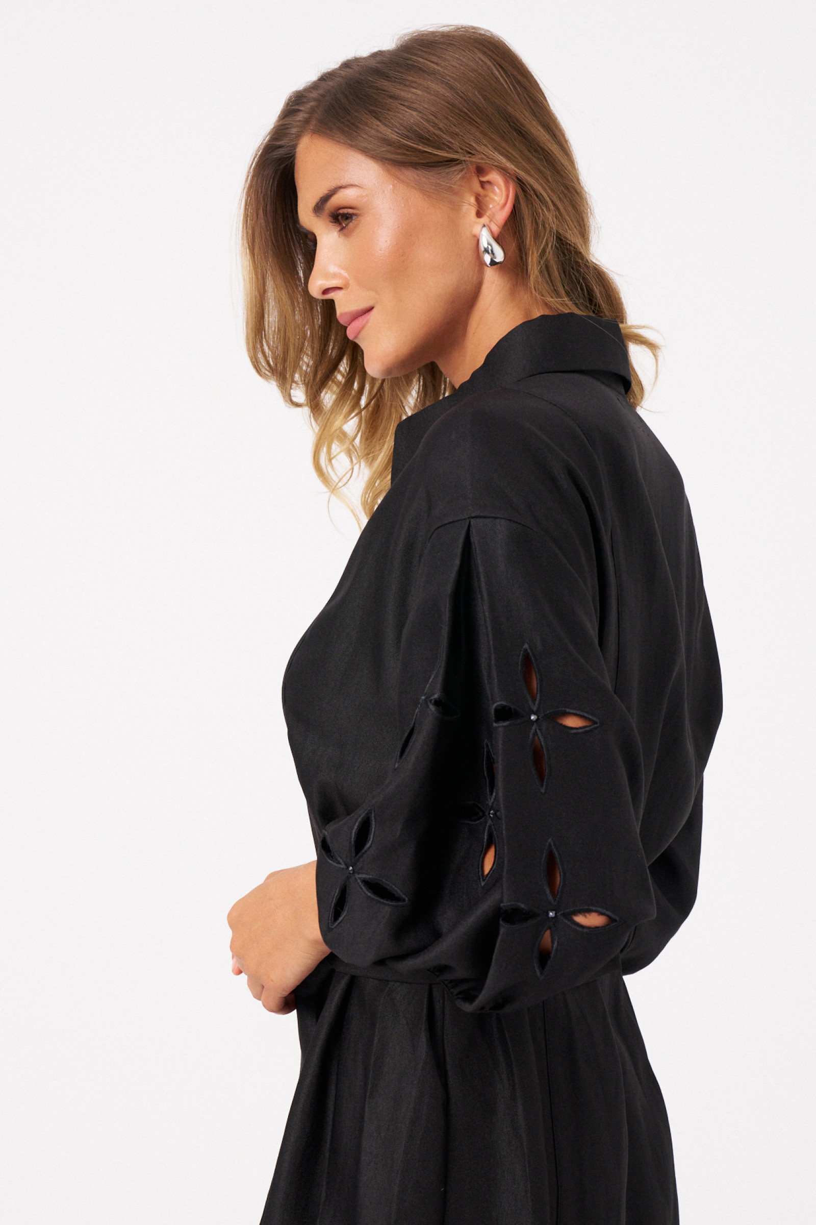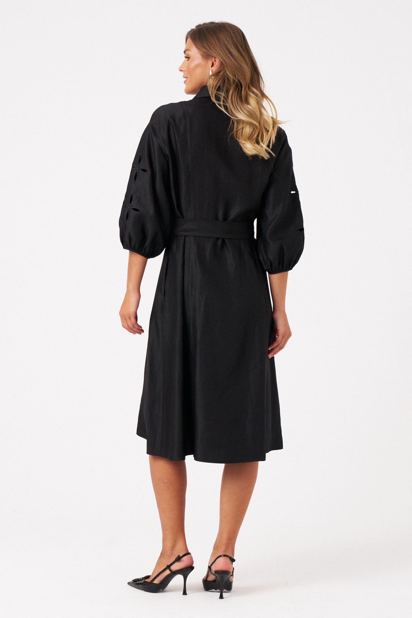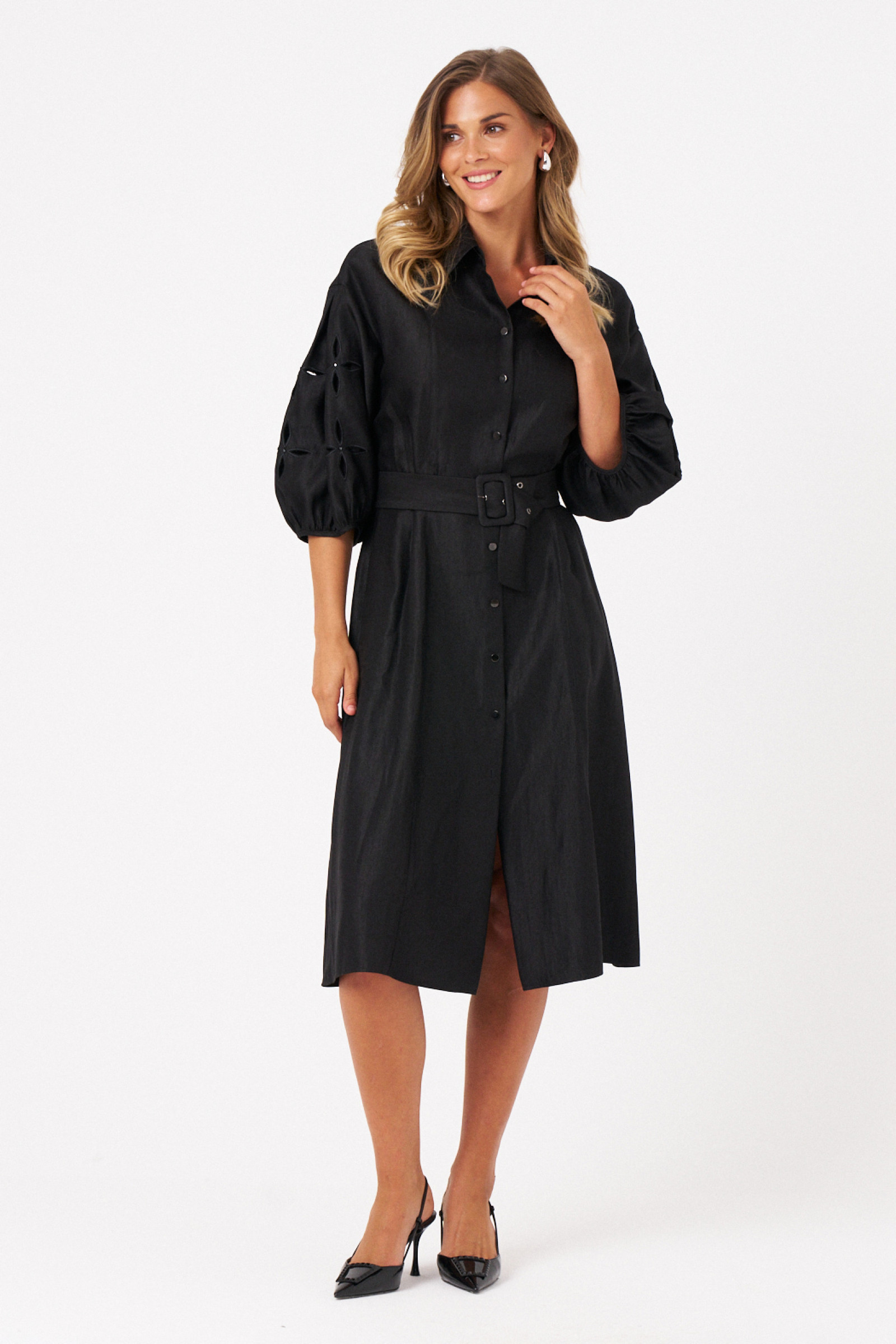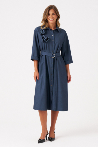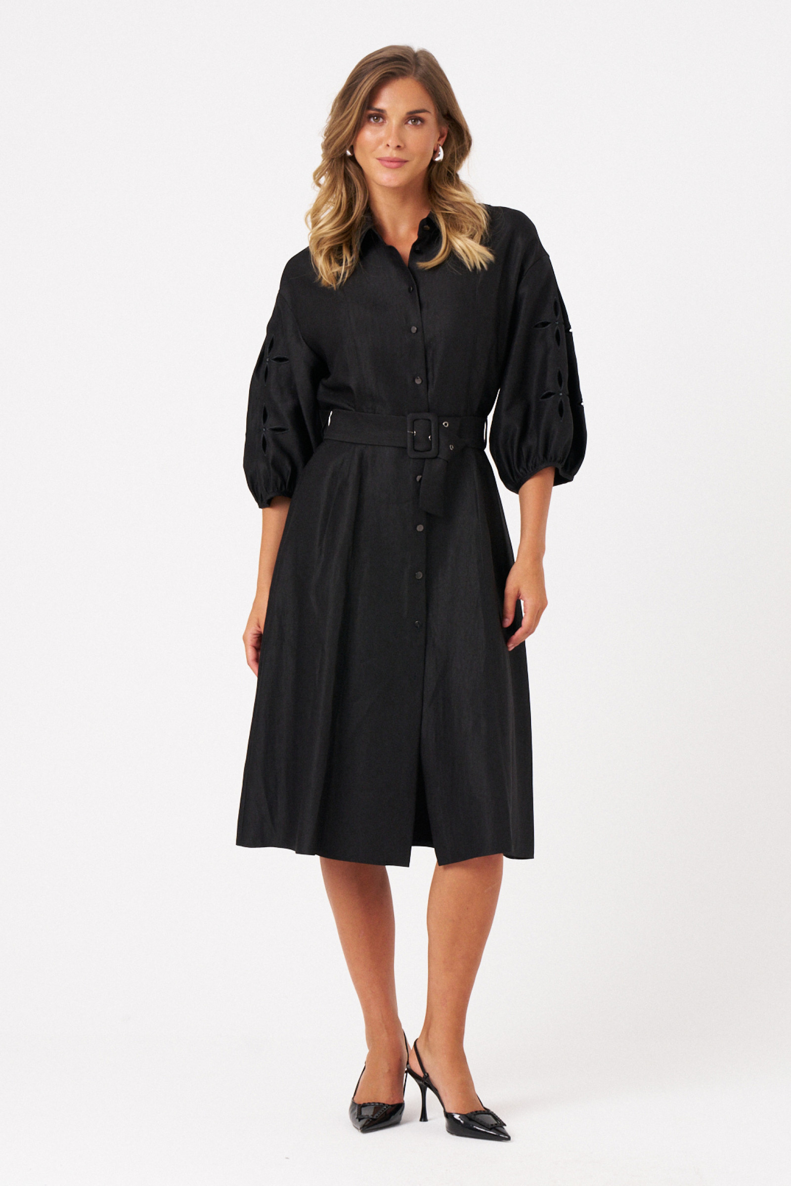 Это платье из смесовой ткани с высоким содержанием вискозы, выполненное в полуприлегающем силуэте. Модель с центральной застежкой на пуговицы с обметанными петлями. Передняя часть украшена двумя вертикальными рельефами, идущими от линии плеча до низа, что создает интересный визуальный эффект. Спинка также оформлена двумя вертикальными рельефами от плеча до линии низа. Талия подчеркнута шлёвками, позволяющими регулировать посадку или использовать пояс. Горловина оформлена рубашечным воротником с отрезной стойкой, придающей образу классический стиль. Рукава втачные, украшены красивым цветочным узором с перфорацией в виде лепестков, а нижняя часть рукава обработана притачной тесьмой со сборкой, добавляющей декоративности. Длина платья — миди, что делает его универсальным, за счет своего чёрного оттенка оно становиться элегантным и подходи для различных случаев.