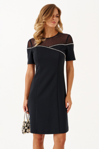 Элегантное платье чёрного цвета из поливискозного трикотажа. Модель полуприлегающего силуэта идеально подходит как для повседневной носки, так и для торжественных случаев. Платье выполнено из мягкого и комфортного трикотажного полотна. Перед украшен двумя нагрудными вытачками и декоративной тесьмой с цепочкой фигурного направления, переходящей на рукав. Спинка со средним швом и потайной молнией обеспечивает удобную посадку. Расширенная горловина и рукава длиной чуть выше локтя создают стильный и изящный образ. Длина миди делает платье универсальным и актуальным для любого сезона.