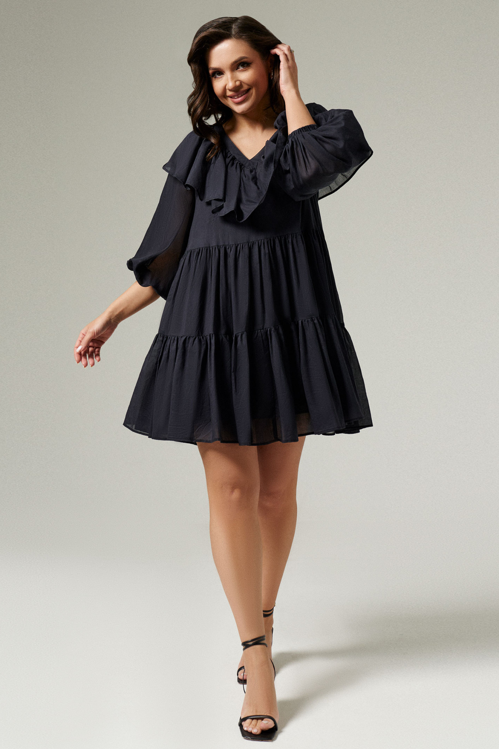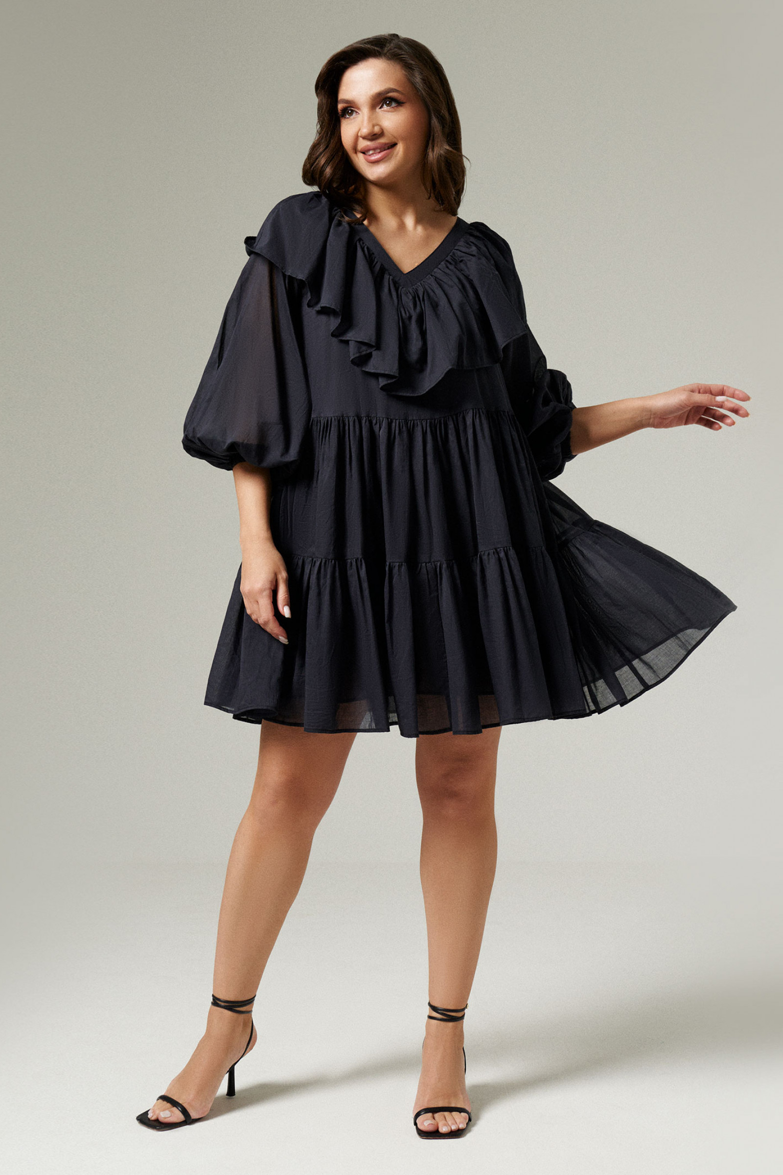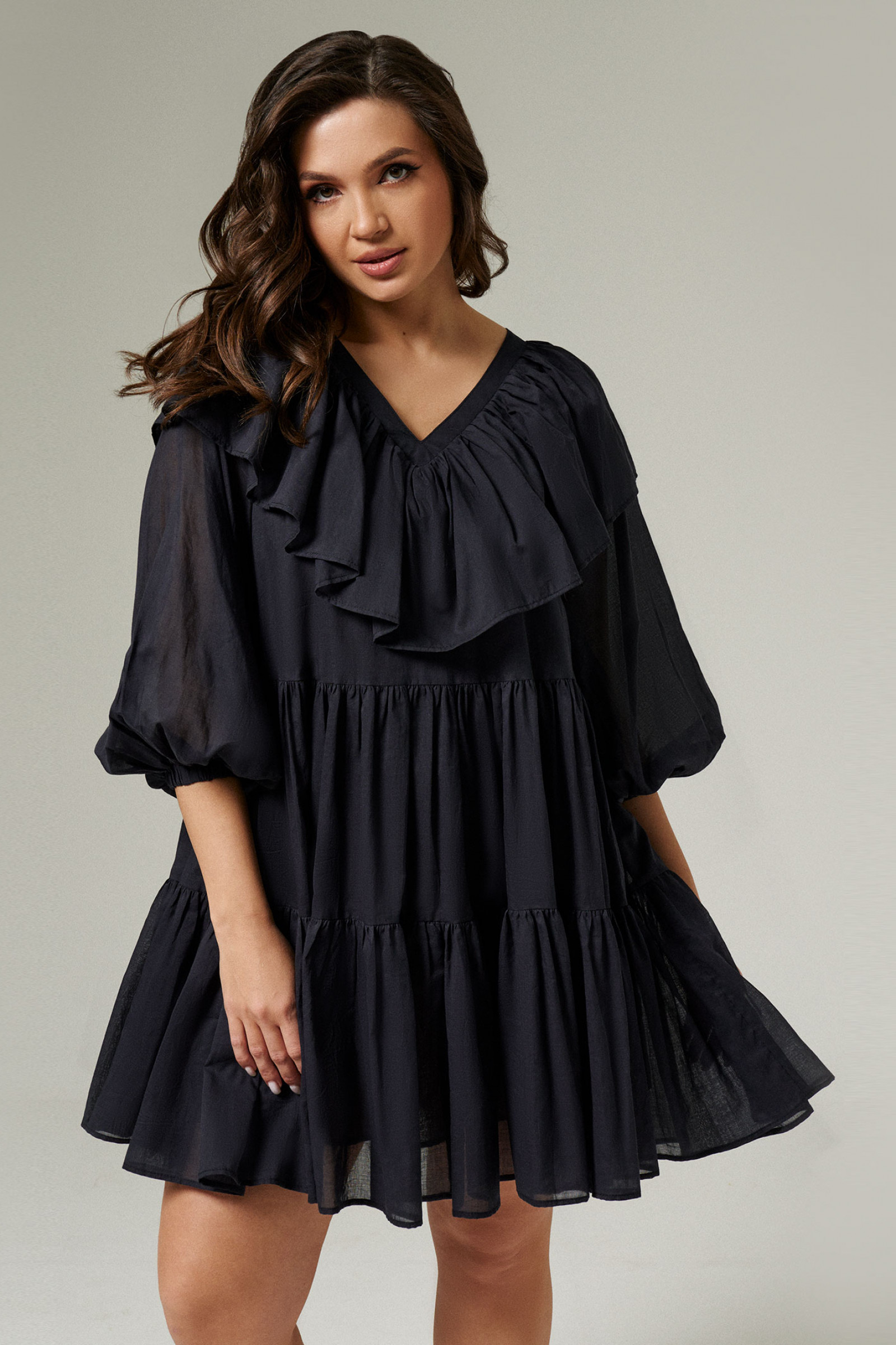 Платье из хлопковой ткани для повседневной носки. Изделие свободного силуэта с V- образной горловиной. Рукав укороченый оформлен притачной манжетой на резинке. Горловина оформлена рюшей. Длина изделия до колена.