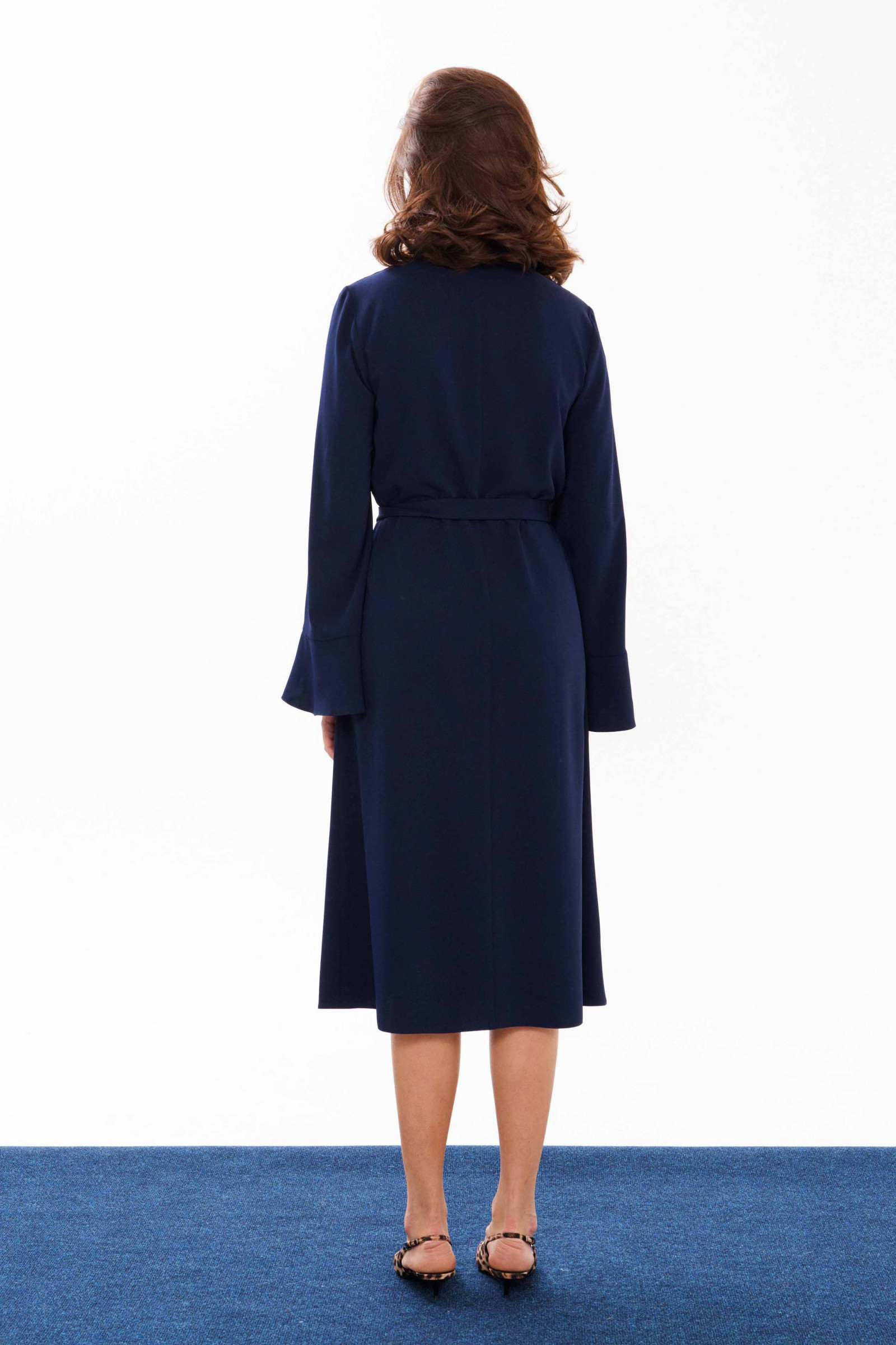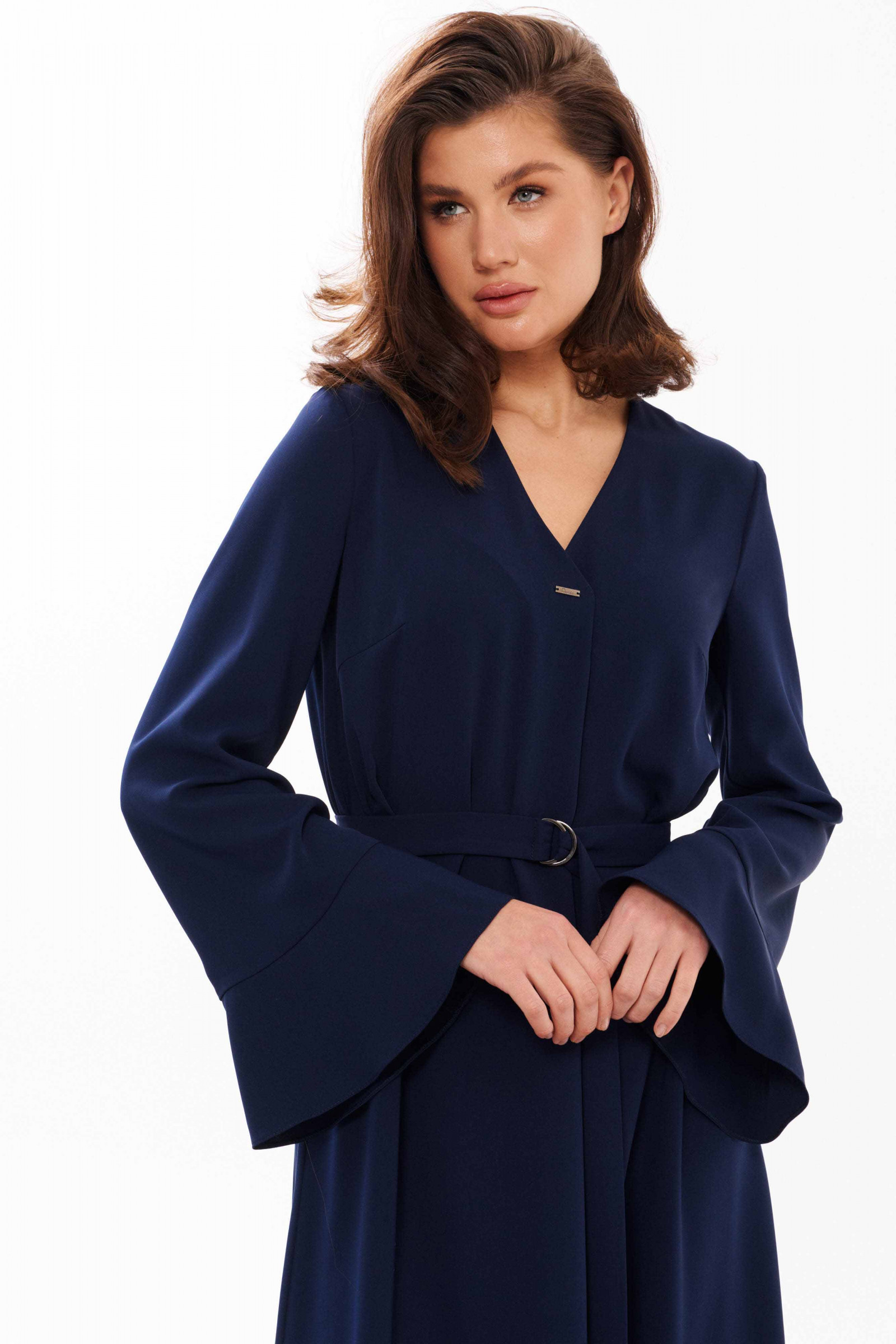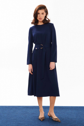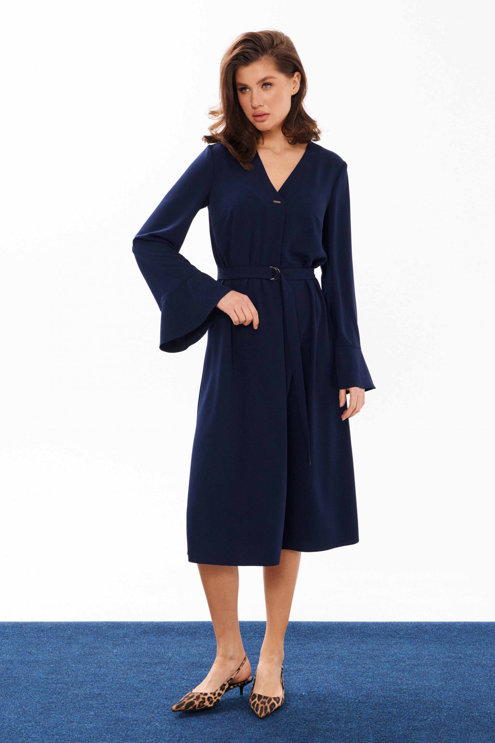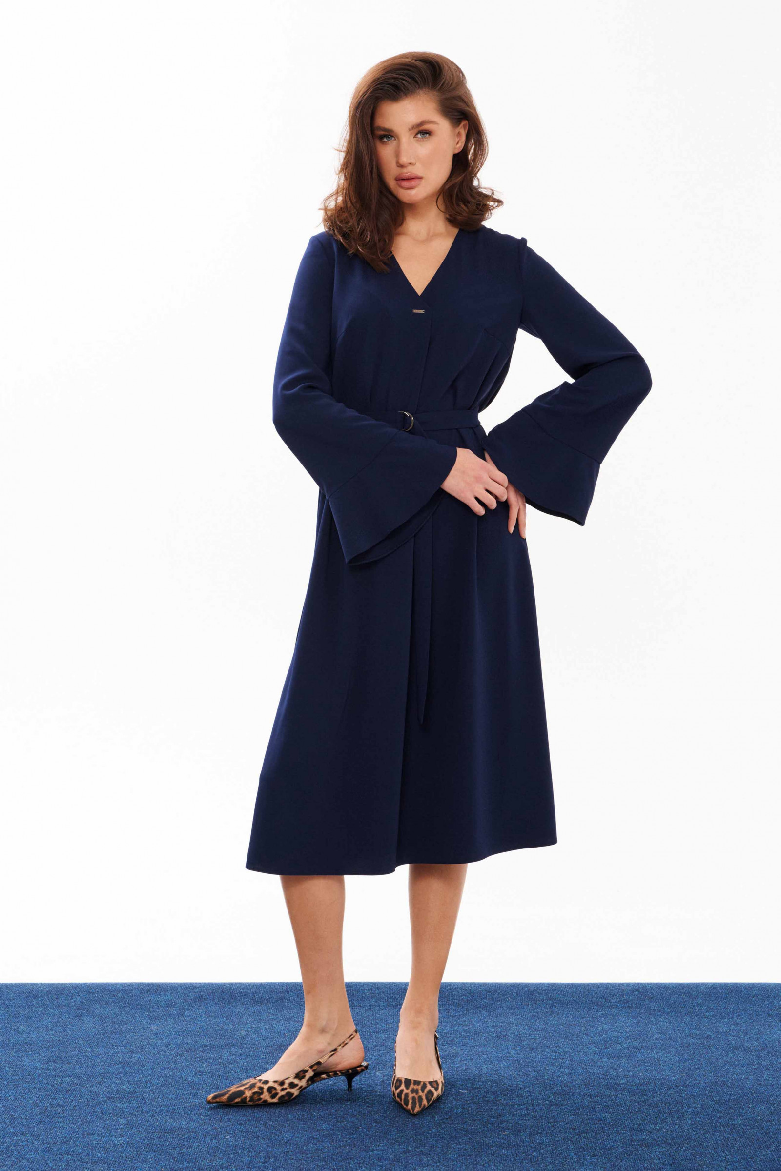 Платье женское из струящейся ткани для повседневной носки. Платье прямого силуэта. Перед имеет две нагрудные вытачки. Перед с имитацией борта с заложенной складкой. Спинка со средним швом. Горловина V-образная. Рукава втачные длинные, низ рукава имеет отрезную чуть расширенную деталь. Для придания формы в области талии имеется пояс. Длина платья миди. Очень изящное платье, которое обязательно украсит его обладательницу. В данном платье вы будете чувствовать себя комфортно, а главное в нем вы будете безупречны.