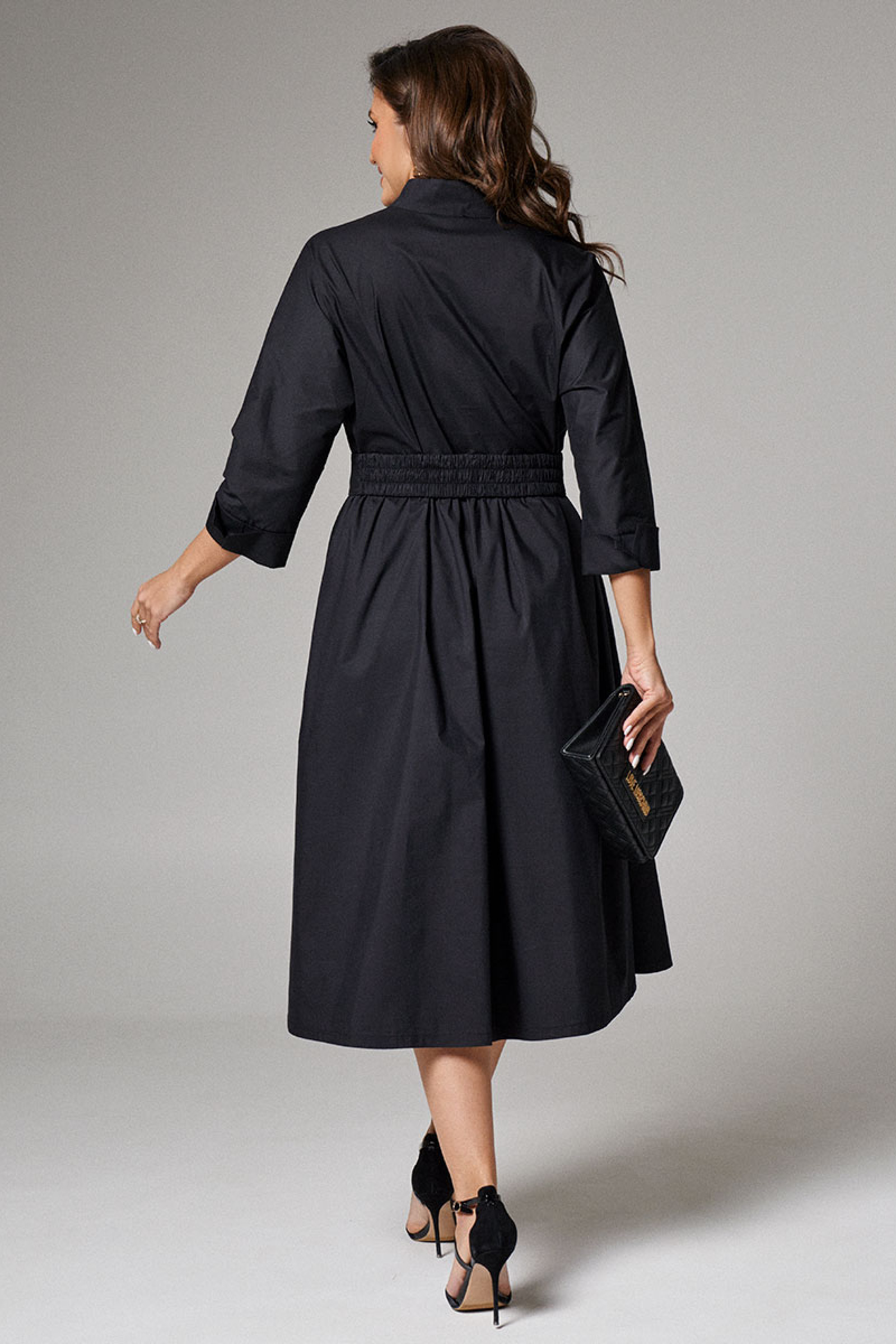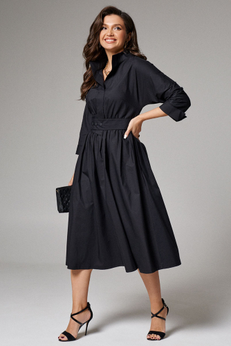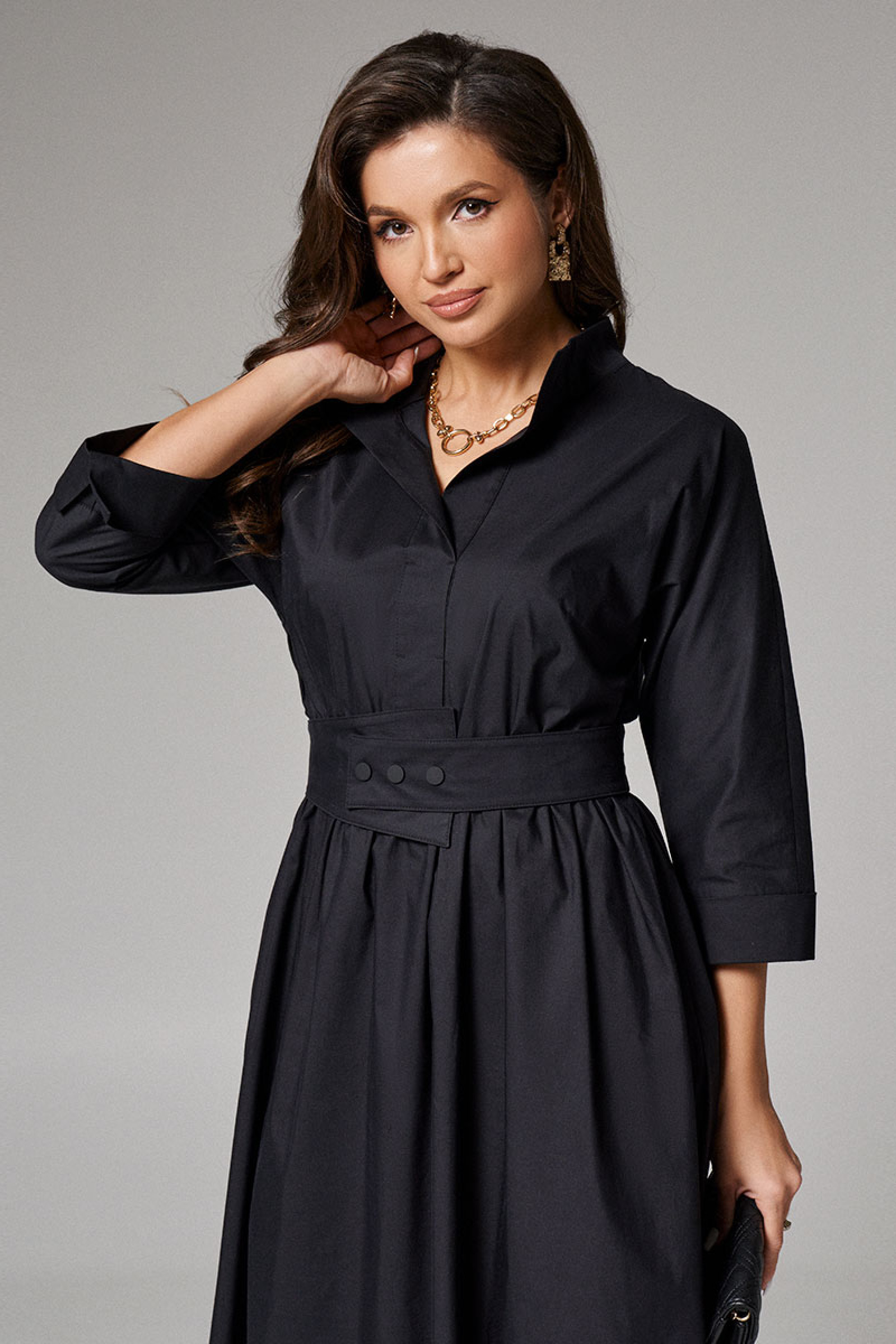 Платье женское из хлопковой ткани для повседневной носки. Без подкладки. Платье полуприлегающего силуэта. Длина изделия ниже колена. В боковых швах прорезные карманы. Рукав три четверти с манжетой. Платье укомплектовано поясом из основной ткани изделия.