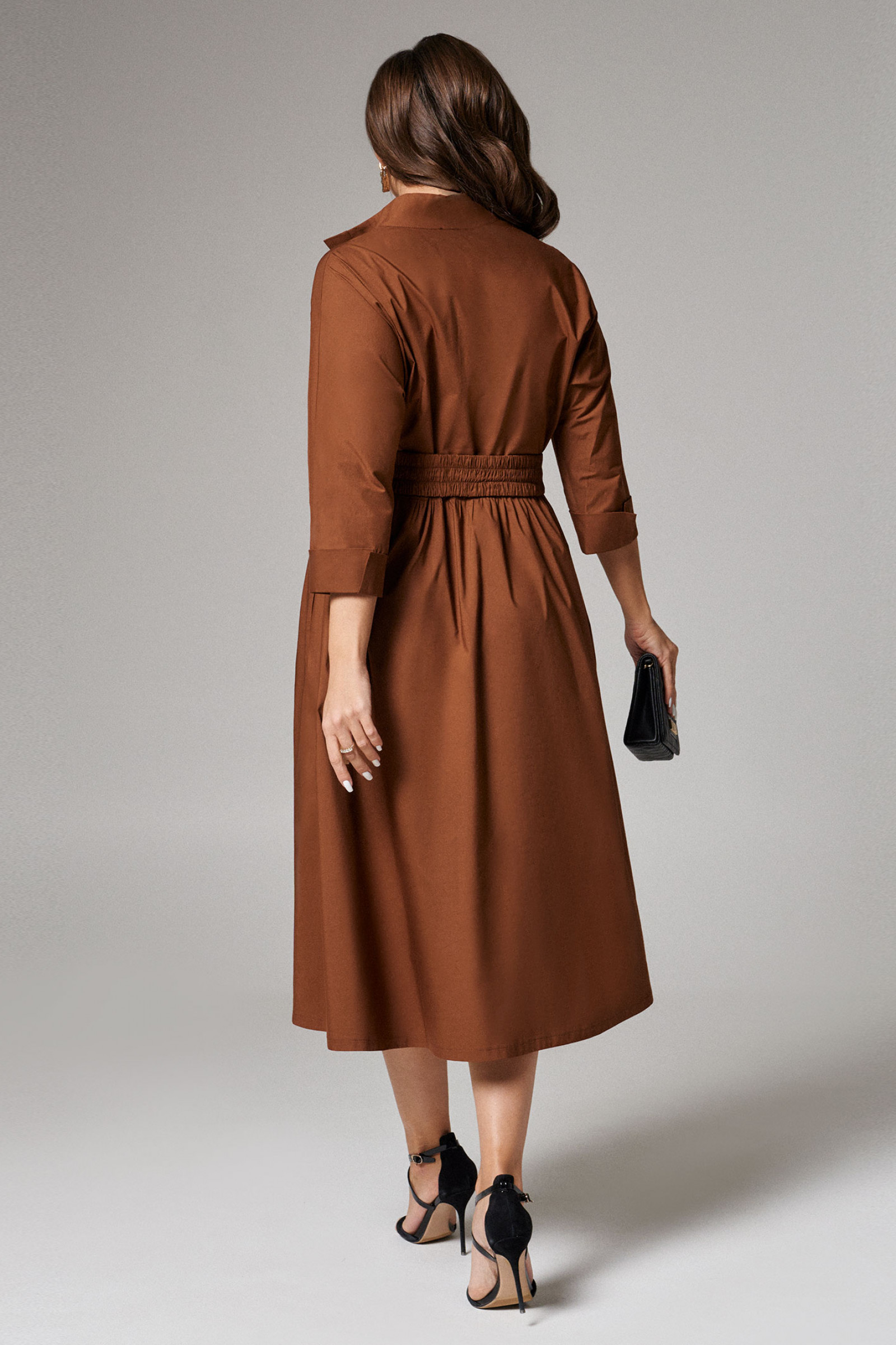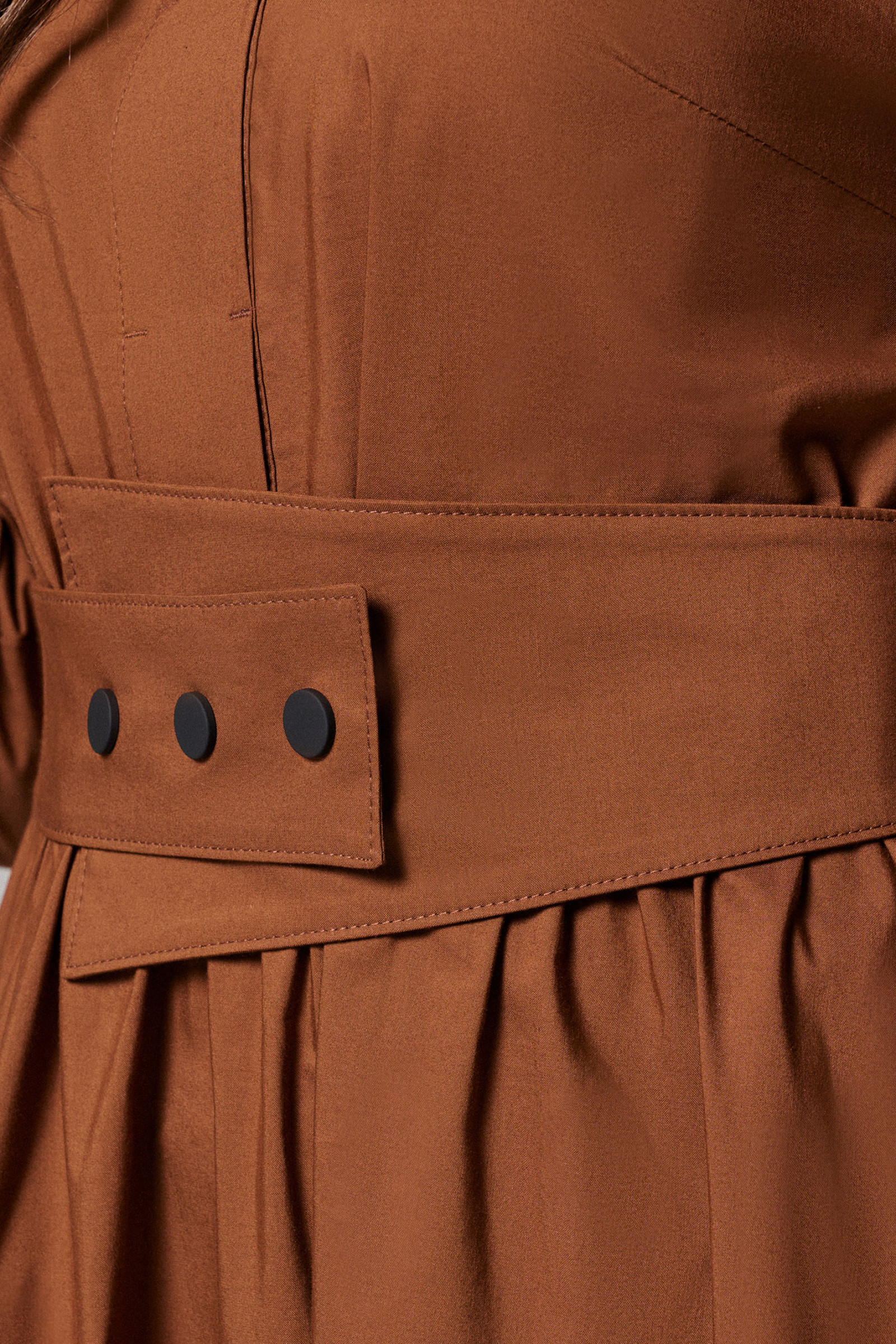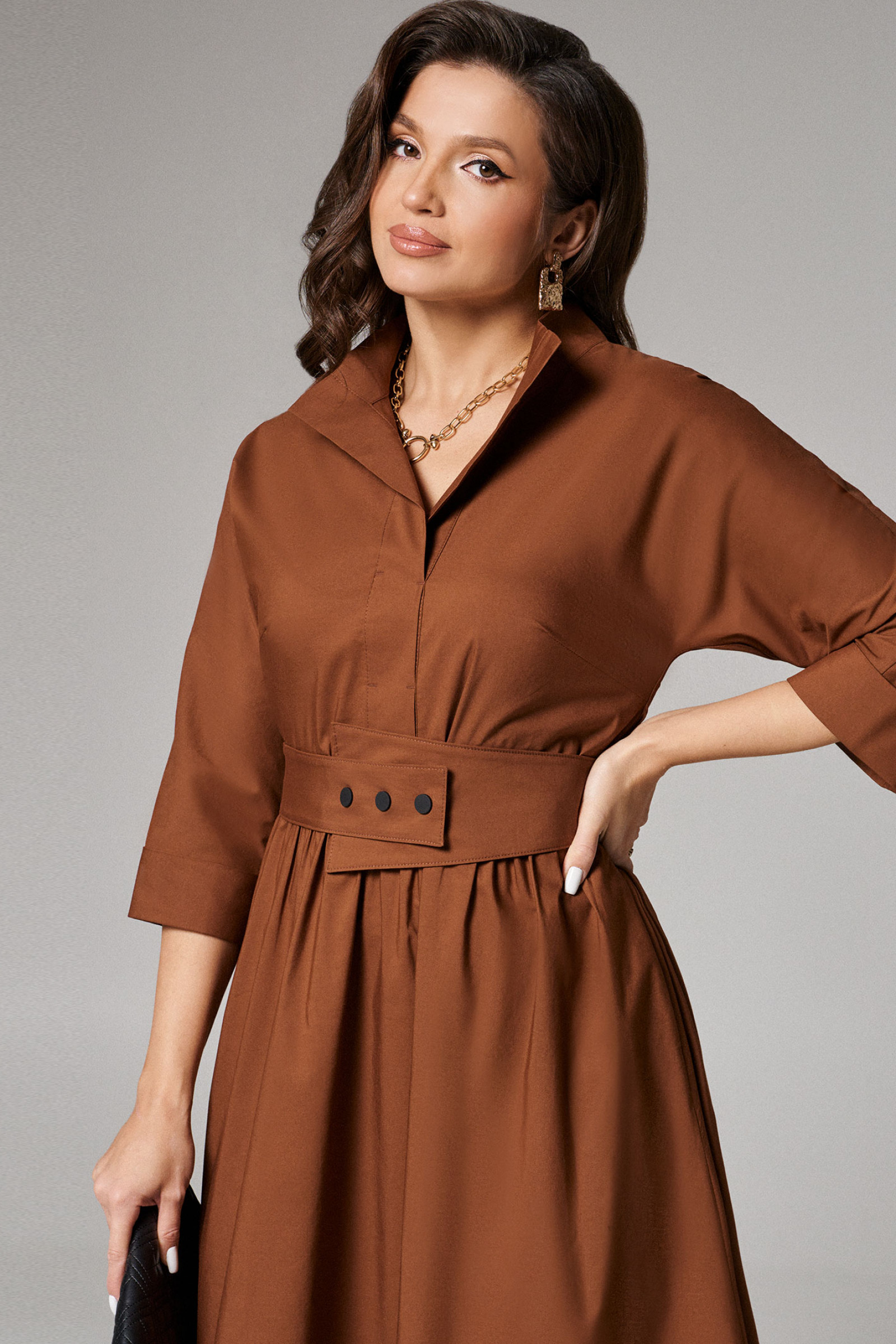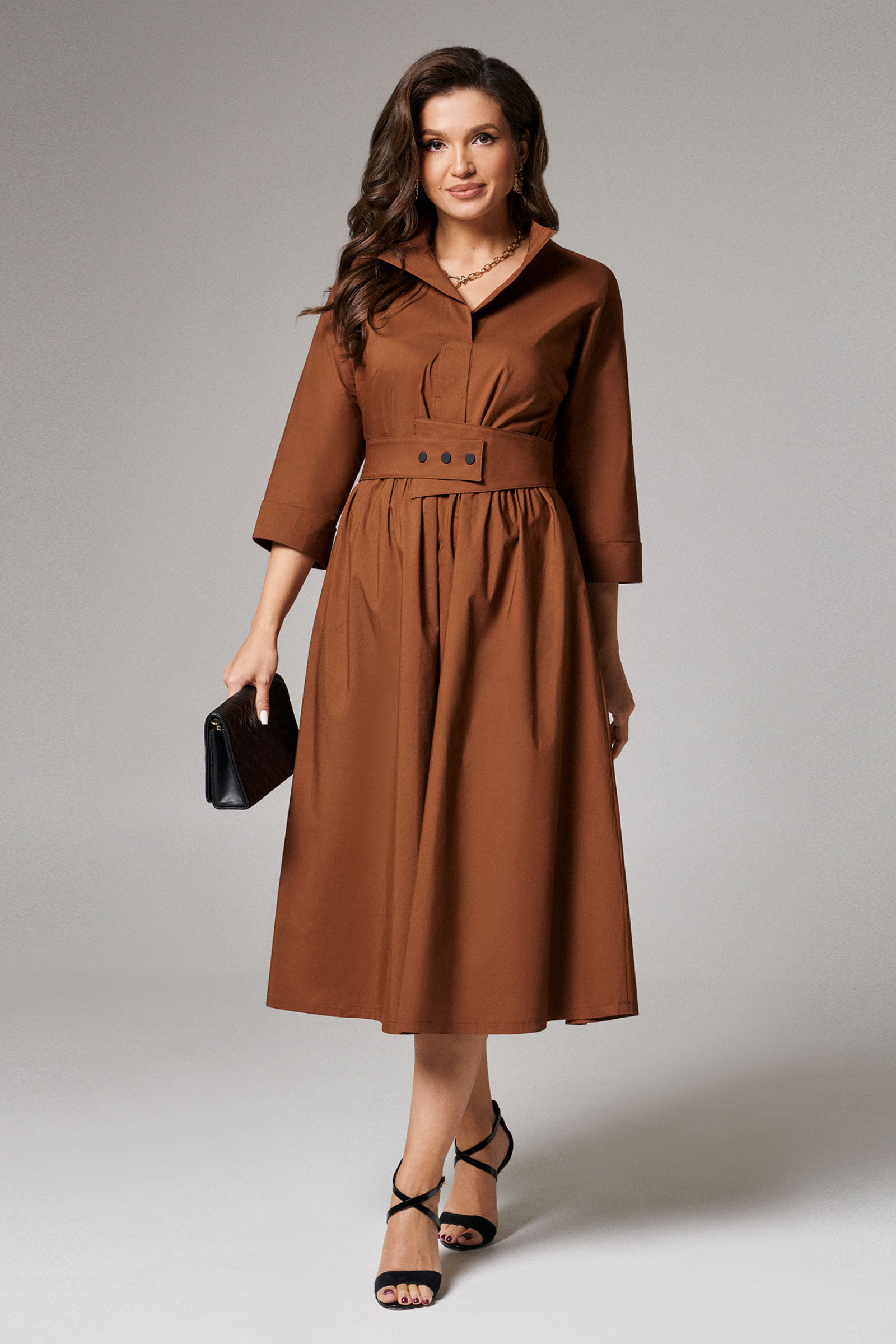Платье женское из хлопковой ткани для повседневной носки. Без подкладки. Платье полуприлегающего силуэта. Длина изделия ниже колена. В боковых швах прорезные карманы. Рукав три четверти с манжетой. Платье укомплектовано поясом из основной ткани изделия.