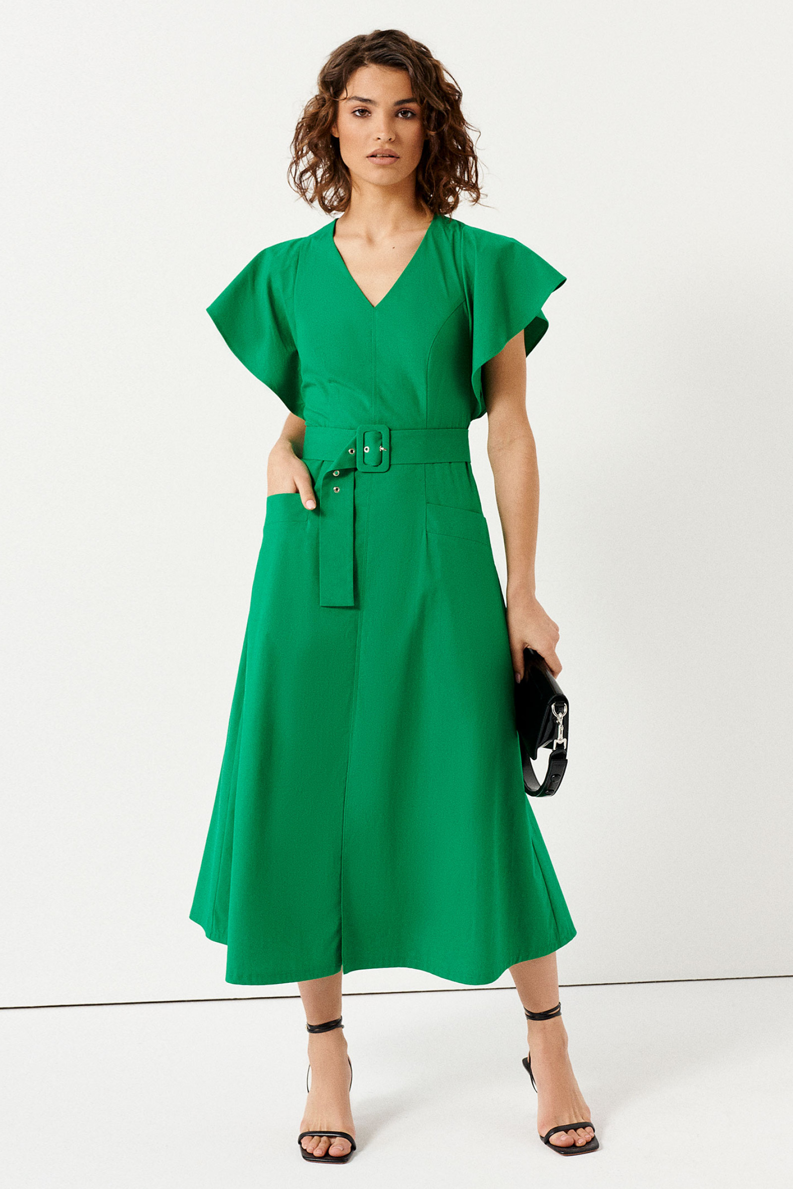 Платье приталенного силуэта с поясом, рельефами по переду и V-образной горловиной. Также на передней части платья два кармана с клапанами, средний шов, заканчивающийся встречной складкой. Спинка со средним швом, в котором находится молния, и двумя талиевыми вытачками. Рукав-объёмная рюша, входящая пройму.