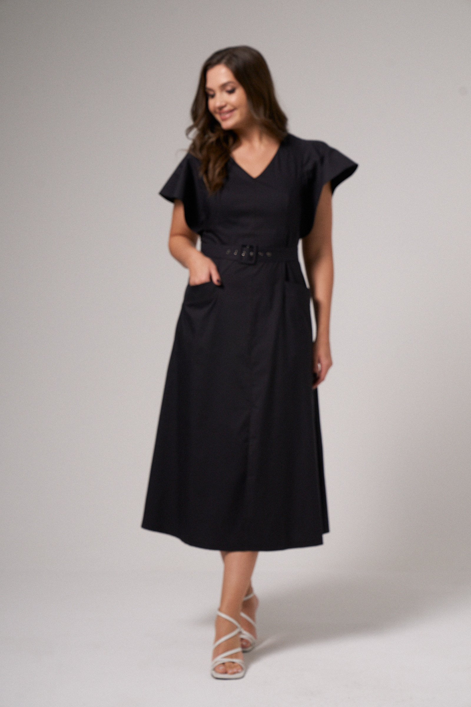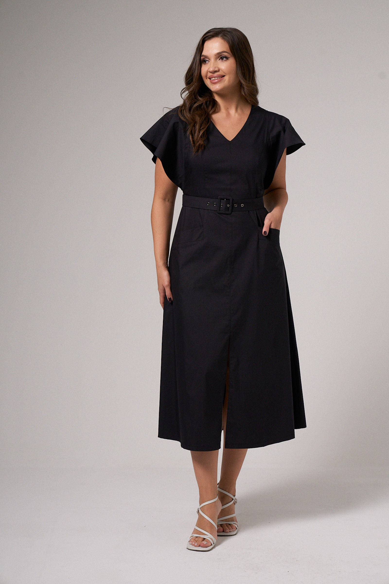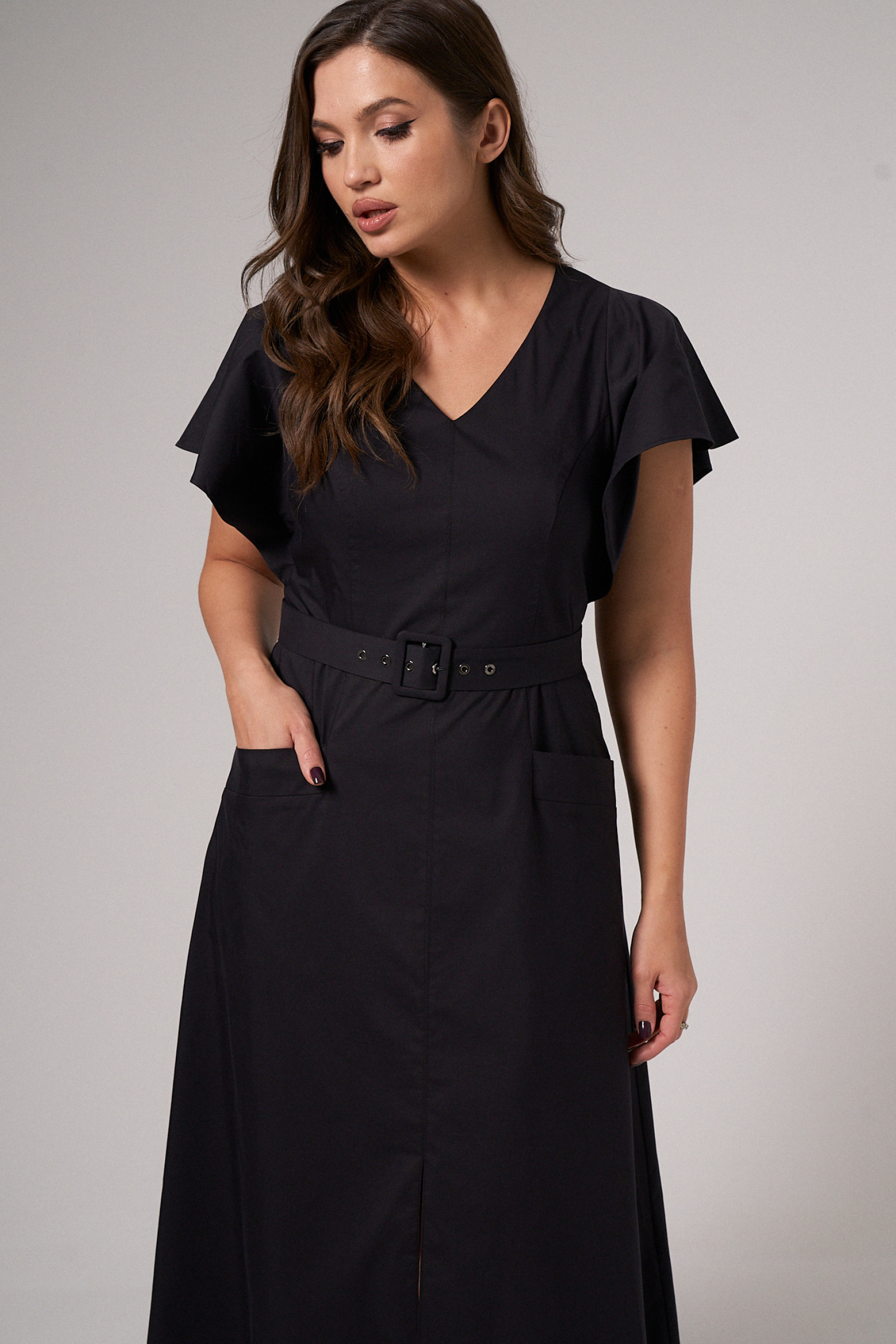 Платье приталенного силуэта с поясом, рельефами по переду и V-образной горловиной. Также на передней части платья два кармана с клапанами, средний шов, заканчивающийся встречной складкой. Спинка со средним швом, в котором находится молния, и двумя талиевыми вытачками. Рукав-объёмная рюша, входящая в пройму.
