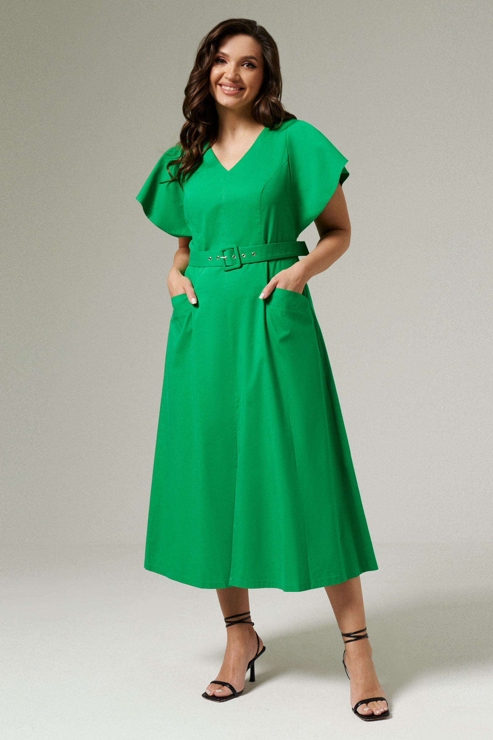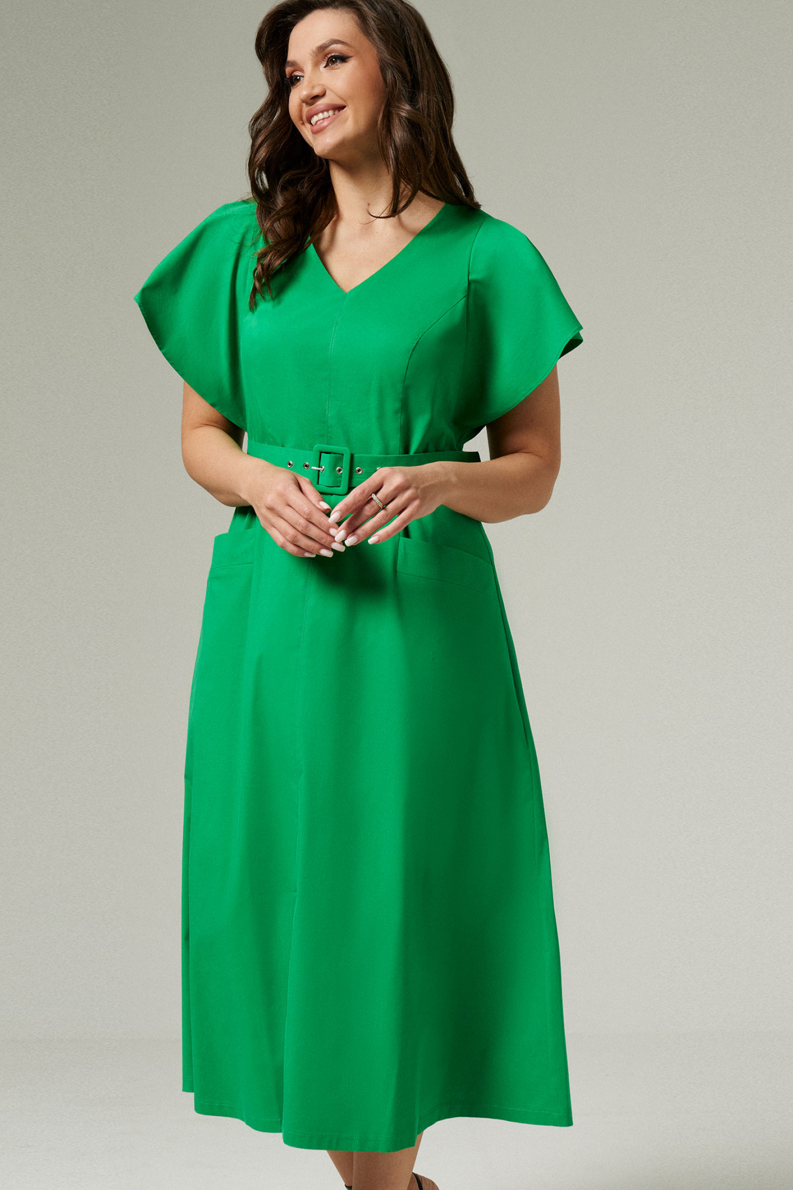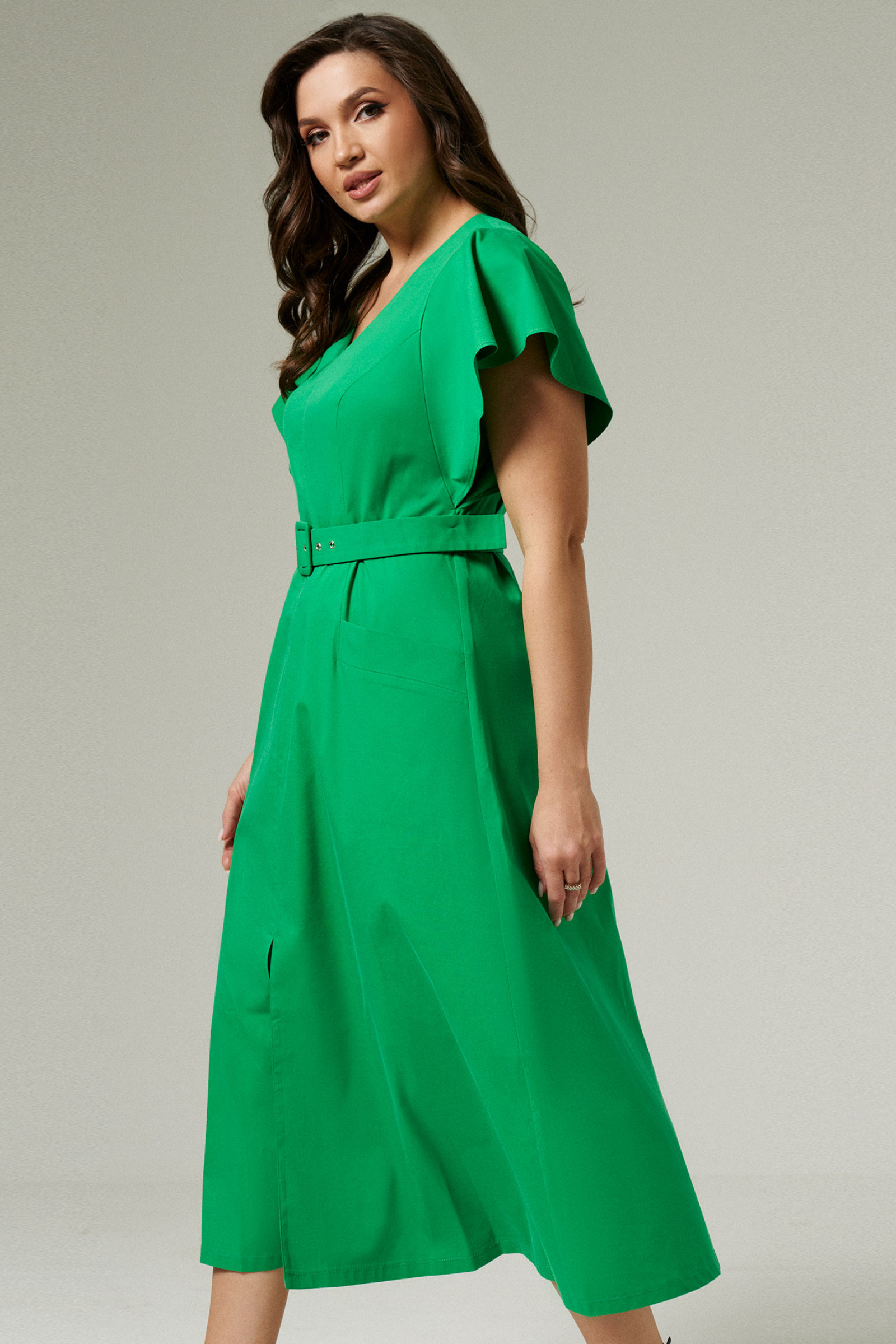 Платье приталенного силуэта с поясом, рельефами по переду и V-образной горловиной. Также на передней части платья два кармана с клапанами, средний шов, заканчивающийся встречной складкой. Спинка со средним швом, в котором находится молния, и двумя талиевыми вытачками. Рукав-объёмная рюша, входящая в пройму.