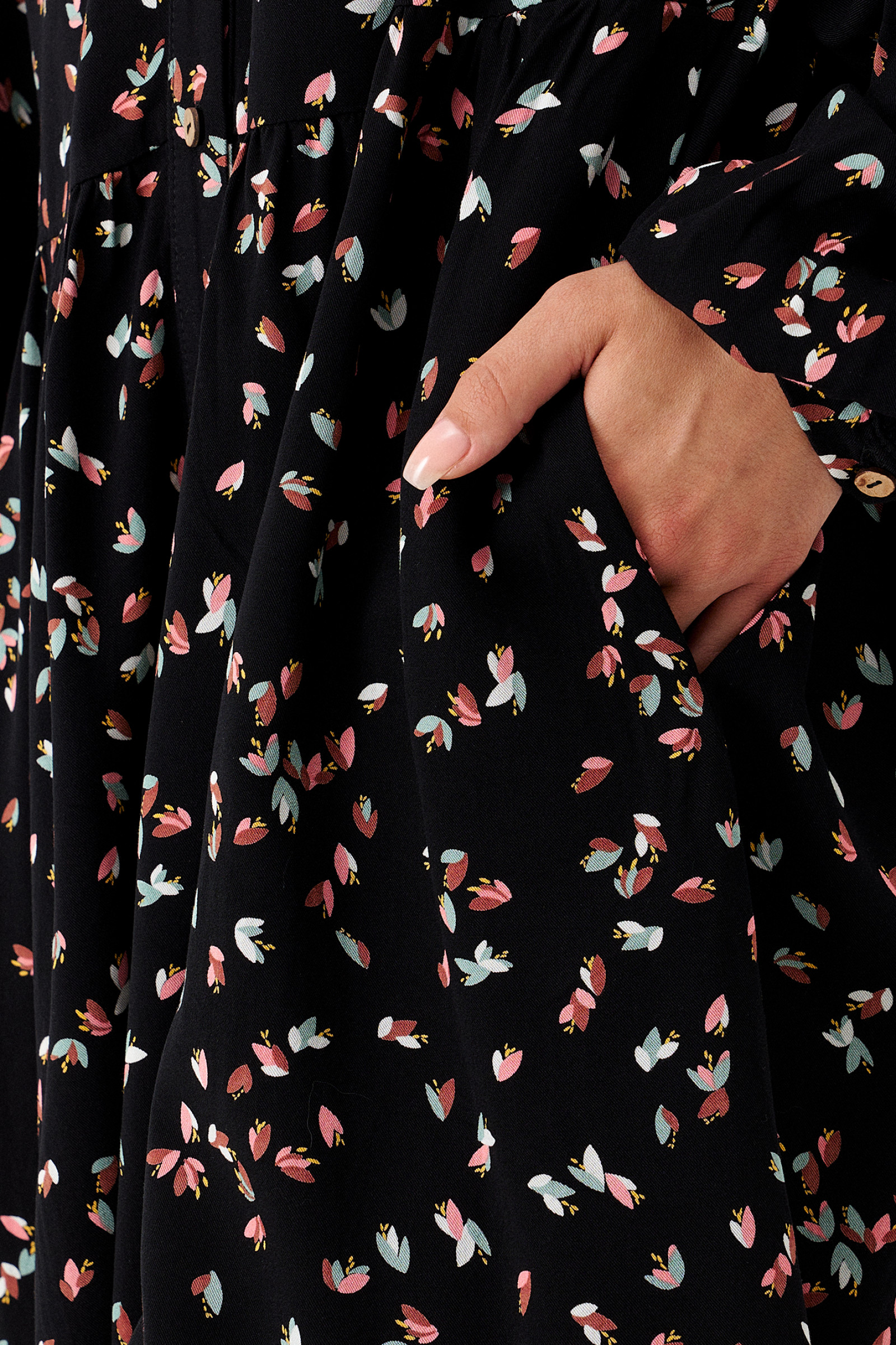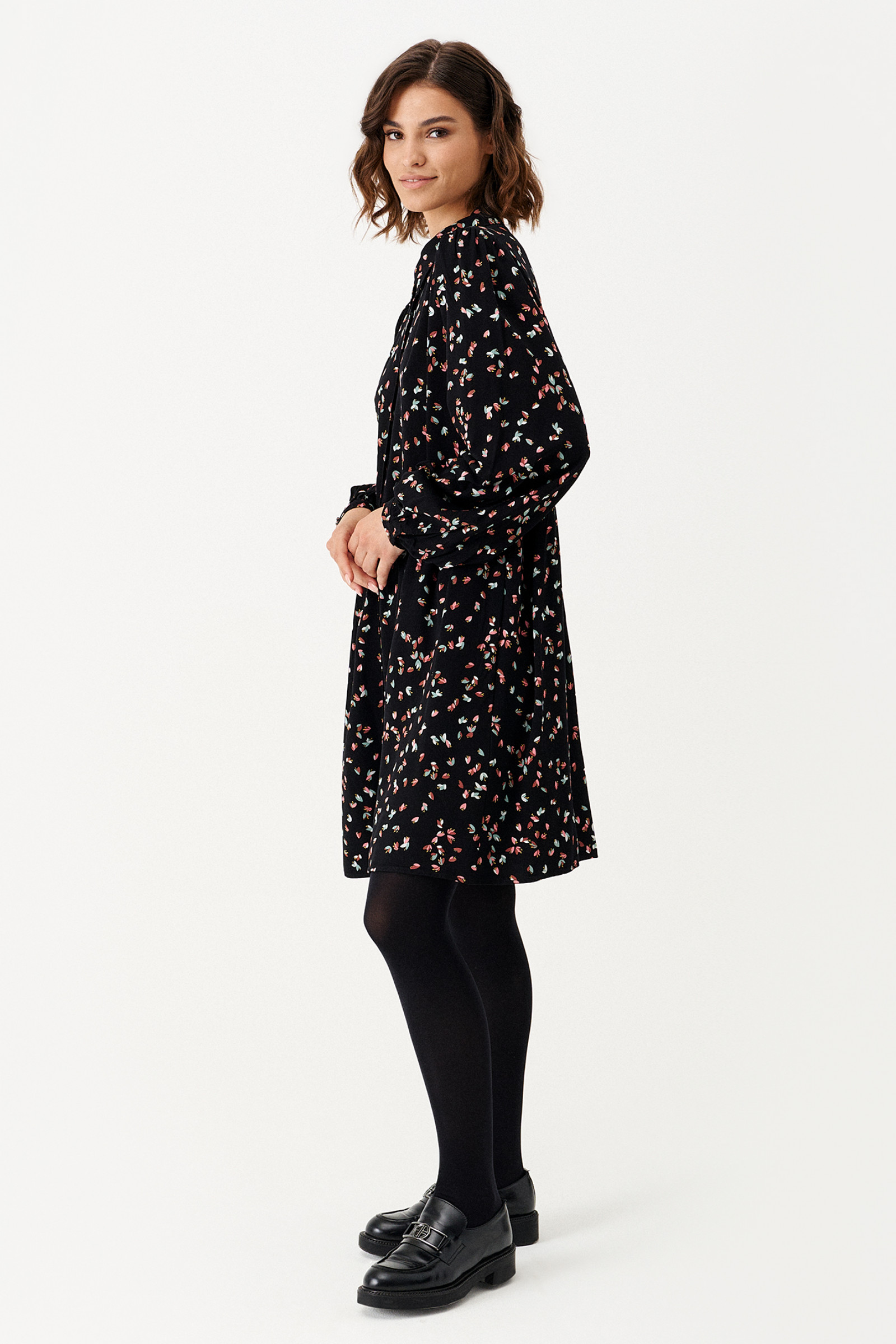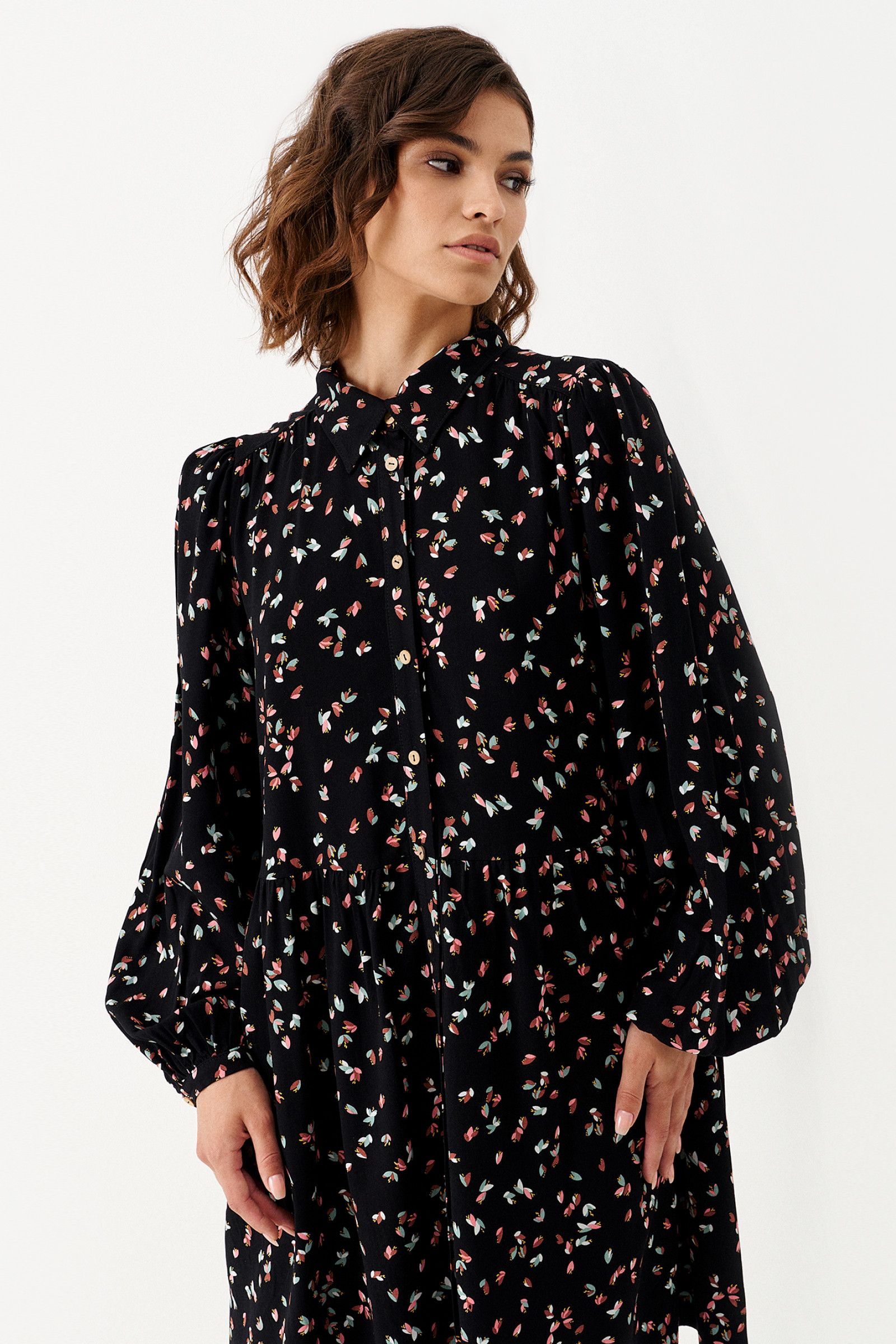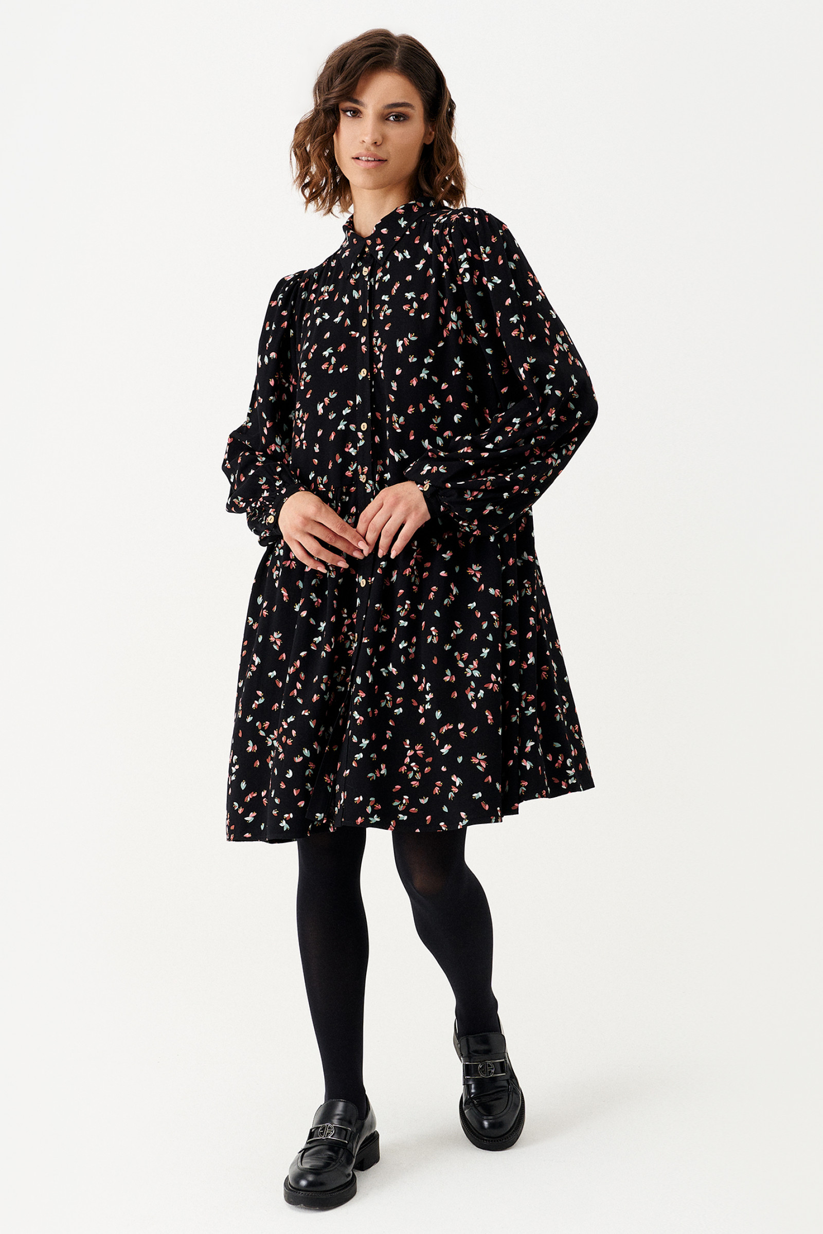 Платье женское из вискозной ткани для повседневной носки. Платье расширенного силуэта с прорезными карманами в боковых швах, Платье отрезное по талии. Воротник-стойка. Застежка фронтальная на пуговицы. Рукава длинные оформлены манжетой. Платье без подкладки.