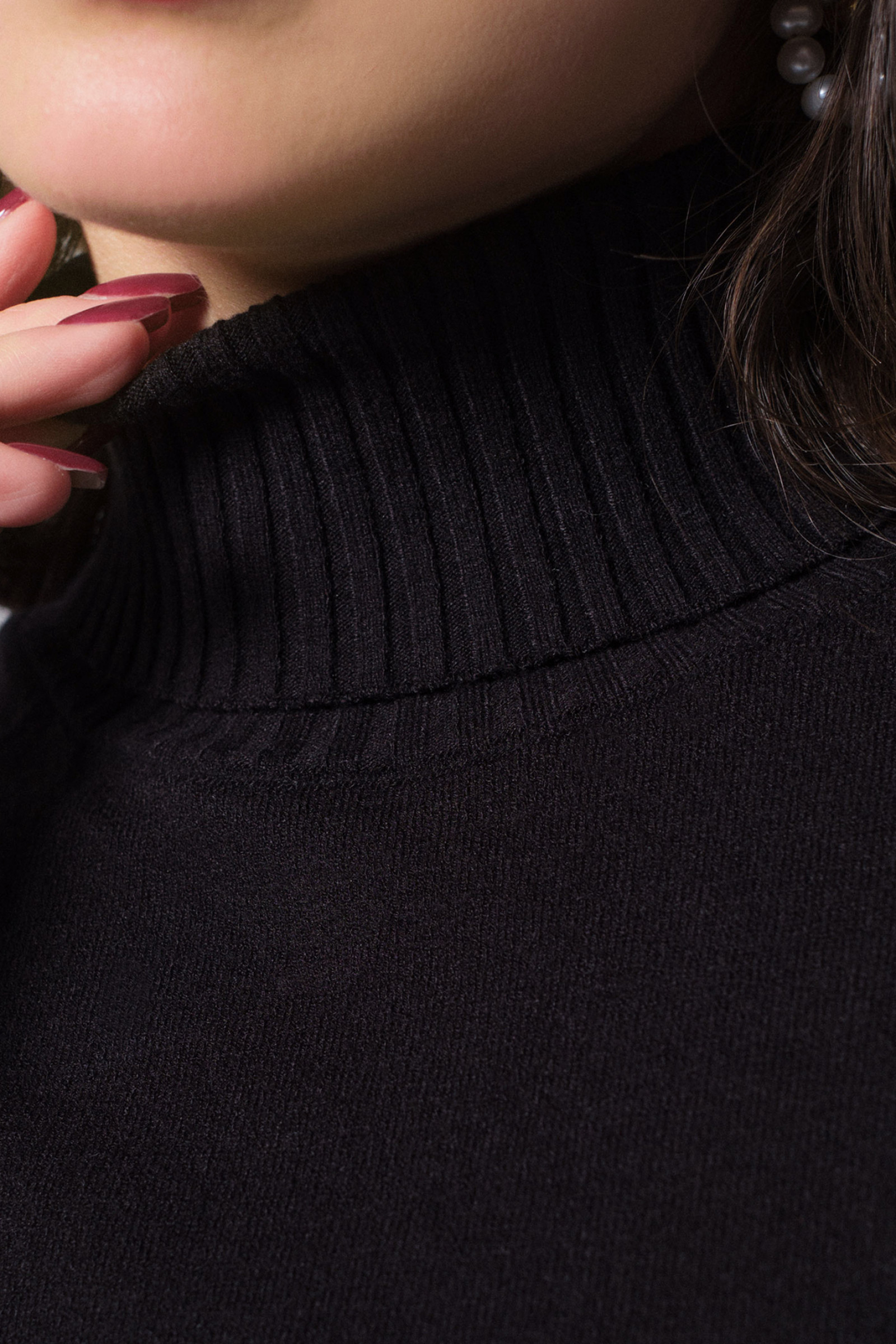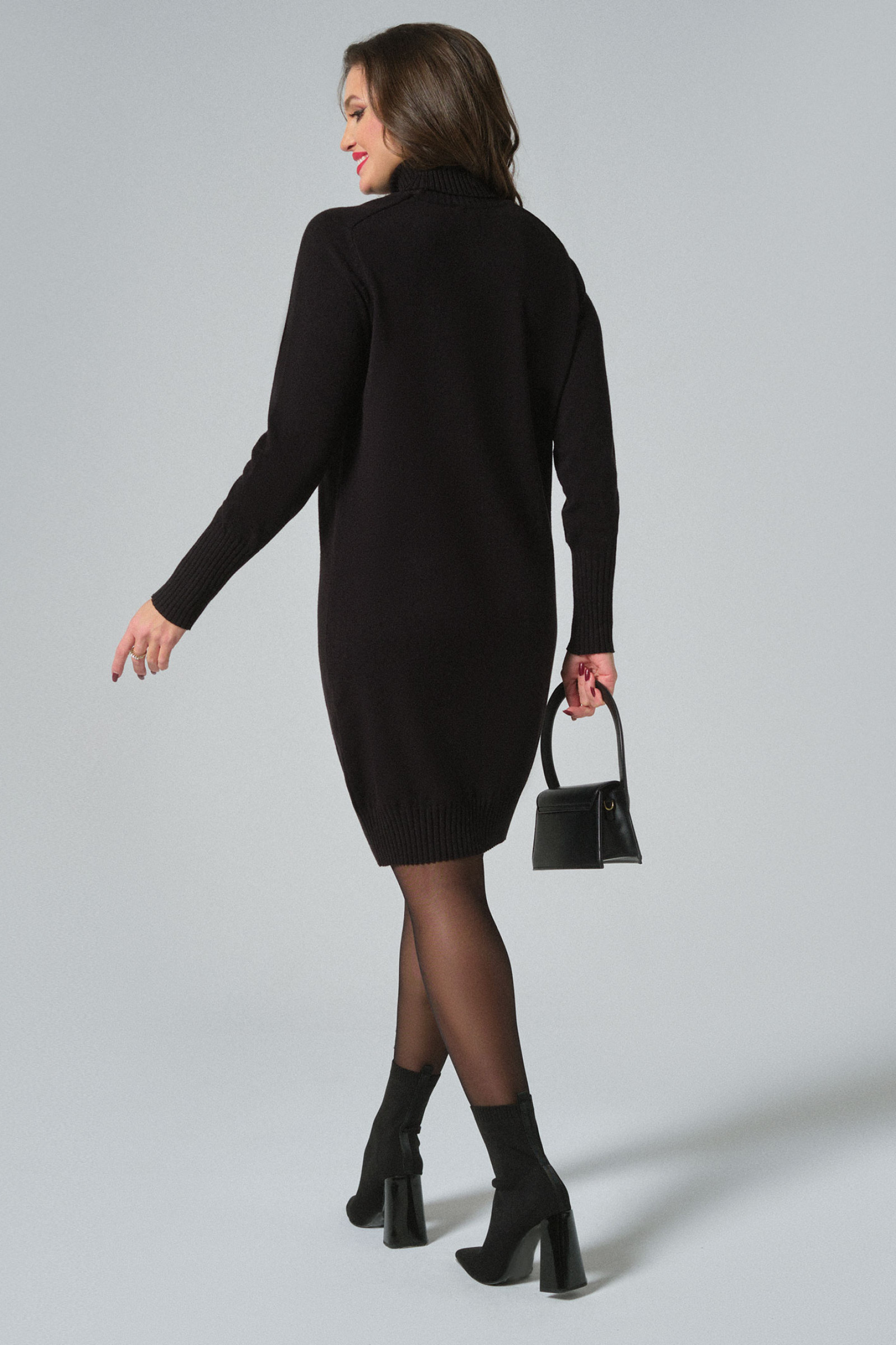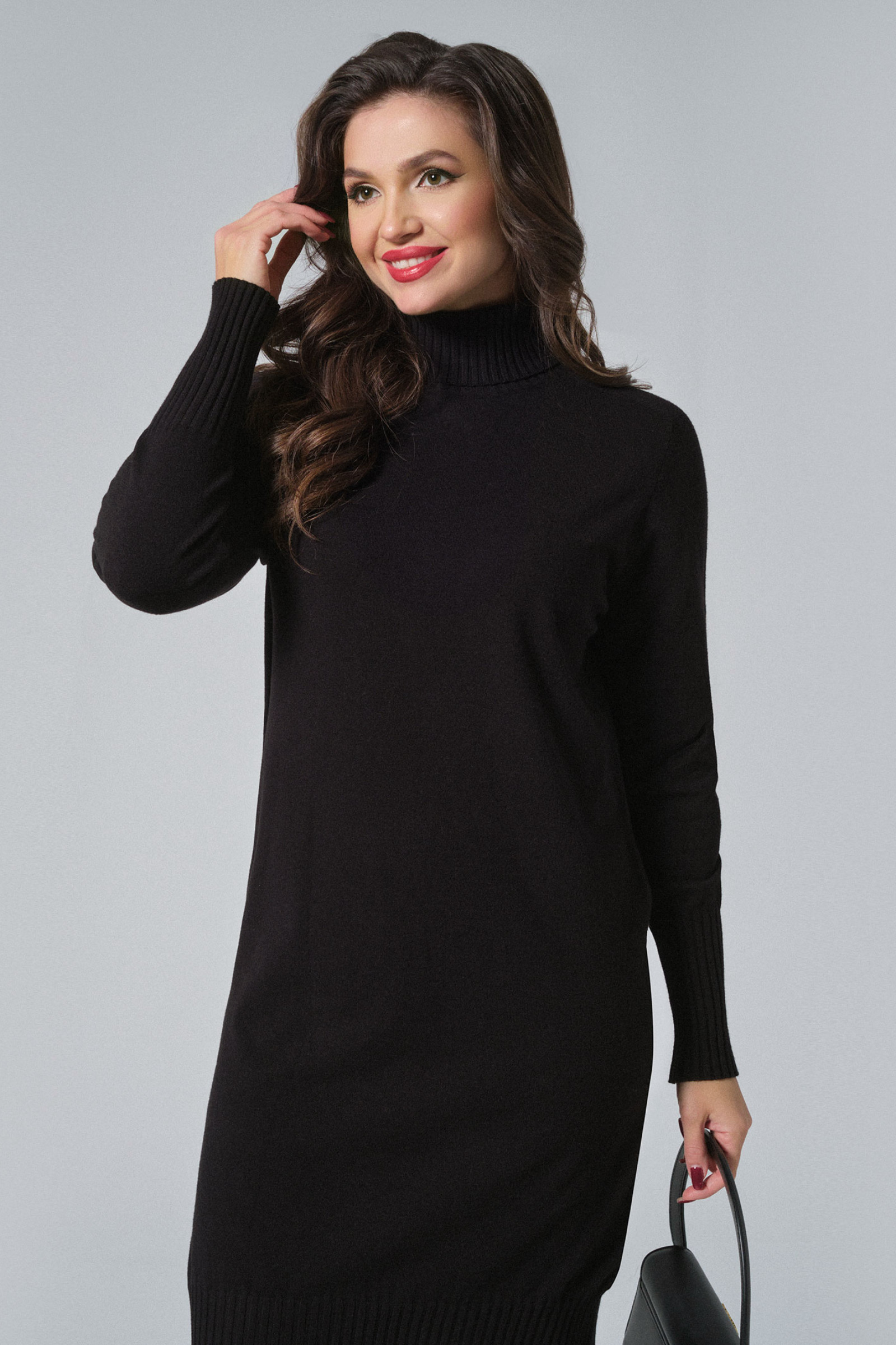 Платье женское машинной вязки из поливискозной пряжи. Платье прямого силуэта. Рукав длинный прямой. Горловина оформлена полустойкой.
