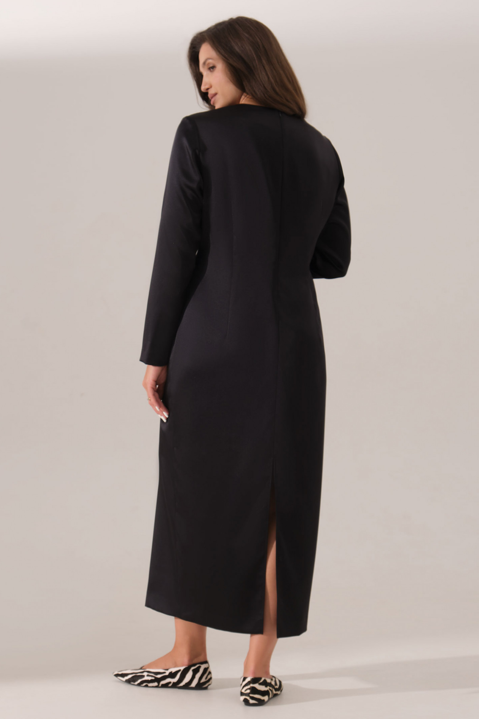 Платье женское из атласной ткани для торжественных мероприятий. Платье полуприлегающего силуэта. Перед имеет две нагрудные вытачки. Спинка со средним швом и застежкой-молнией в шве и небольшим разрезом в шве по низу изделия, а также по спинке располагаются две талиевые вытачки. Горловина V-образная. Рукава втачные длинные. Длина изделия макси. Красивое и стильное платье, которое будет отлично смотреться на любой фигуре.