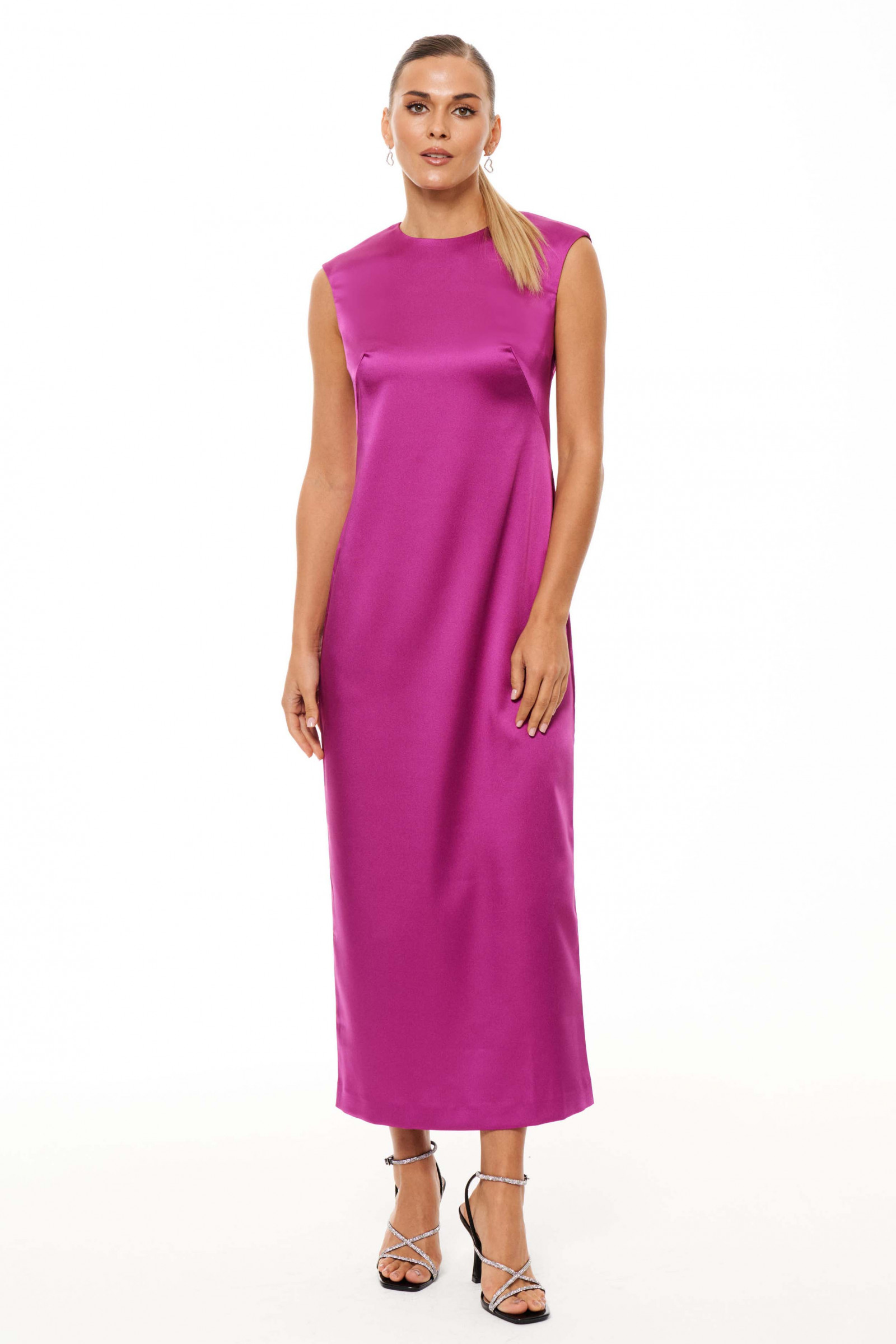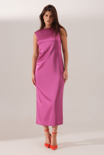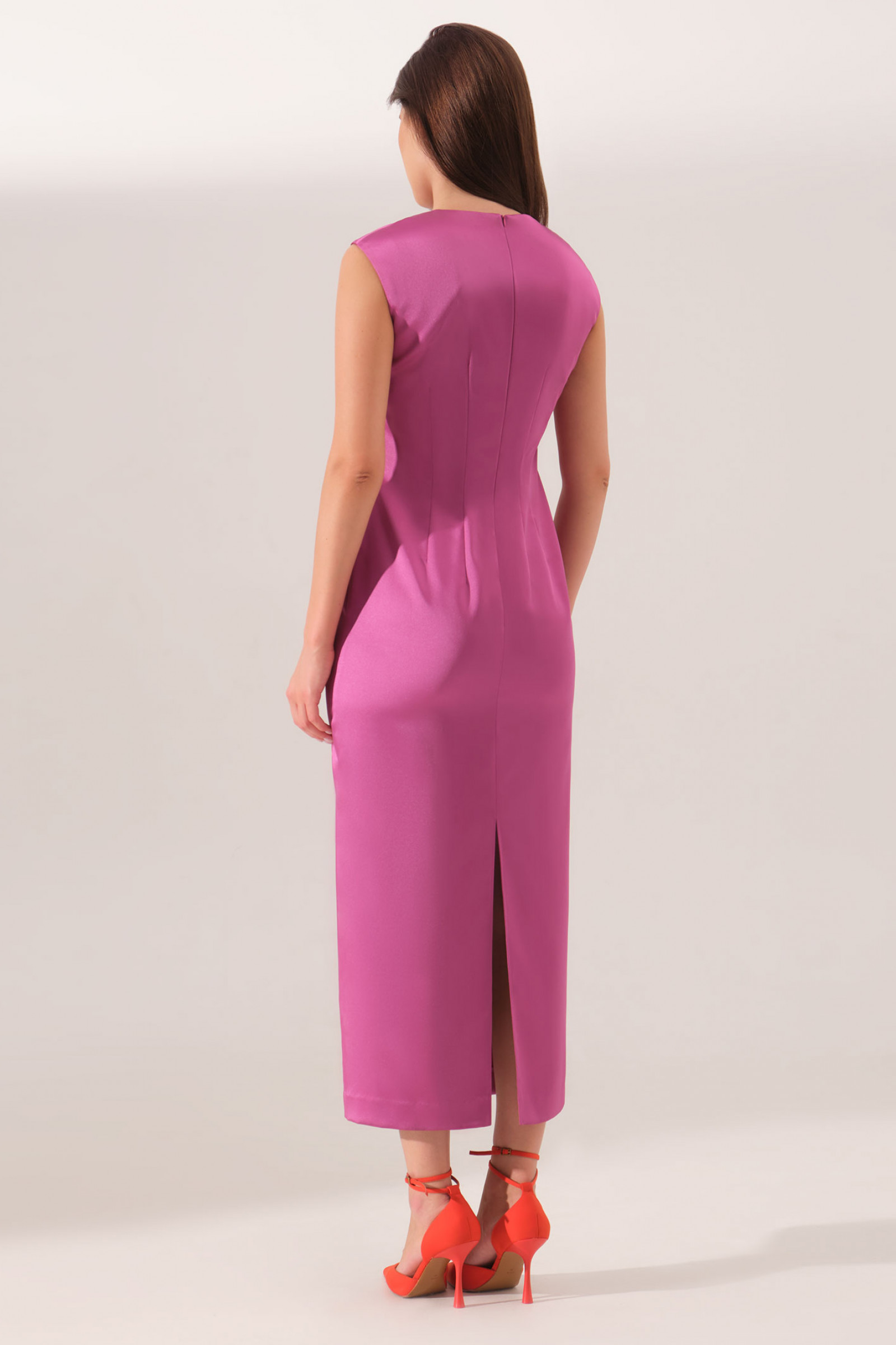 Платье женское атласное полуприлегающего силуэта. Платье подходит как для повседневной носки, так и для праздничных случаев. Перед имеет две нагрудные вытачки. Спинка имеет четыре талиевые вытачки и средний шов с потайной застежкой молнией в шве. В среднем шве по спинке имеет разрез к низу изделия. Горловина чуть заужена. Платье не имеет рукавов. Длина платья миди. Отличный вариант платья для вашего времяпровождения, в нем вы обязательно почувствуете себя уверенней.